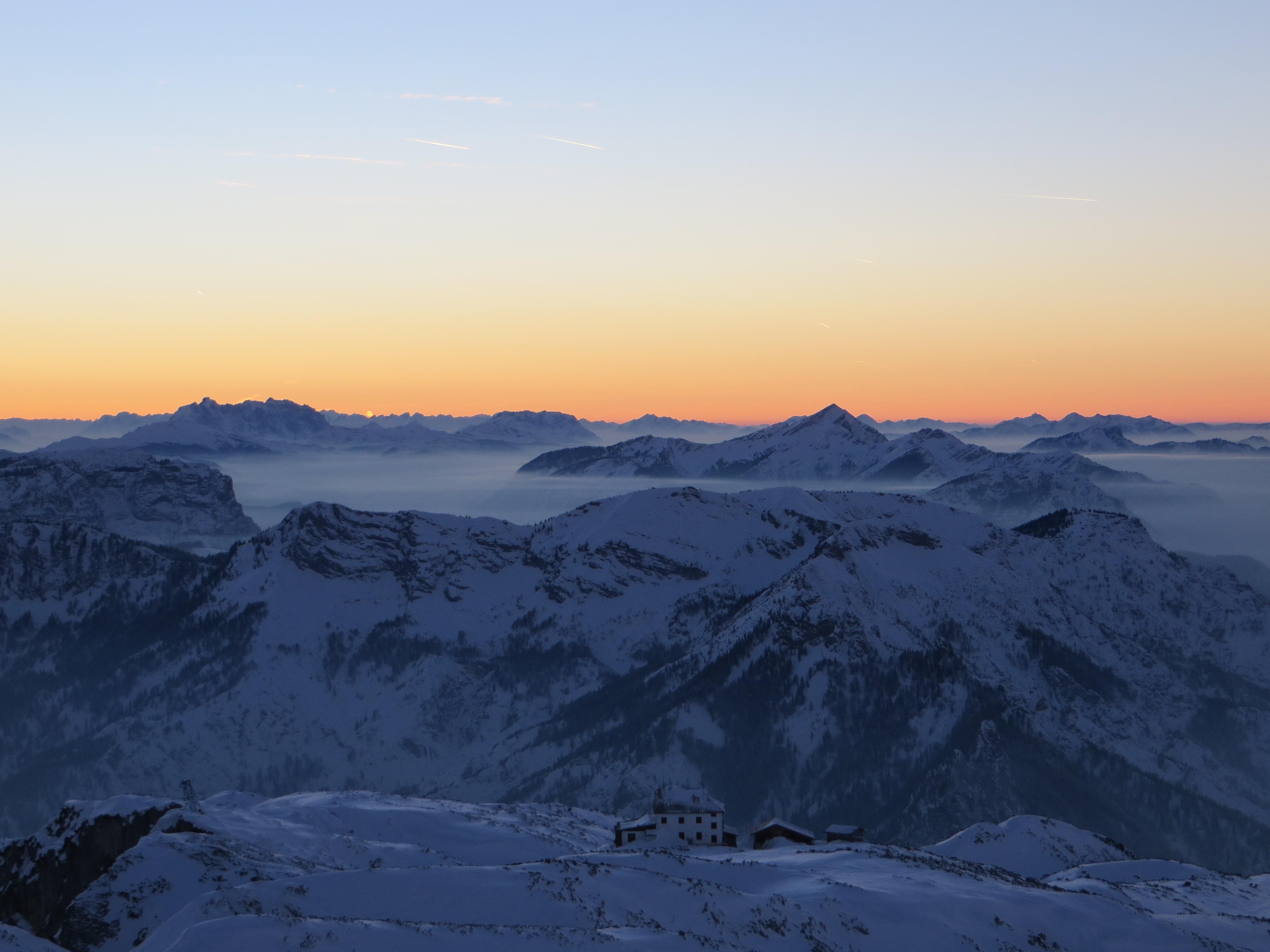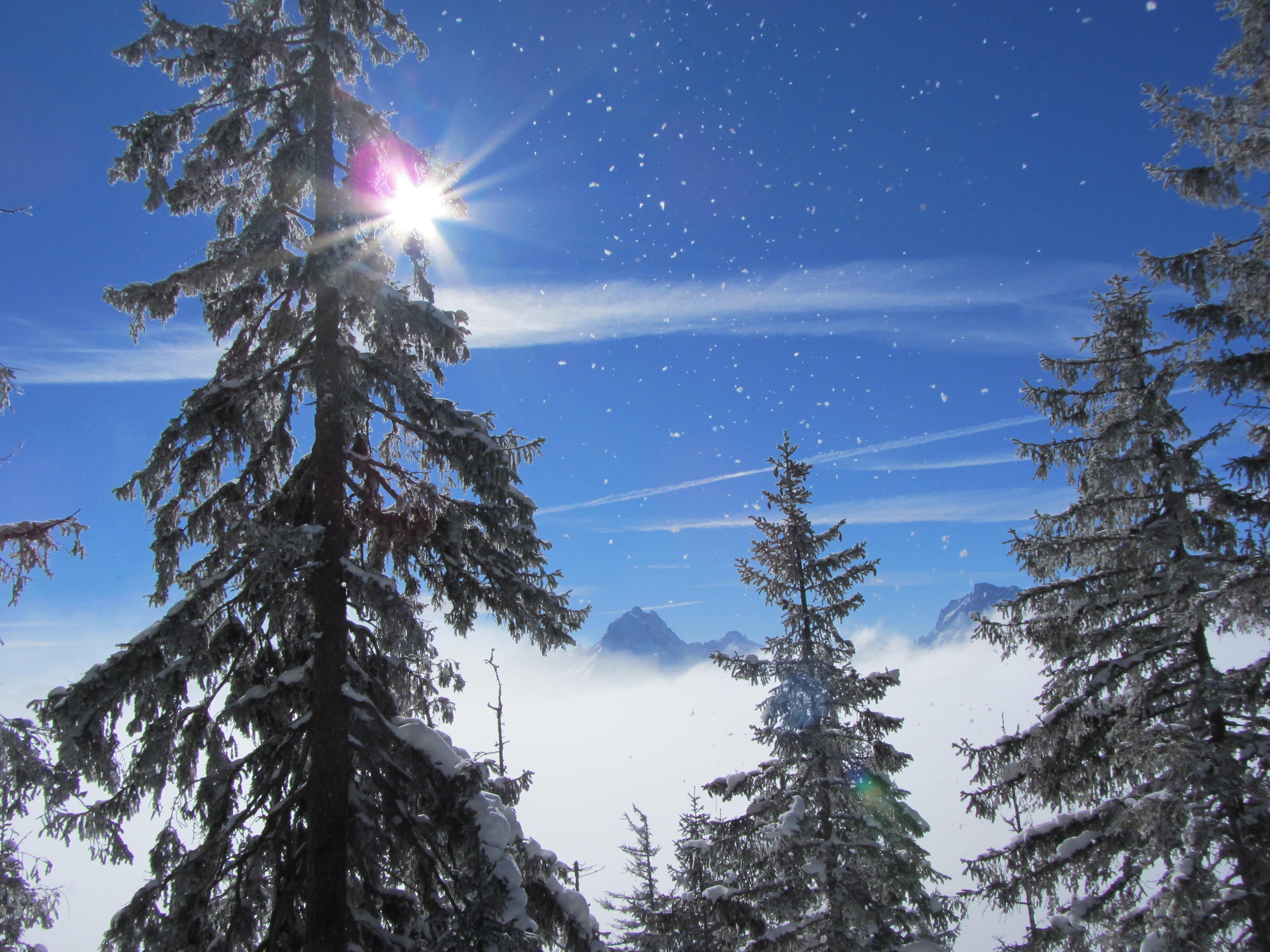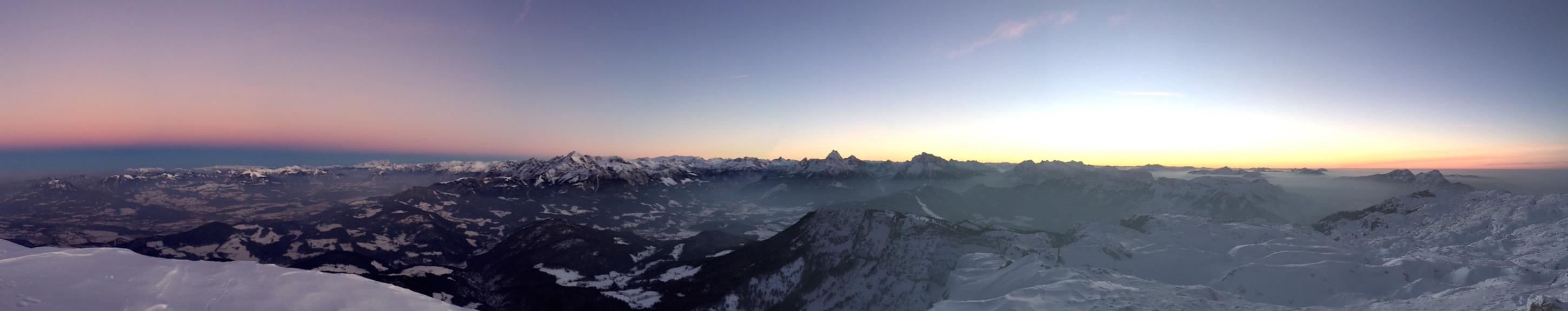 Von Hallthurm über Gamsgericht, Reisenkaser und Stöhrhaus der von Vor-Gehern offenbar mühsam angelegten Schneeschuhspur dem Sommerweg folgend auf den Berchtesgadener Hochthron. Nach dem Start in Wolken dann prächtig-sonniges Wetter bei Temperaturen durchwegs ein paar Grad unter 0 mit bestem Blick in alle Richtungen und wahrhaft phänomenaler Aussicht, der Schnee überall pulvrig und am Plateau oben besonders im Bereich der Latschen eher von geringerer Mächtigkeit. Keine Beobachtungen zu Lawinen oder irgendwelchen Gefahrenzeichen.