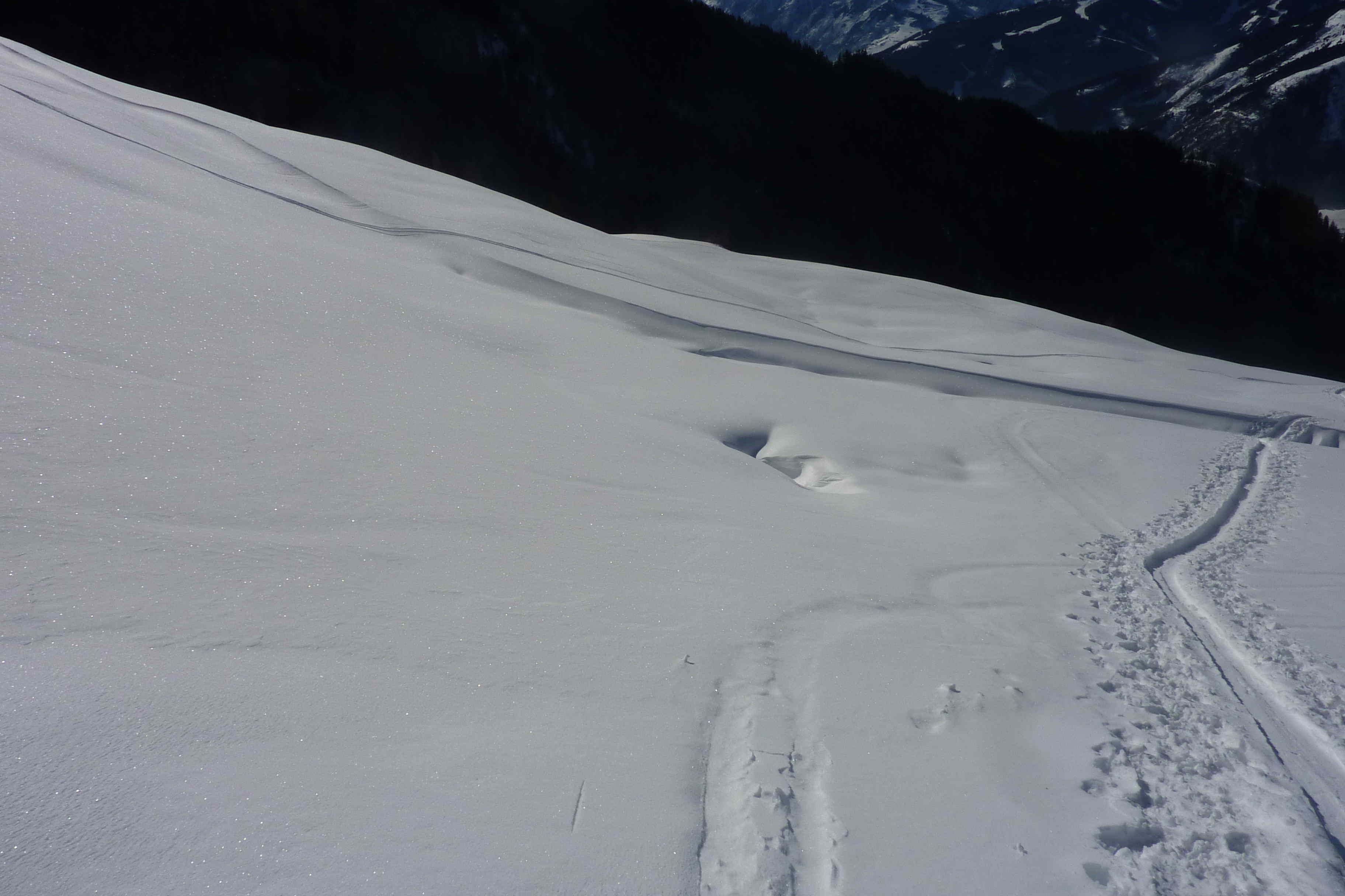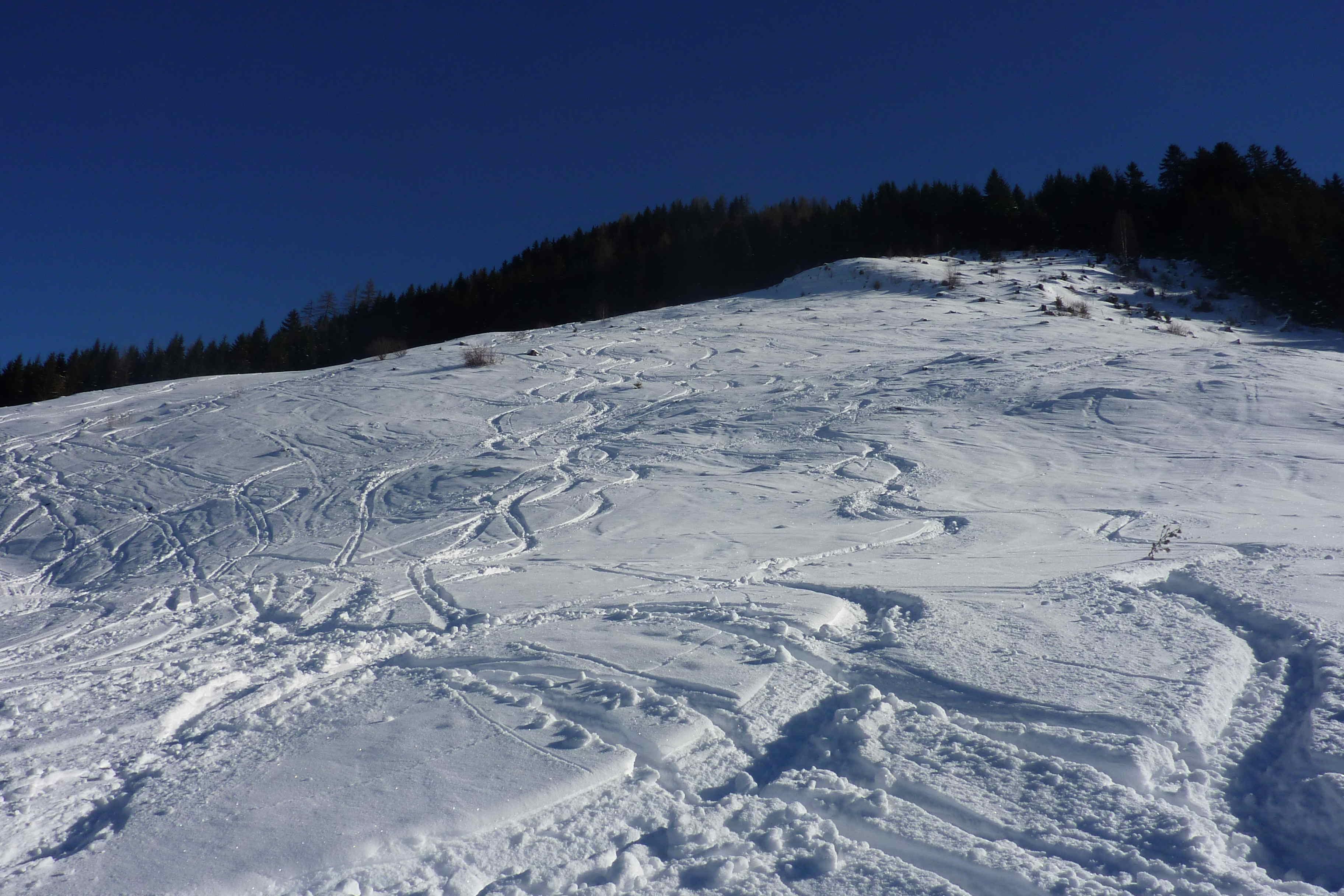 Bei der Abfahrt im obersten Teil (wenig Schnee) schon fast so was wie Firn, die schönen Wiesen waren dann am Nachmittag schon ziemlich klebrig.