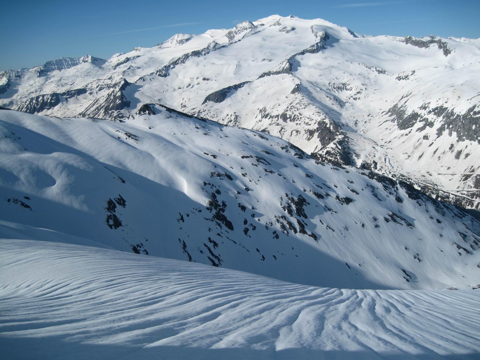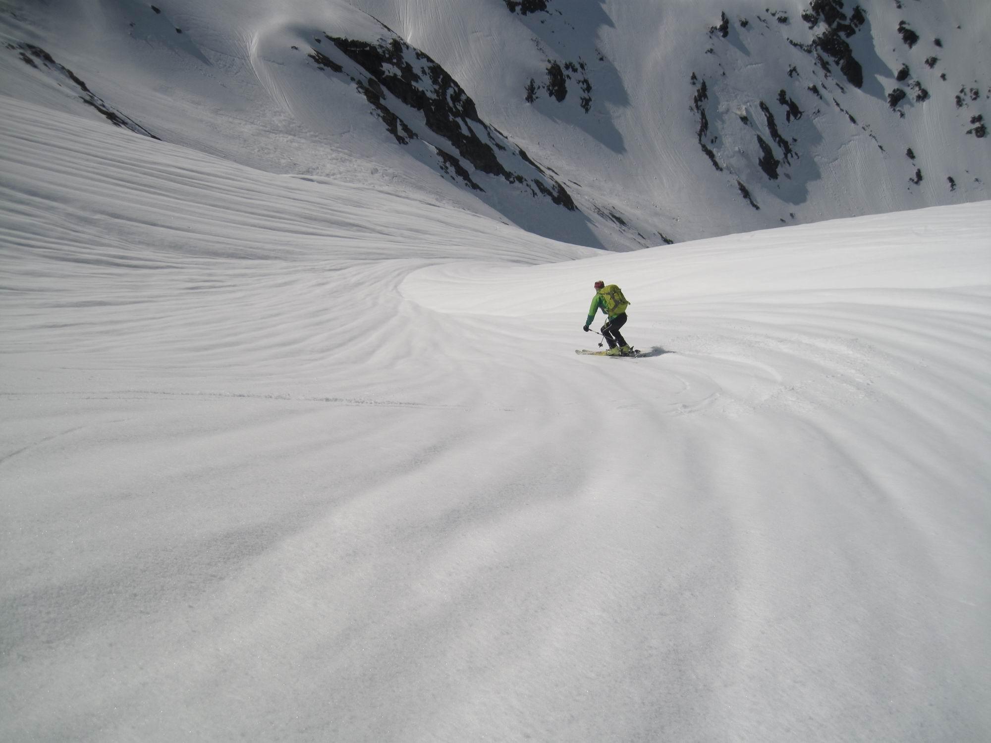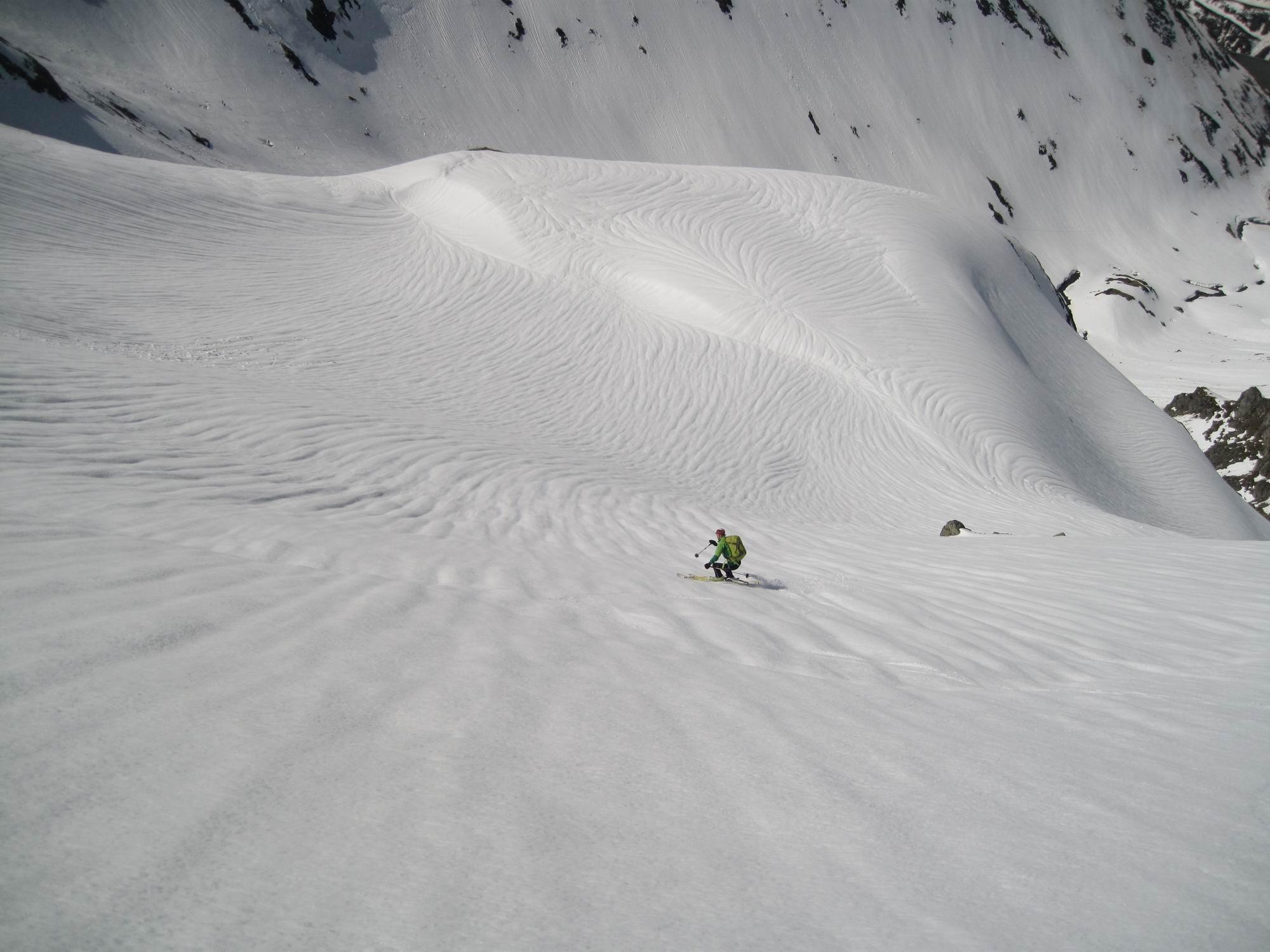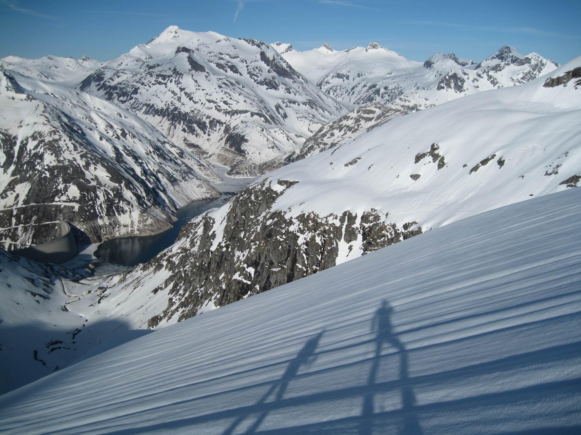 Vom Kölnbreinstüberl folgen wir Albrechts Spuren von gestern bis über die erste Steilstufe. Von hier steigen wir dann in nordwestlicher Richtung bis in ein Törl zwischen Kaltwandspitze und Weinschnabel und weiter zum Gipfel. Beim Aufstieg harte aber griffige Schneedecke, übersät mit jeder Menge Setzungsrillen, die jedoch den Abfahrtsgenuß bei bestem Firn kaum schmälerten. Da die oft super zu fahrende markante Rinne die vom Törl herunterzieht im unteren Teil von Lawinen ziemlich gezeichnet war, entschieden wir uns für die Variante direkt rechts neben den Begrenzungsfelsen der Rinne. Diese wunderschönen und auch teilweise steilen Hänge waren heute perfekt zu fahren.