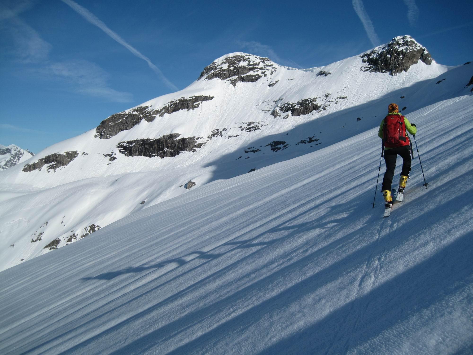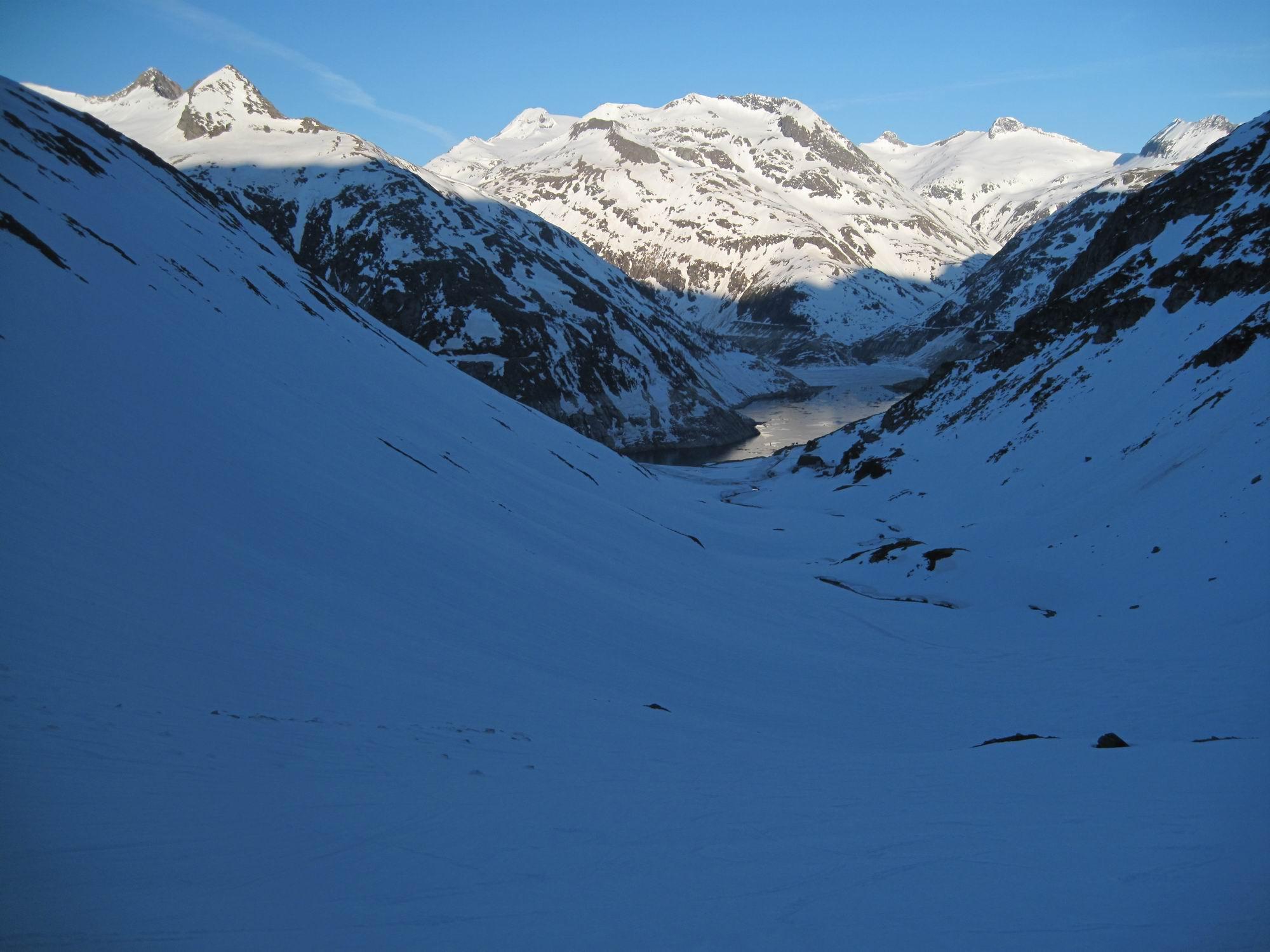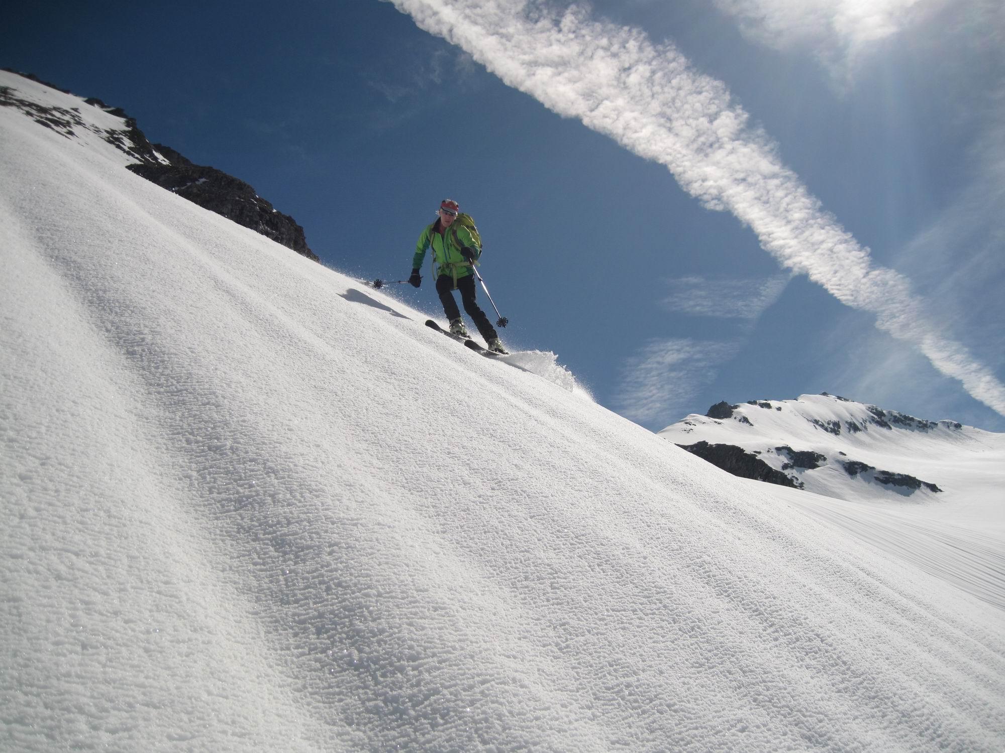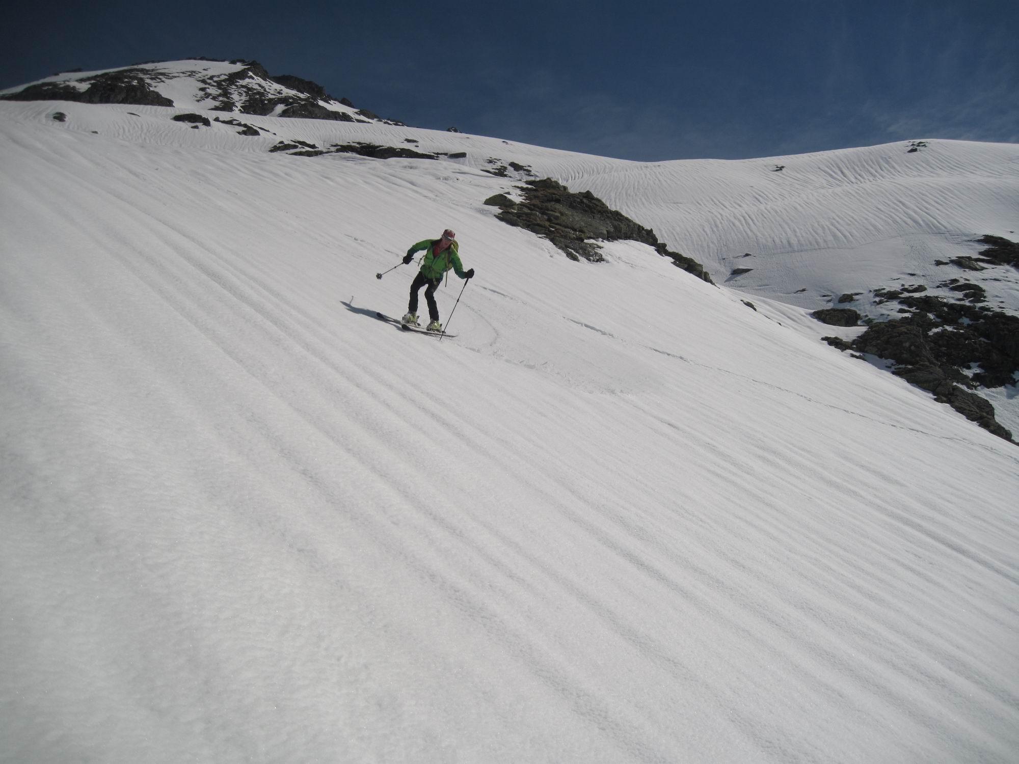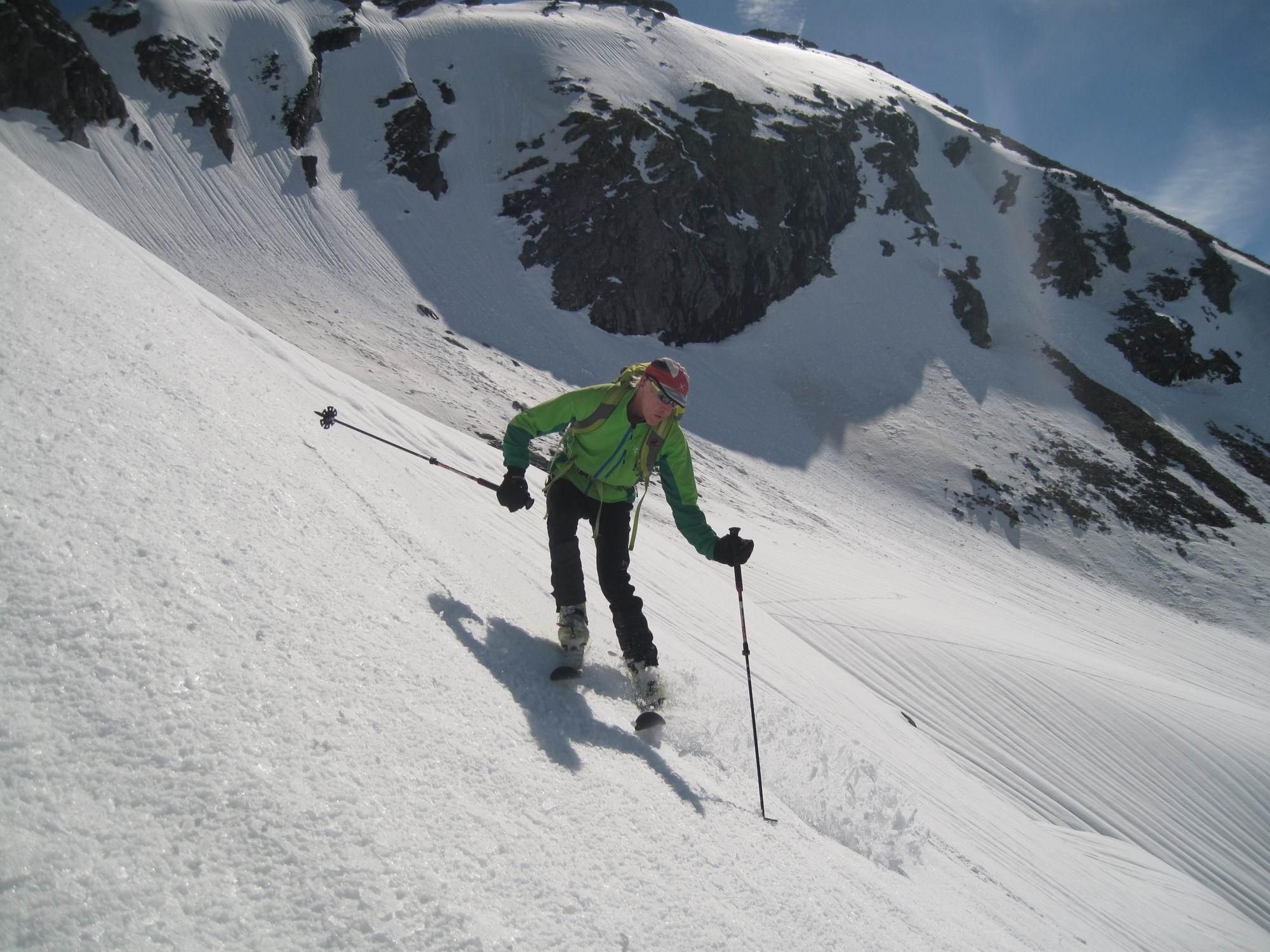 Vom Kölnbreinstüberl folgen wir Albrechts Spuren von gestern bis über die erste Steilstufe. Von hier steigen wir dann in nordwestlicher Richtung bis in ein Törl zwischen Kaltwandspitze und Weinschnabel und weiter zum Gipfel. Beim Aufstieg harte aber griffige Schneedecke, übersät mit jeder Menge Setzungsrillen, die jedoch den Abfahrtsgenuß bei bestem Firn kaum schmälerten. Da die oft super zu fahrende markante Rinne die vom Törl herunterzieht im unteren Teil von Lawinen ziemlich gezeichnet war, entschieden wir uns für die Variante direkt rechts neben den Begrenzungsfelsen der Rinne. Diese wunderschönen und auch teilweise steilen Hänge waren heute perfekt zu fahren.