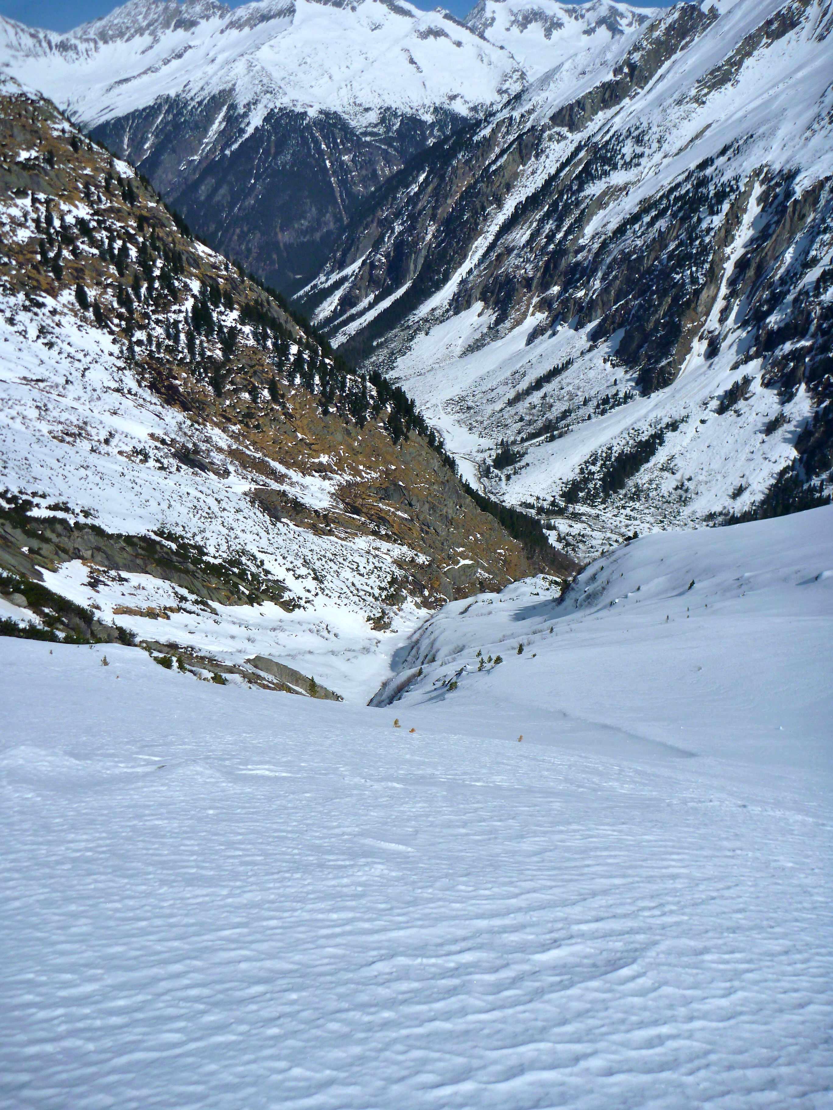 Schnee: unten beim Anstieg im Schatten hart, dann in der Sonne durchfeuchteter Pulver, Windeinfluss erkennbar aber irrelevant, da weich, bei der Abfahrt gschmeidig, im Schatten super, unterhalb 1800m nass und bremsend