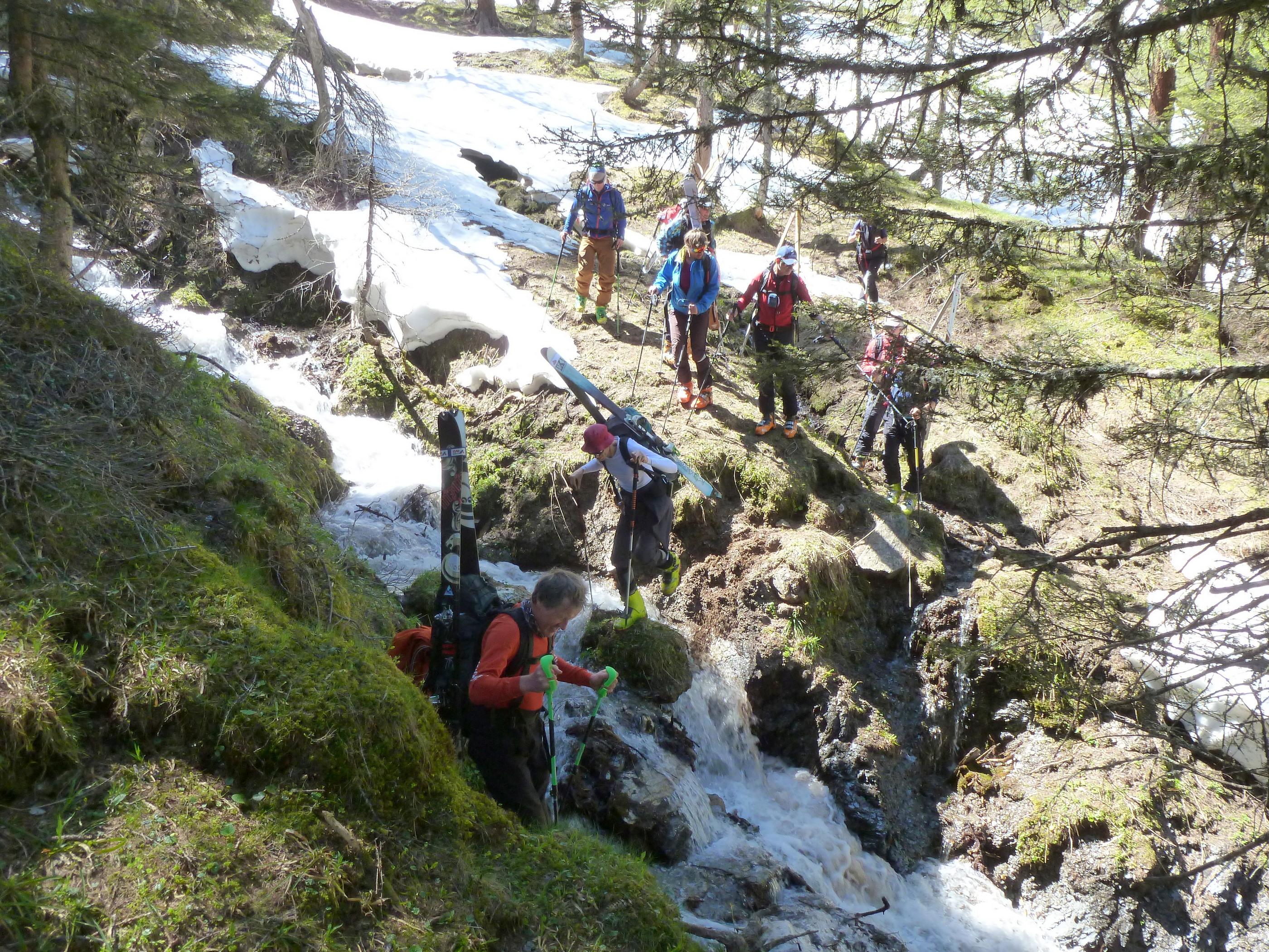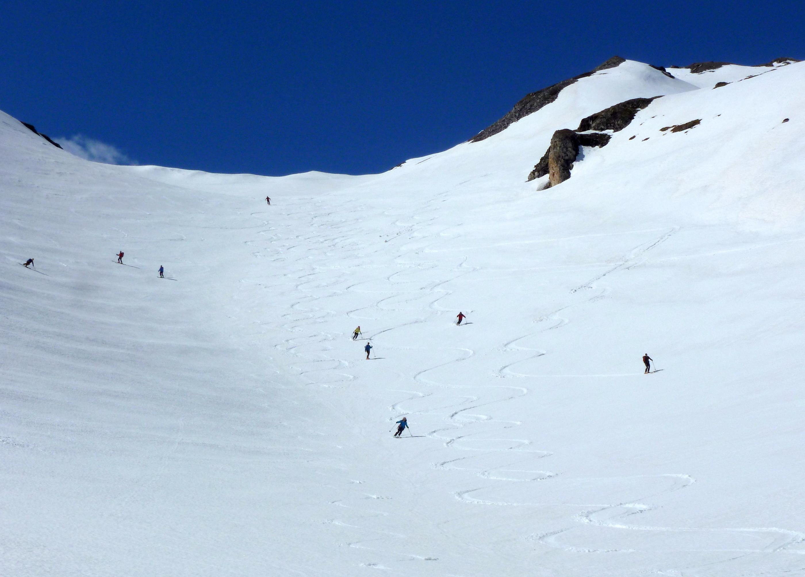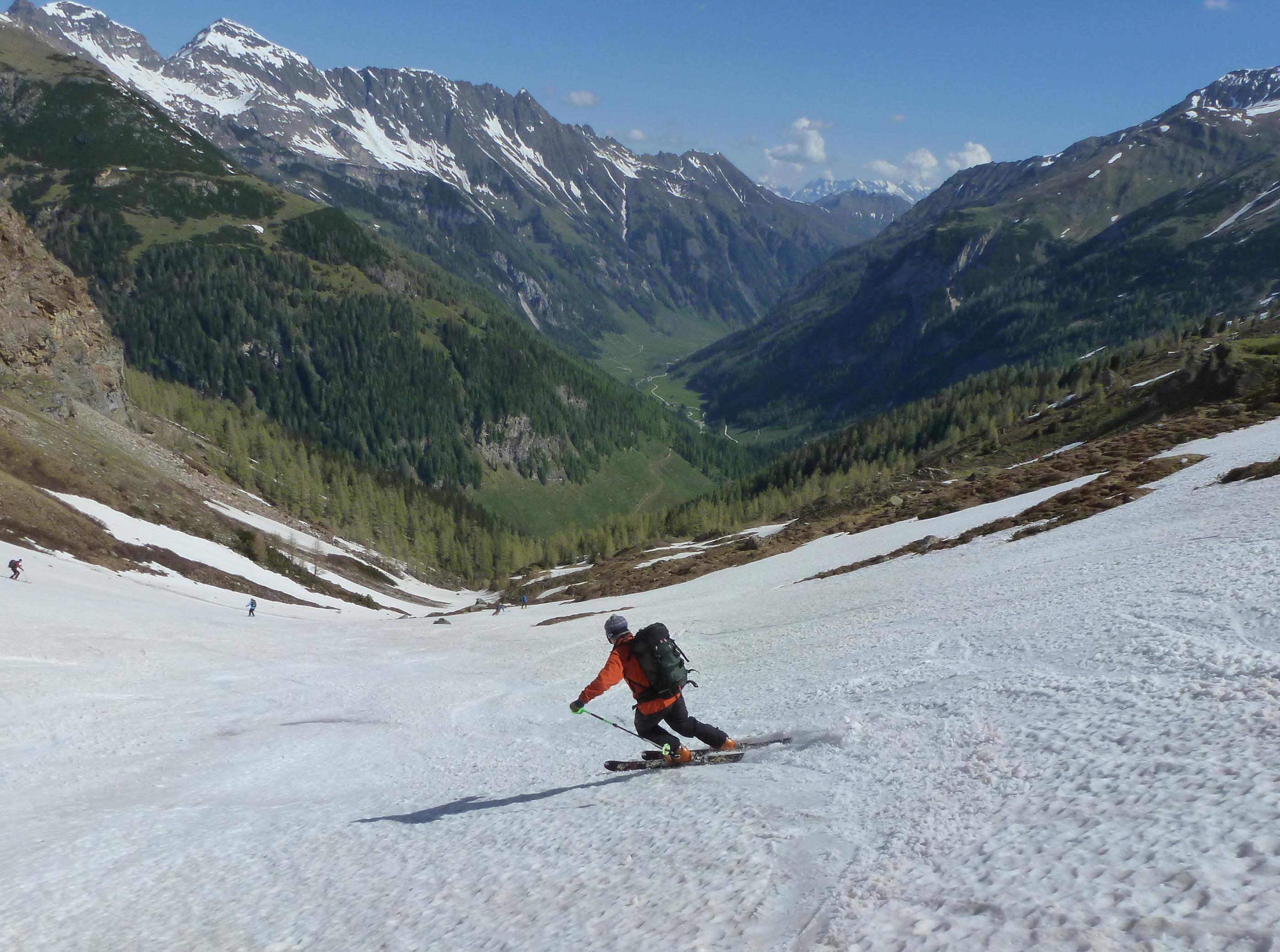 Vom Hochtor bei kräftigem Wind aus SW und teilweise massiven Wolkenbänken, die uns am Weg zur Weißenbachscharte vorübergehend einmal völlig die Sicht nehmen, nach Osten. Nach einem kurzen, nicht ganz geplanten Abstecher bei der Rossscharte dann bei immer freier werdender Sicht in die Weißenbachscharte und im großen Bogen zum Gipfelhang, wo der kompakte Harsch von der Sonne bereits aufgeweicht ist. In der Abfahrt queren wir wieder im Schuss weit zurück nach Westen, um möglichst hoch in die Weißenbachrinne einfahren zu können, da die begrenzenden Rücken wie viele andere exponierte Geländeteile schon stärker ausapern. In dieser gigantischen Natur-Halfpipe treffen wir heute von oben bis unten ideale Bedingungen an. Ohne Unterbrechung geht´s bis zum traditionellen Schlusspunkt, einem markanten Felsblock, wo unterm Lawinenschnee bereits ein mächtiger Schmelzbach herausrauscht. Eine aus dem felsigen Steilgelände westlich des Grabens abgegangene Grundlawine ermöglicht ein Stück weiter unten derzeit noch eine völlig problemlose Bachquerung. Der weitere Abstieg zum Rauriser Tauernhaus wie immer ein wunderbarer Gang durch die Jahreszeiten - von den Soldanellen und Krokussen bei den letzten Schneeflecken bis zu den bereits saftigen Almwiesen im Seidlwinkeltal. (Zum Saison-Ausklang - und weil´s so schön war - heut´ ein paar Bilder mehr! Die Blumen vor allem auch als Dankeschön an das lawine.salzburg-Team!)