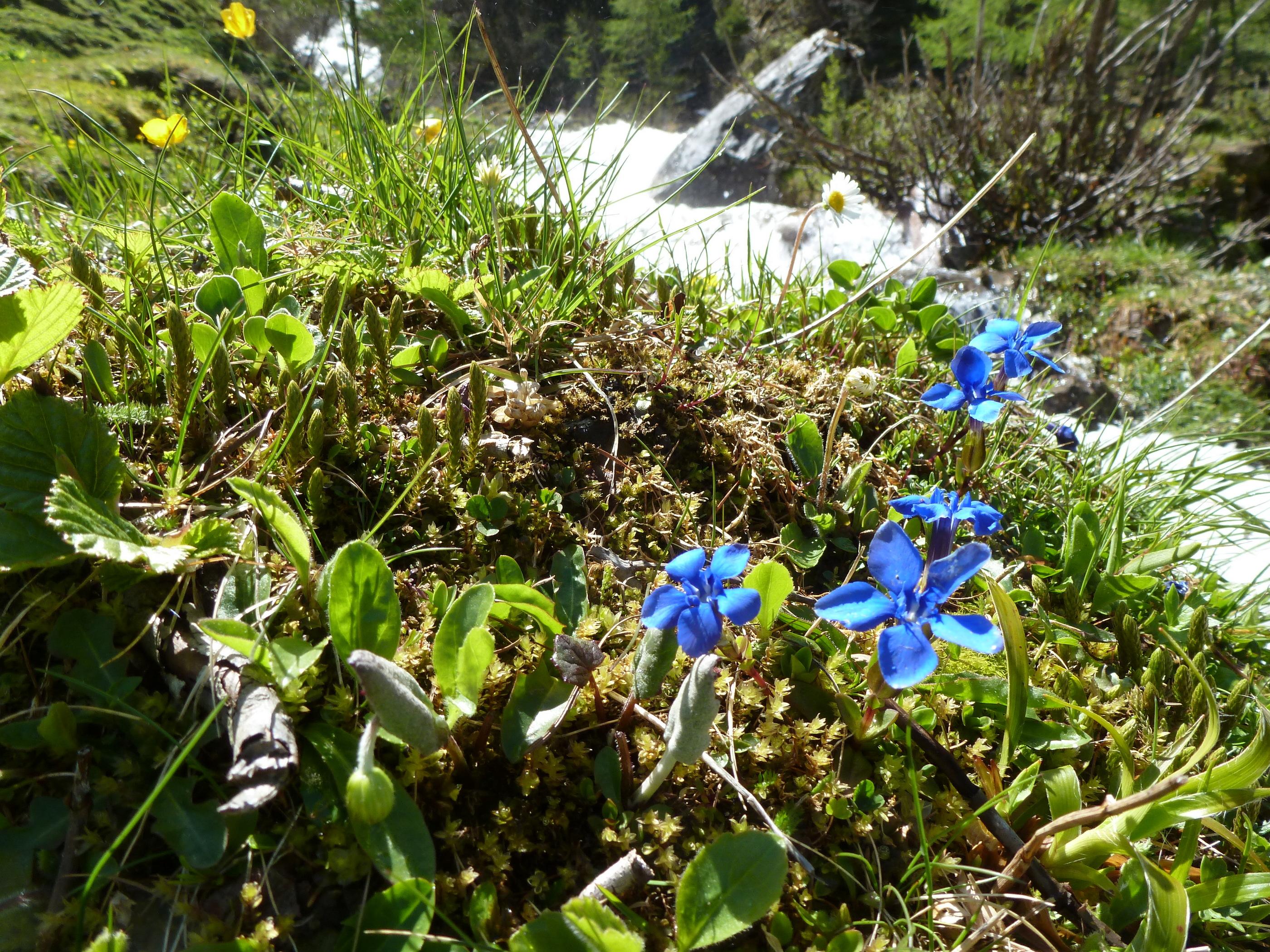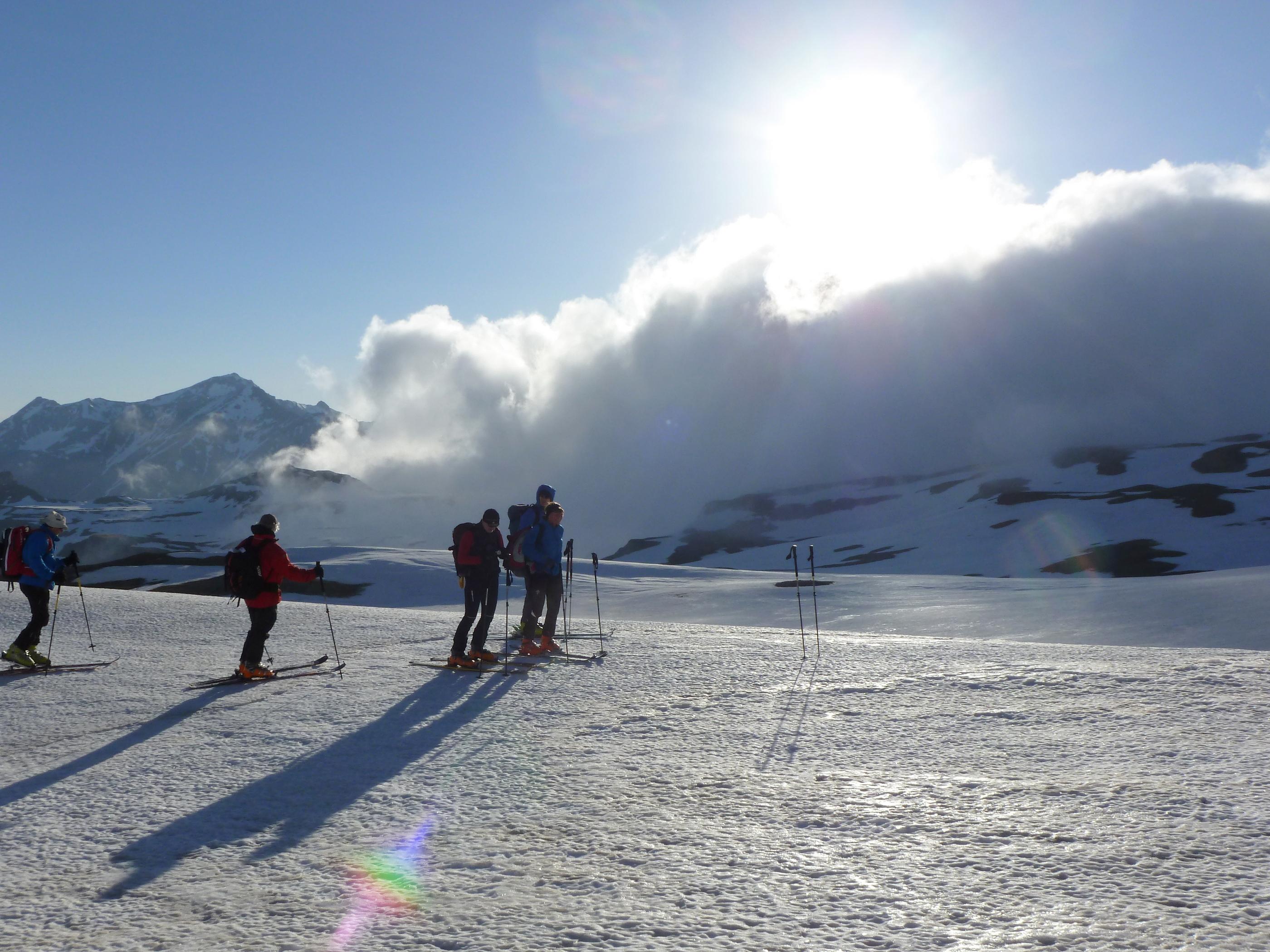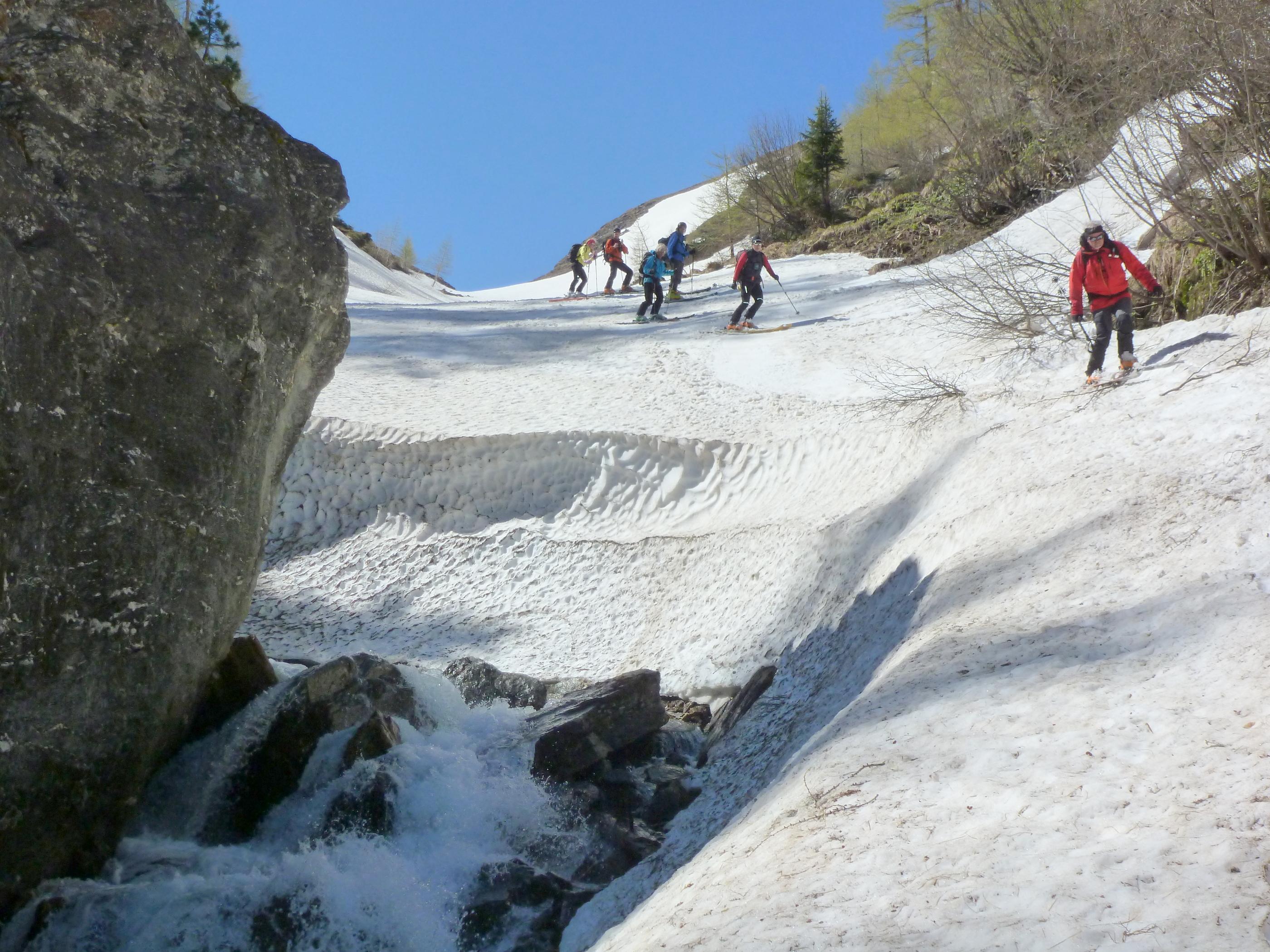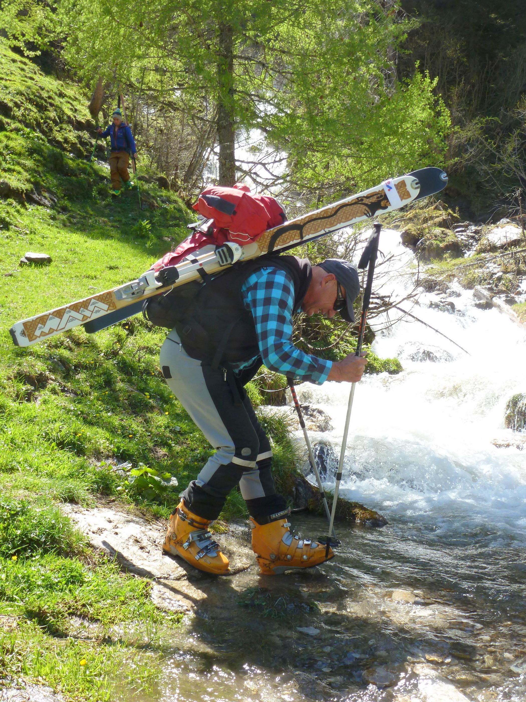 Vom Hochtor bei kräftigem Wind aus SW und teilweise massiven Wolkenbänken, die uns am Weg zur Weißenbachscharte vorübergehend einmal völlig die Sicht nehmen, nach Osten. Nach einem kurzen, nicht ganz geplanten Abstecher bei der Rossscharte dann bei immer freier werdender Sicht in die Weißenbachscharte und im großen Bogen zum Gipfelhang, wo der kompakte Harsch von der Sonne bereits aufgeweicht ist. In der Abfahrt queren wir wieder im Schuss weit zurück nach Westen, um möglichst hoch in die Weißenbachrinne einfahren zu können, da die begrenzenden Rücken wie viele andere exponierte Geländeteile schon stärker ausapern. In dieser gigantischen Natur-Halfpipe treffen wir heute von oben bis unten ideale Bedingungen an. Ohne Unterbrechung geht´s bis zum traditionellen Schlusspunkt, einem markanten Felsblock, wo unterm Lawinenschnee bereits ein mächtiger Schmelzbach herausrauscht. Eine aus dem felsigen Steilgelände westlich des Grabens abgegangene Grundlawine ermöglicht ein Stück weiter unten derzeit noch eine völlig problemlose Bachquerung. Der weitere Abstieg zum Rauriser Tauernhaus wie immer ein wunderbarer Gang durch die Jahreszeiten - von den Soldanellen und Krokussen bei den letzten Schneeflecken bis zu den bereits saftigen Almwiesen im Seidlwinkeltal. (Zum Saison-Ausklang - und weil´s so schön war - heut´ ein paar Bilder mehr! Die Blumen vor allem auch als Dankeschön an das lawine.salzburg-Team!)
