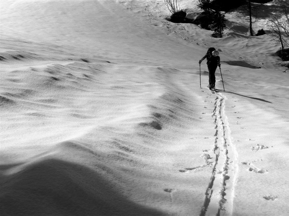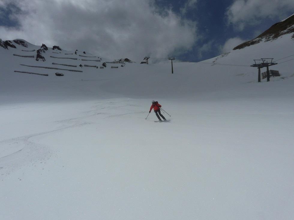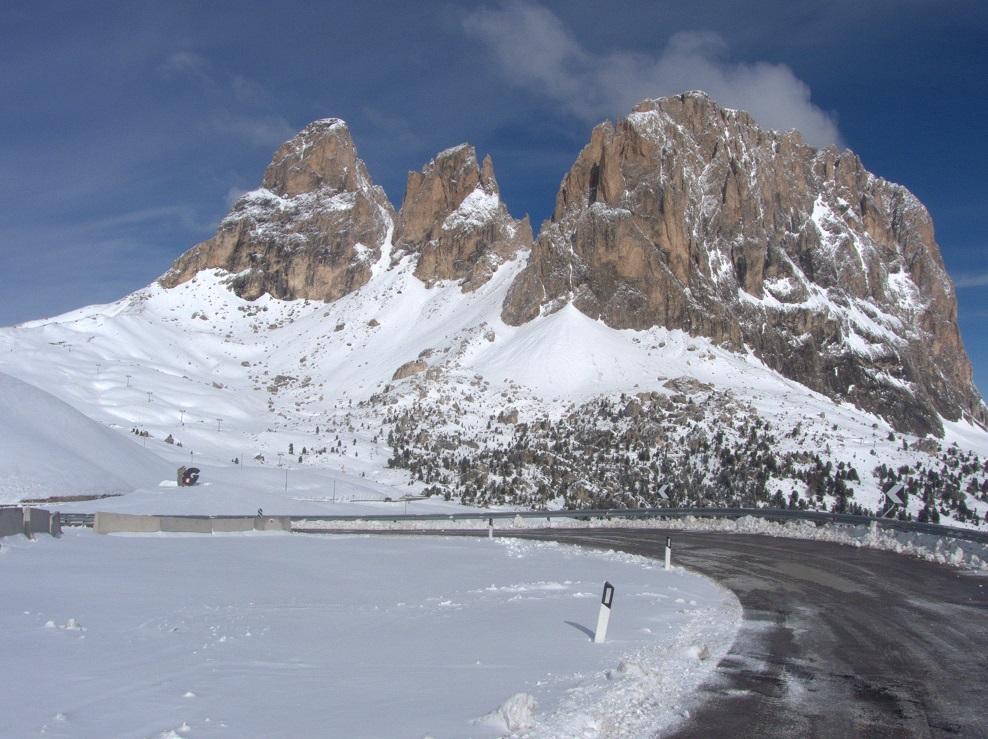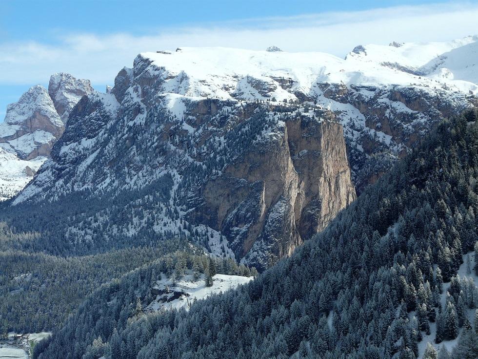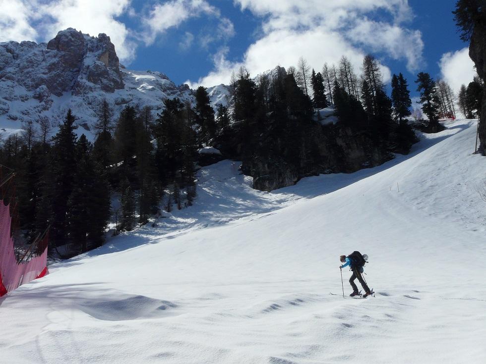 Am Morgen gut 3cm Neuschnee am Auto, Fahrt übers Sellajoch (zum Glück noch mit Winterreifen) und hinab nach Canazei. Zufällig entdecken wir ein schmales Schneeband bis herunter nach Alba. In der Hoffnung, daß sich dieses nach oben fortsetzt steigen wir auf der steilen Ciampac Piste auf. Murmeltiere haben sich trotz der teilweise noch dicken Schneedecke ihren Weg ins Freie gegraben und rennen über den Schnee. Vom Rifugio Ciampac gehts vorerst sehr flach, dann in angenehmer Steilheit weiter zur Station Sela Brunech.