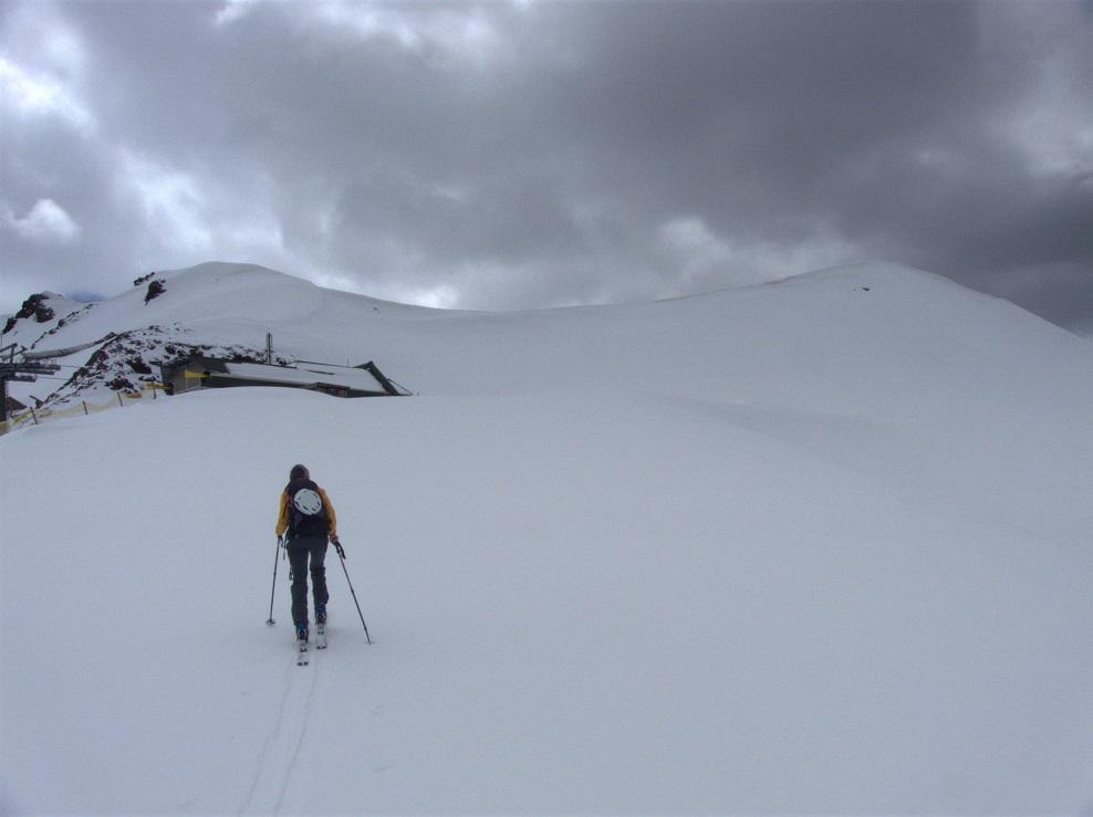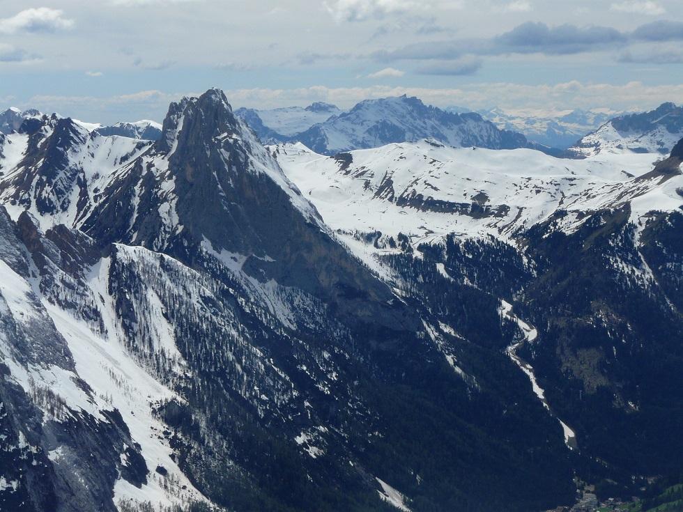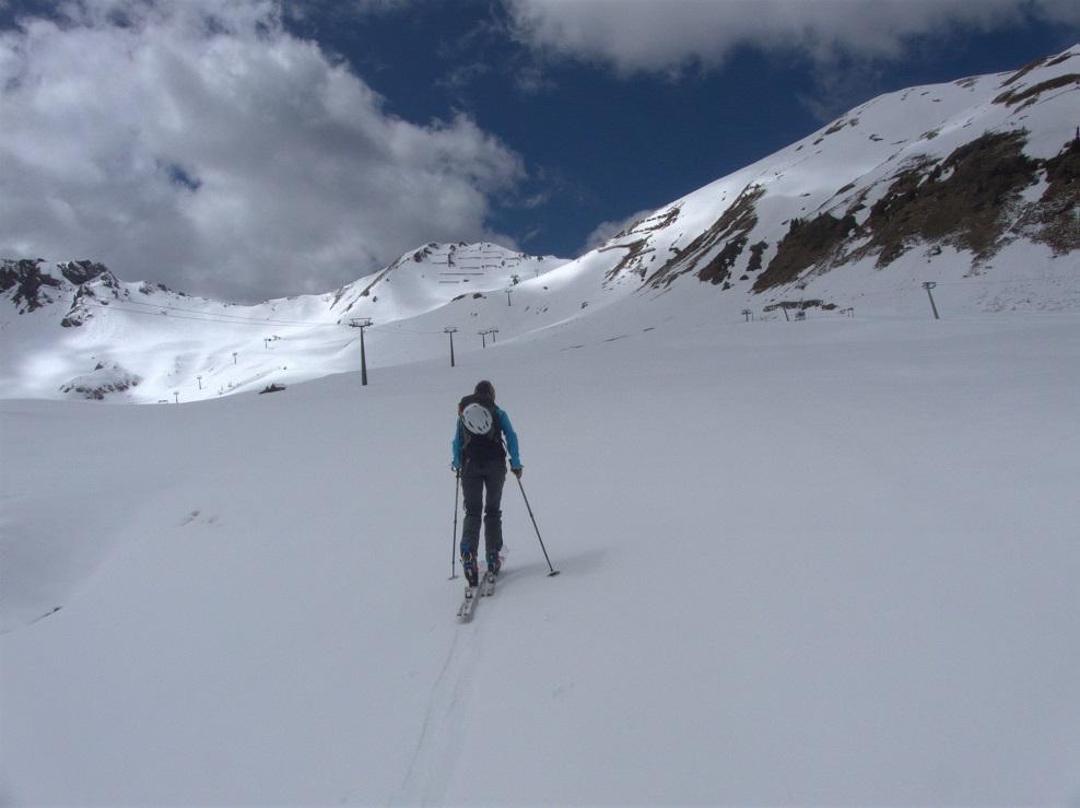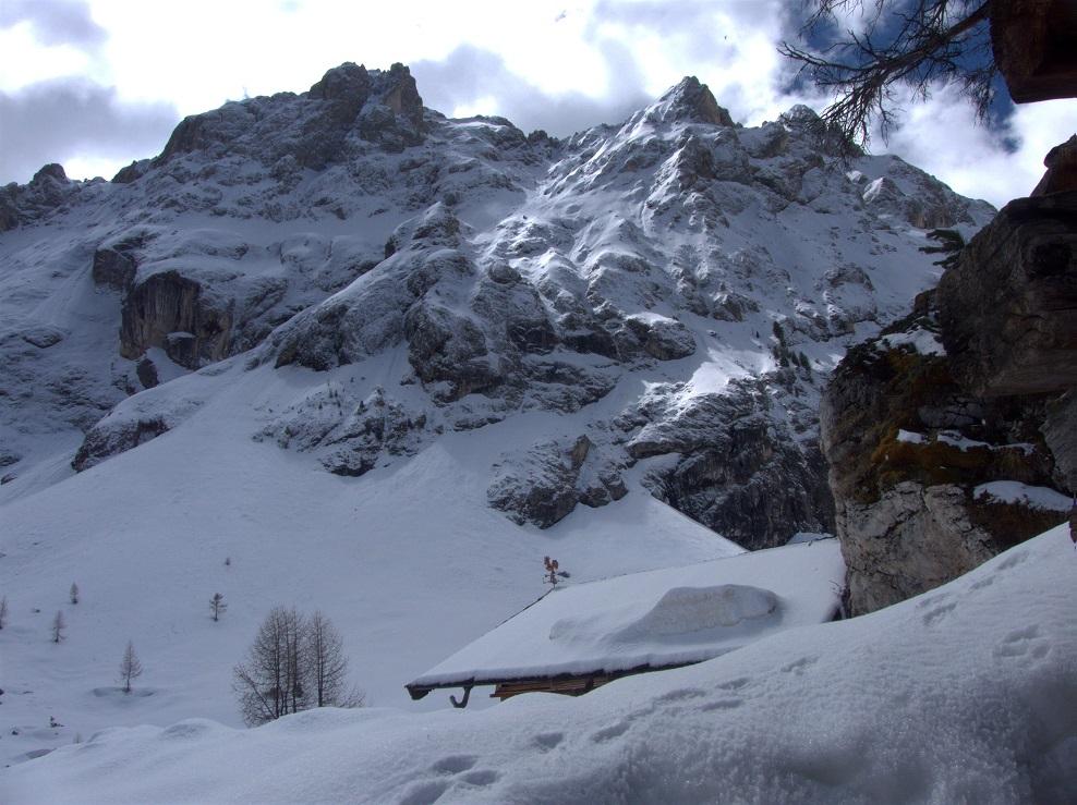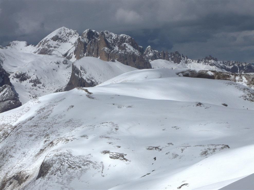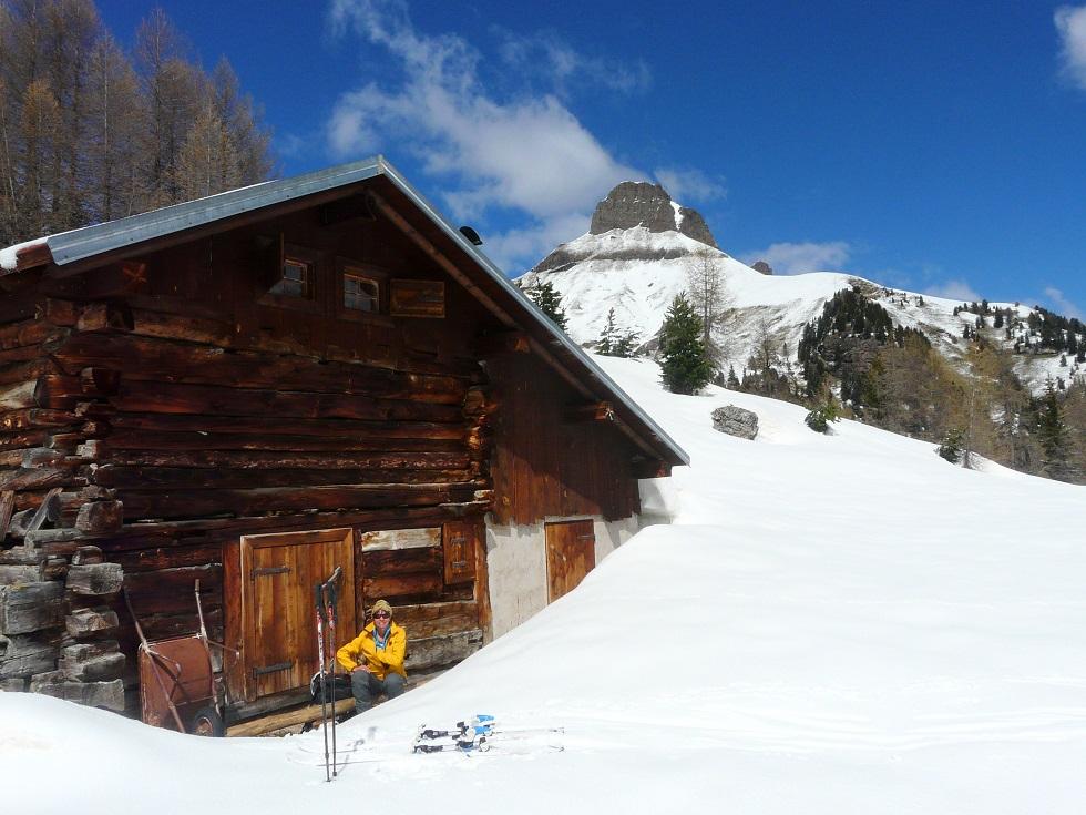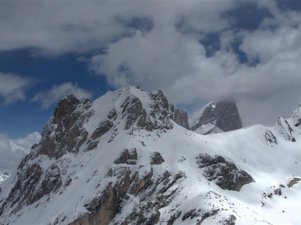 Faszinierende Berge ringsum (vor allem der Colac ist ein wilder Zacken), sehr kalt, unangenehmer Wind (eigentlich die ganze Woche). Auf den nahen etwas höheren Gipfel des Su L´aut verzichten wir (steinig). Sehr gute Abfahrtsbedingungen.