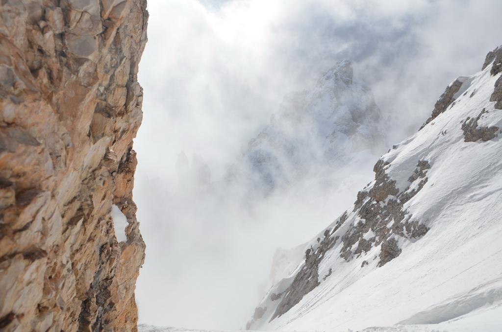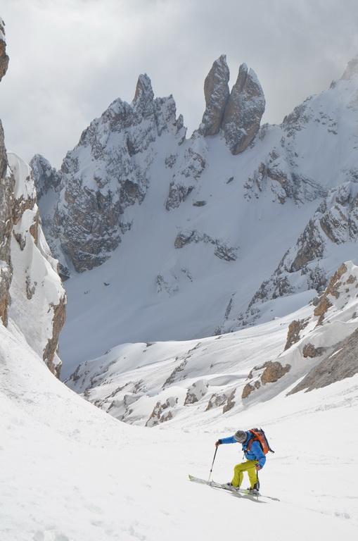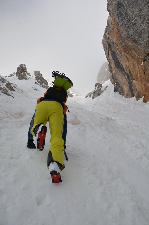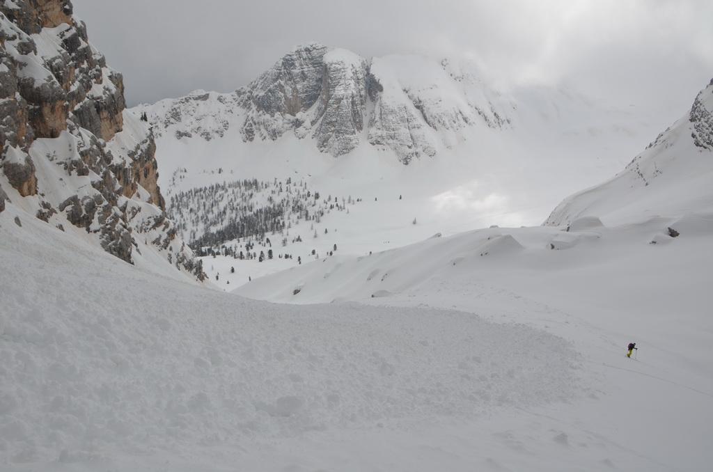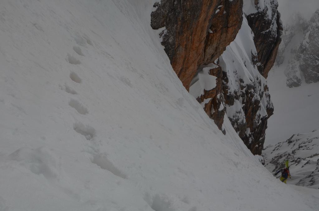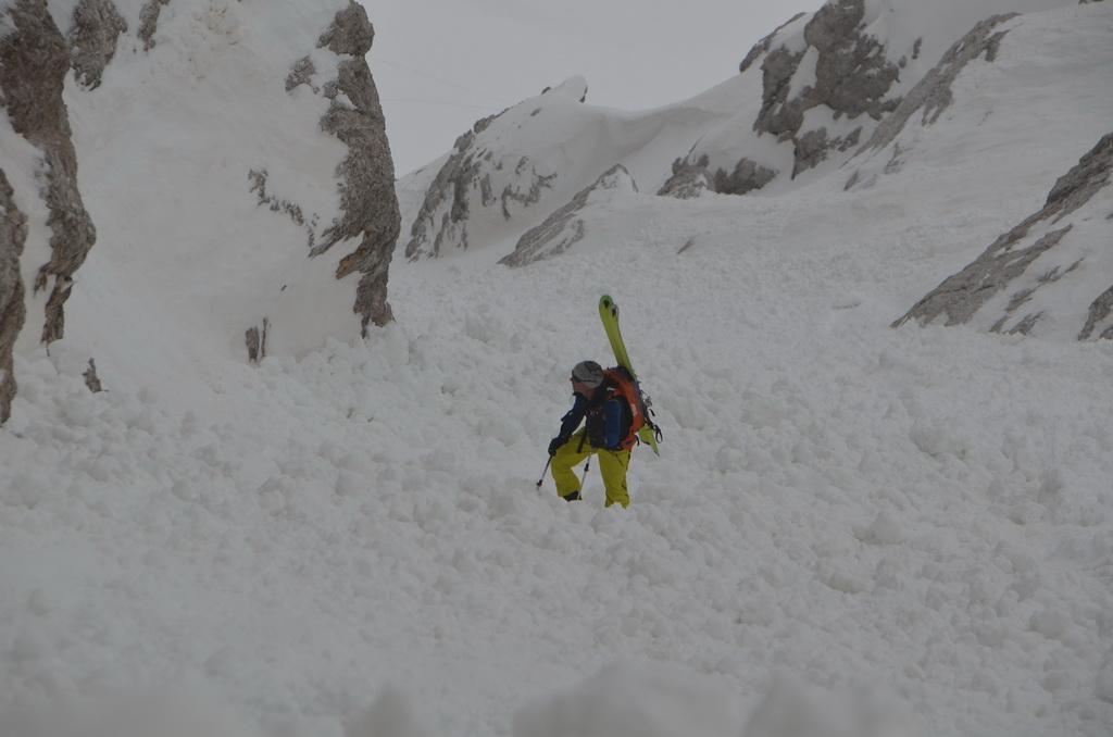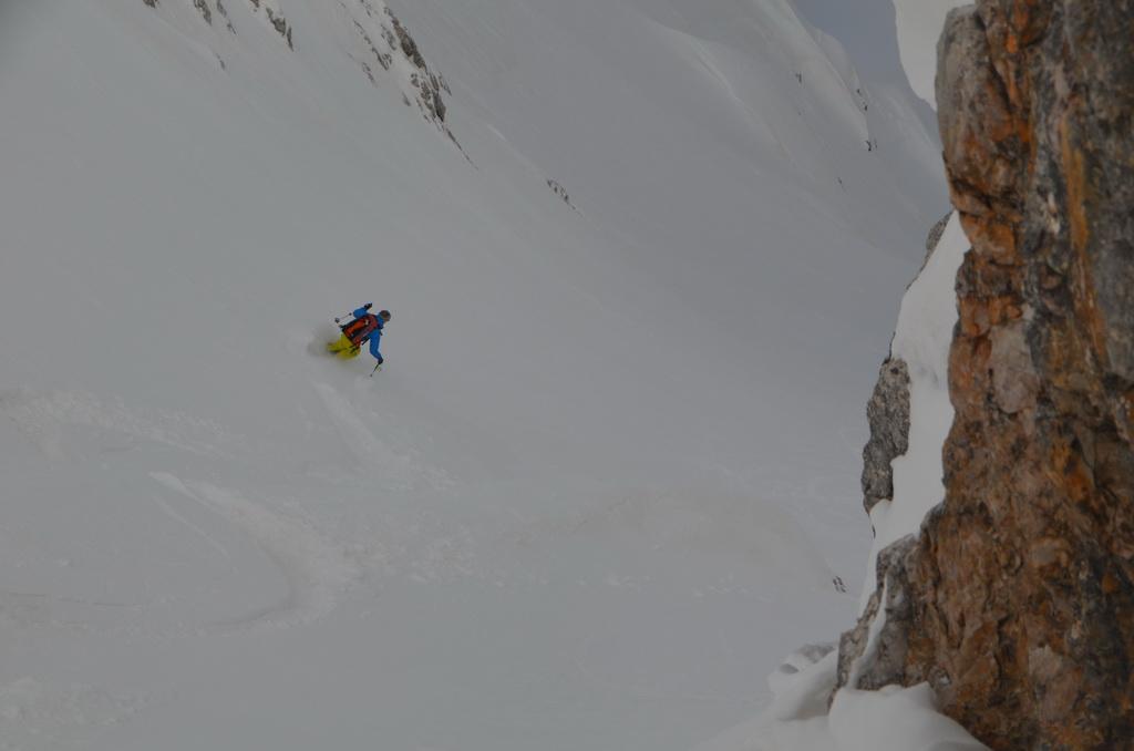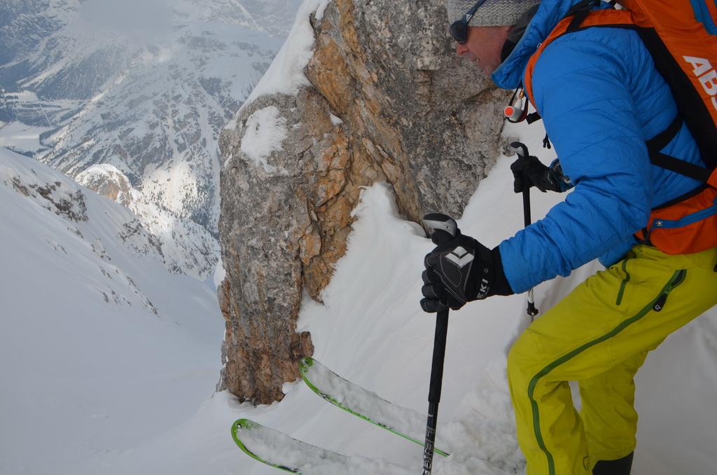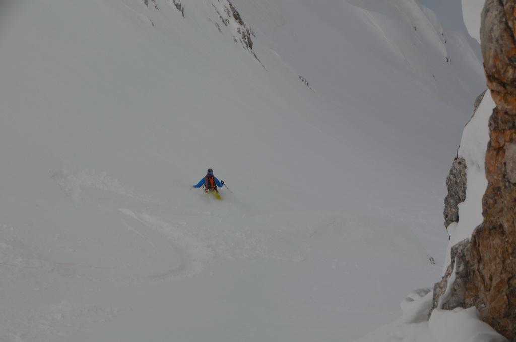 Von West über Süd nach Ost wird der Schnee zunehmend schlechter, bzw. bekommt je nach Hangneigung bzw. Einstrahlungswinkel schon einen mehr oder weniger dicken Harschdeckel. Die SÜdseitige Rinne unseres Aufstieges ist schon vor einiger Zeit abgegangen, war aber gut zu gehen. Weiter oben wars teilweise recht hart und an einigen Stellen hätte ich mir Steigeisen gewünscht. Die Nordseitige Abfahrt war dann ein Pulvertraum von oben bis unten. Die Schneedecke zeigte kaum WIndeinfluss und hat sich schon recht gut gesetzt.