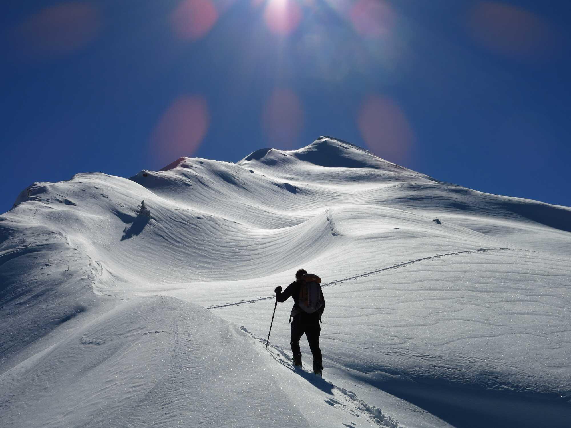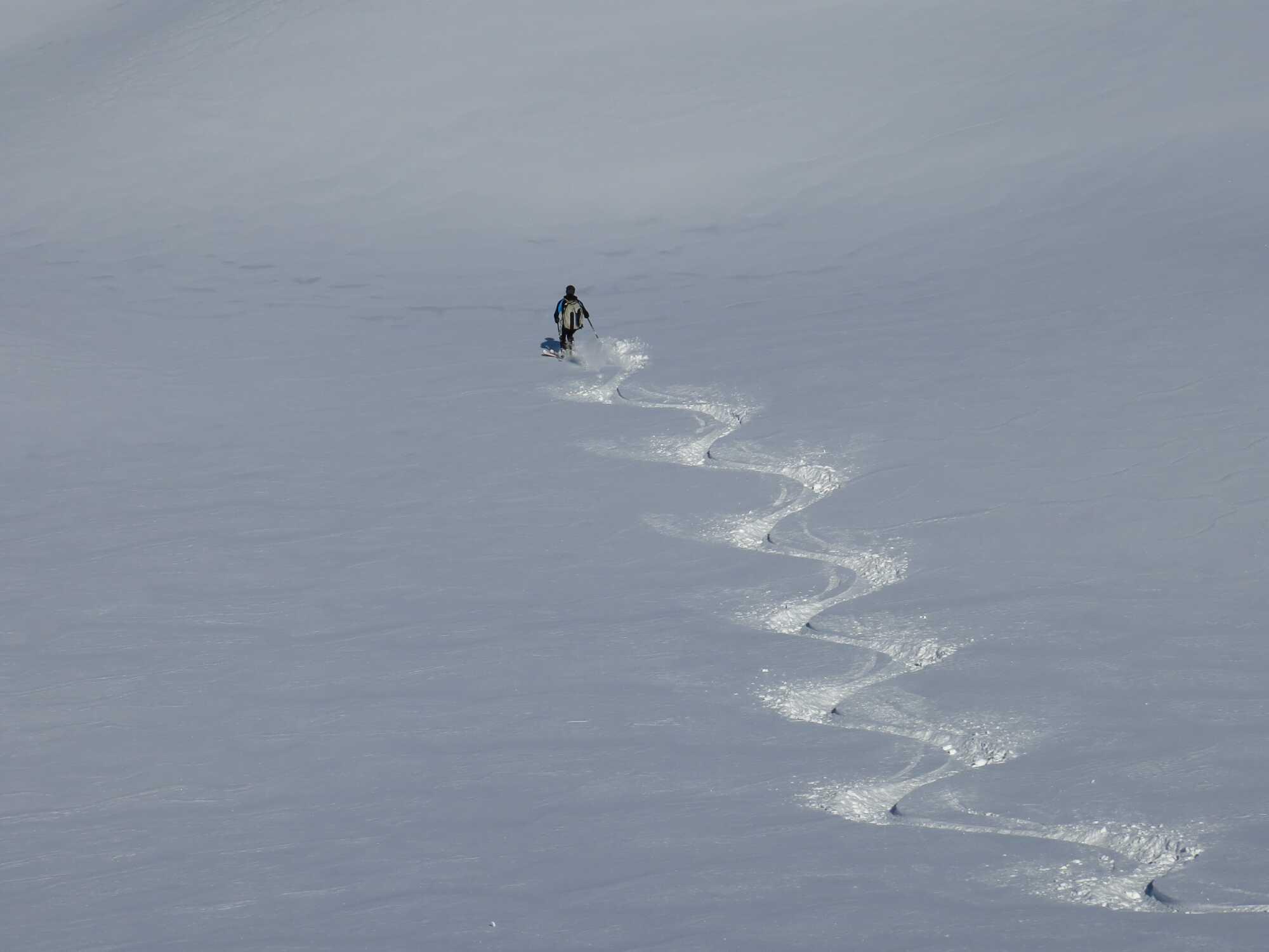 Schneelage: Genug Schnee vom Ausgangspunkt weg. Unten ca. 5-10cm Neuschneeauflage, die oben bis auf 10-25cm ansteigt. Bis auf die obersten Gipfelbereiche, wo einige Feinde unterm Schnee lauern, überall ausreichend Untergrund vorhanden. Im Schatten blieb der Schnee pulvrig, in der Sonne wurde er zunehmend pappig.