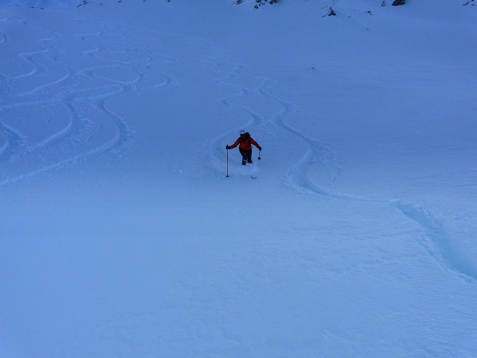 Soweit meinerseits einschätzbar, auch nach Begutachtung eines Rutschblocks im oberen Kreekar (wurde von vorausgehenden Tourengehern errichtet), sichere Bedingungen, keine Lawinentätigkeit in irgendeiner Form erkennbar.