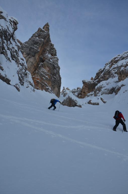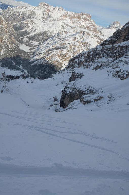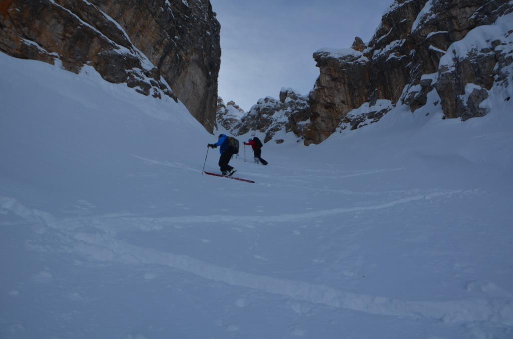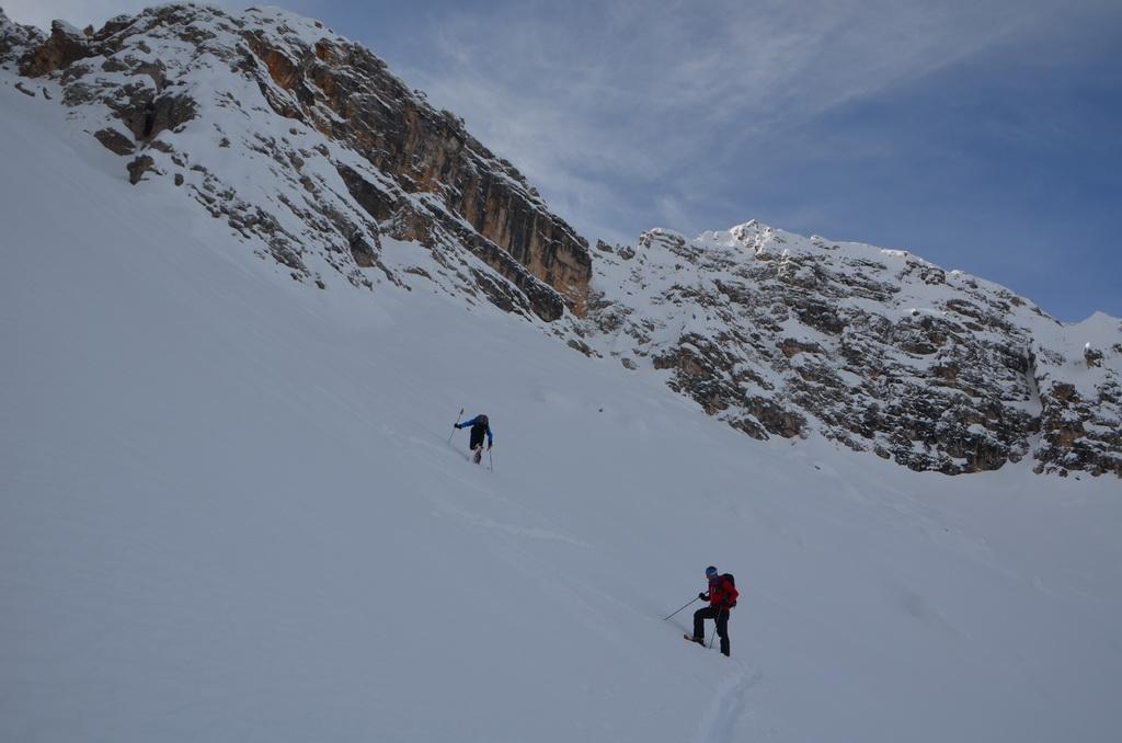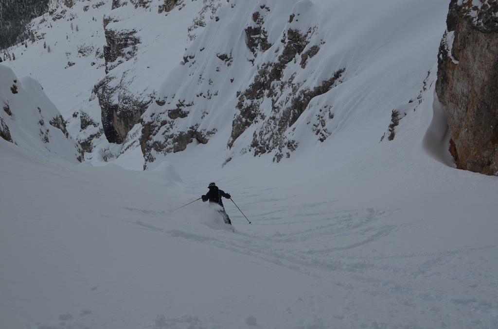 <p>Auch heute nahezu perfekte Bedingungen in den Dolomiten. Die Spurarbeit hat sich ausgezahlt, auch oder gerade deshalb, weil wir unser Tagesziel heute nicht ganz erreicht, bzw. ca. 30hm unter der Scharte abgebrochen haben. Bis dorthin eine durchwegs gut gesetzte Schneedecke mit ca. 10-20cm Pulverschneeauflage. Die letzten Meter vor der Scharte konnte man dann aber immer deutlicher den Windeinfluss erkennen, wir waren uns der Lage nicht 100% Sicher, vl. lag es auch daran dass es in letzter Zeit vermehrt negative Schlagzeilen bezüglich Lawinen gab, und so haben wir uns zum Abbruch entschlossen. Bei einem kurzen Rückblick beim Abfahren konnten wir dann auf der Scharte andere Kollegen erkennen, die von der anderen Seite gekommen sind. So hatte der Abbruch nebenbei auch noch den positiven Aspekt dass wir die ersten bei der Abfahrt waren, was speziell im oberen engen Teil schon der Hit war. Alles in allem eine großartige Tour in wilder Dolomitenlandschaft, bei der wir vom Umkehrpunkt bis zum Auto perfekten Pulverschnee hatten. Allerdings soll bereits Morgen im laufe des Tages erneut bis zu 60cm Neuschnee kommen und die Lawinengefahr steigt wieder auf 3, bzw. in einigen Gebieten sogar auf 4 an..</p>