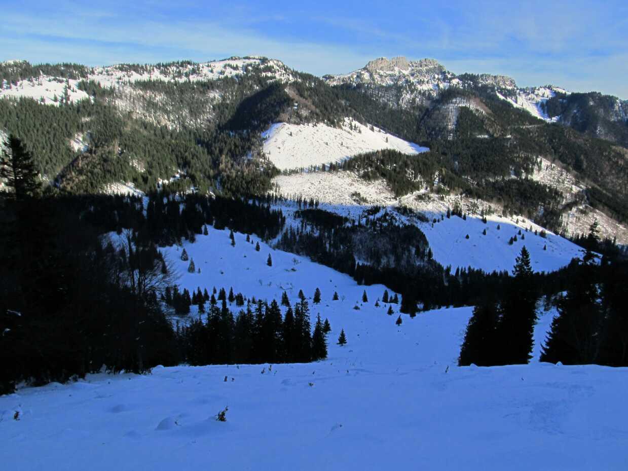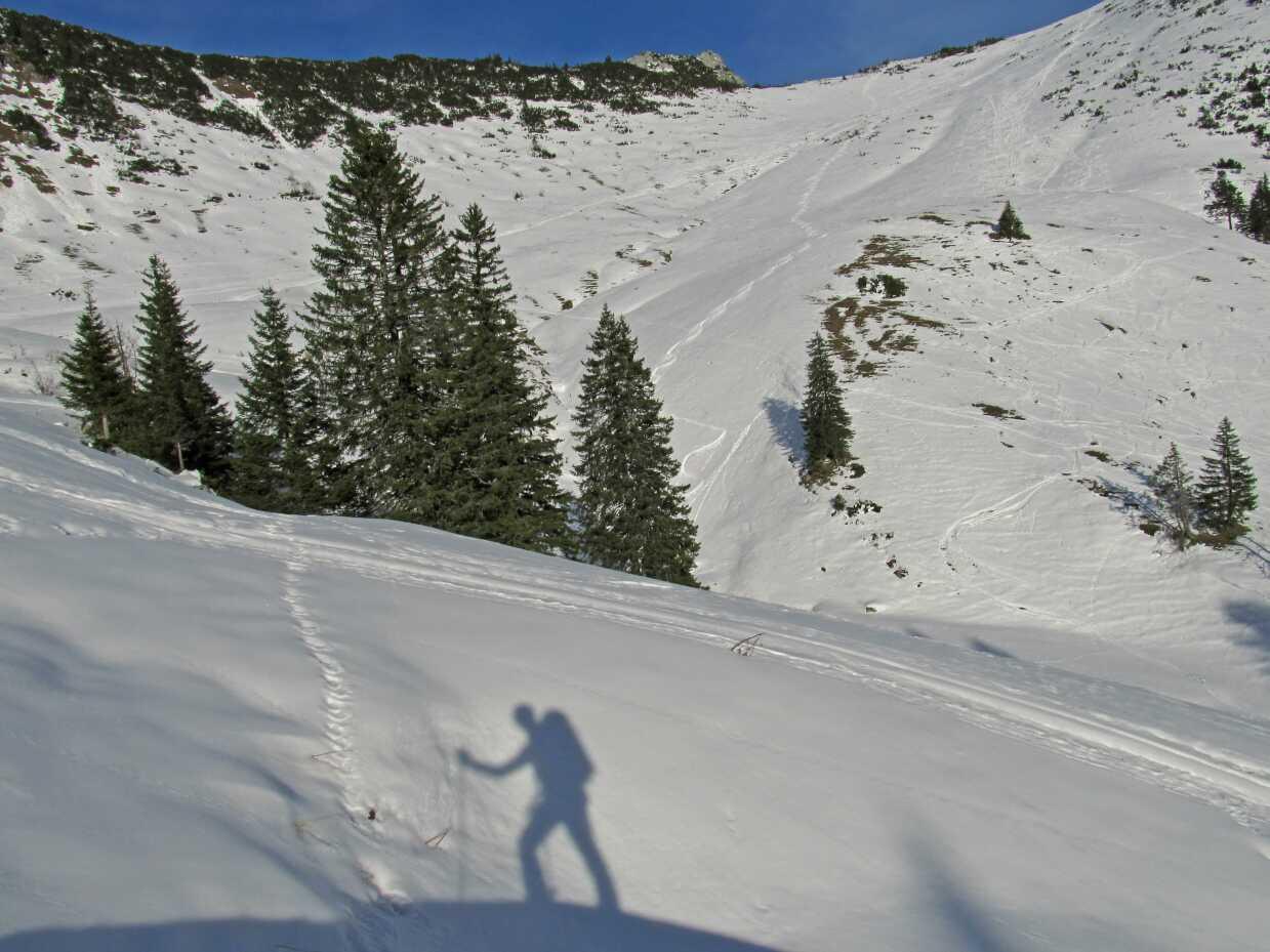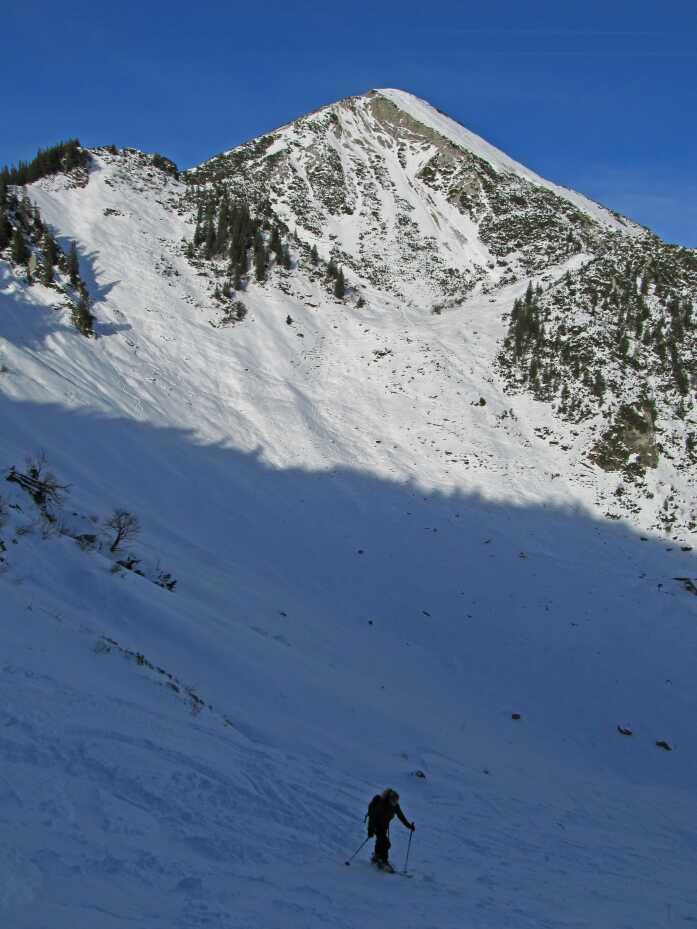 Aufstieg zur Mühlhornwand (1658) und Abfahrt über SO-Hang bis unterhalb Priener Hütte (ca. 1370) ebenfalls in gutem Schnee.