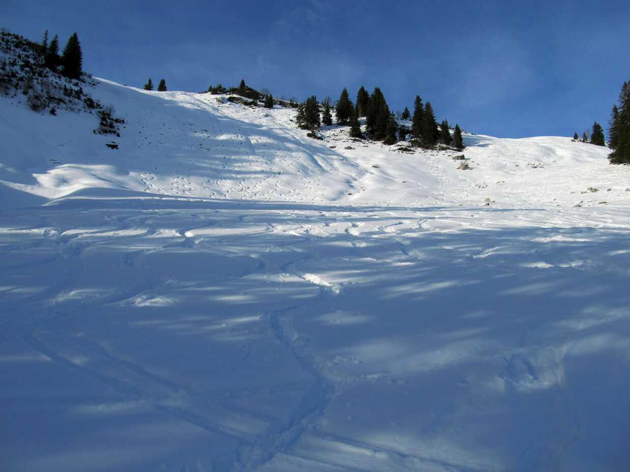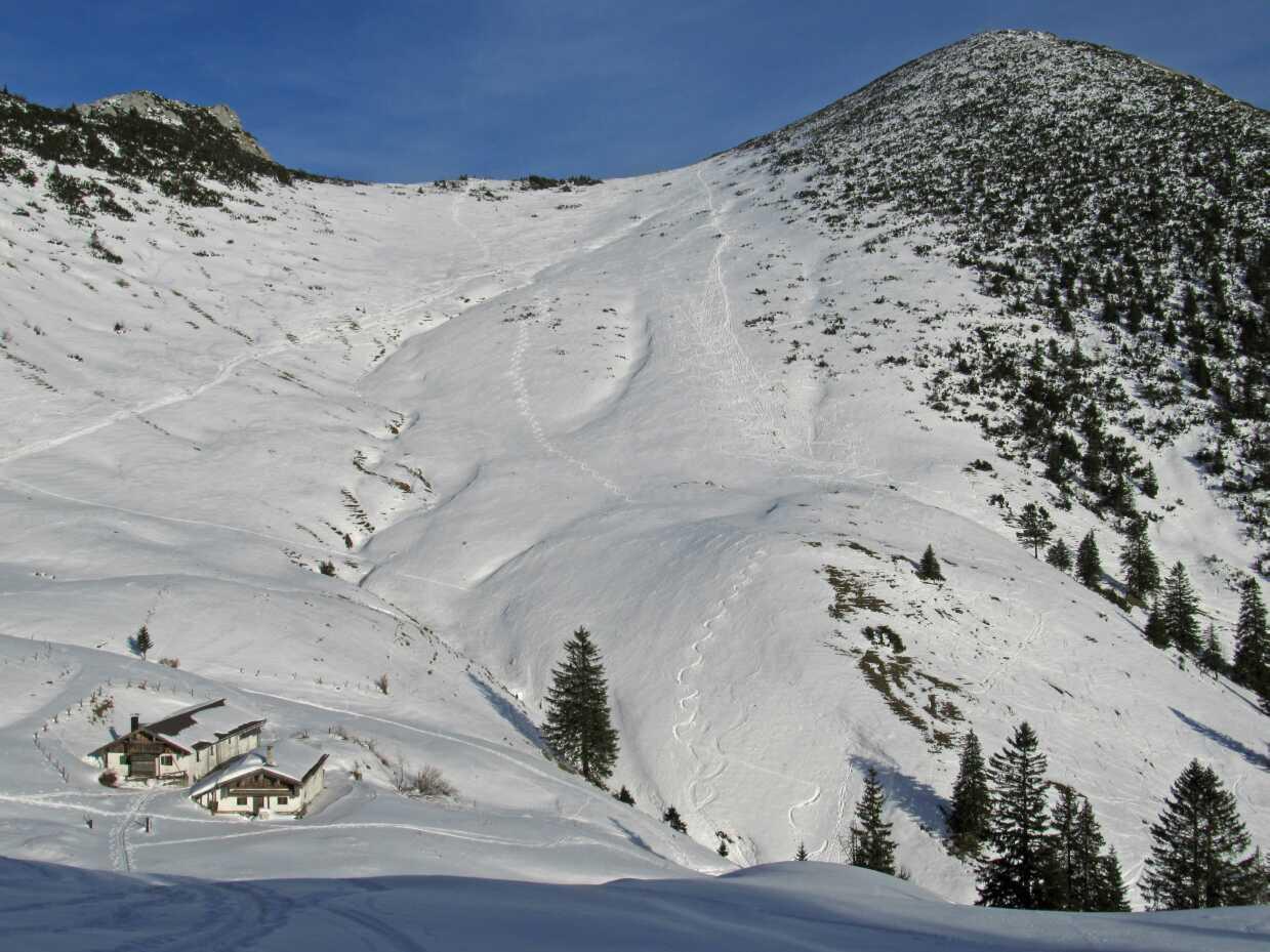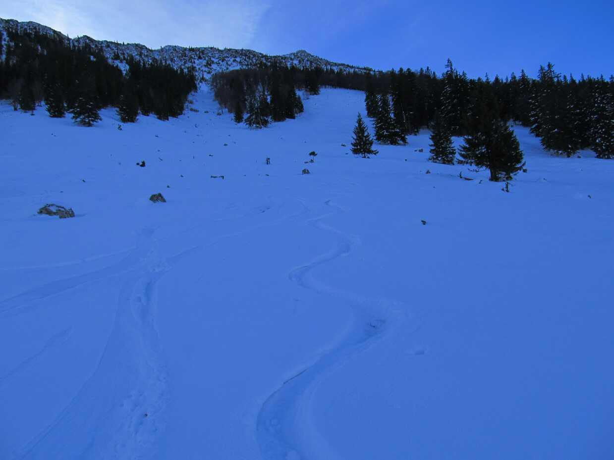 Neustart in Ettenhausen (a Häusl weiter, ca. 630): Aufstieg vom Sessellift-PP über die aufgelassene Piste zur Wuhrsteinalm (ca. 1100). Der unterste Hang ist noch recht steinig, danach ist die Abfahrt gut eingefahren, Untergrundkontakte sind meist harmlos. Weiteranstieg zum Breitensteinsattel (ca. 1580), im Steilhang meist Pulver, stellenweise auch etwas Pressschnee, einige Steinkontakte. Abfahrt zur Priener Hütte ohne Probleme (Grasuntergrund).