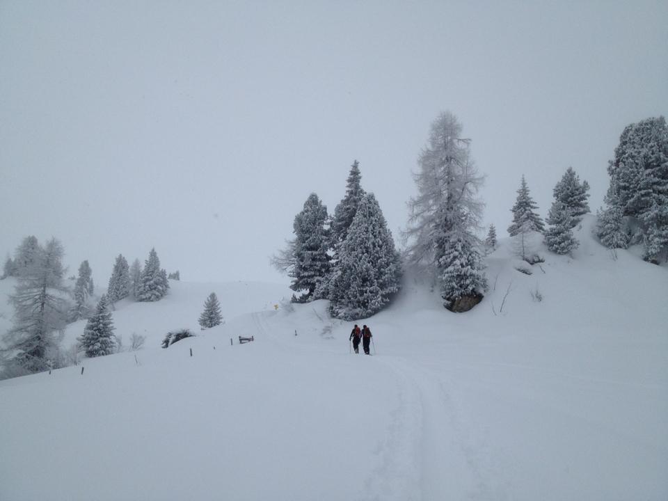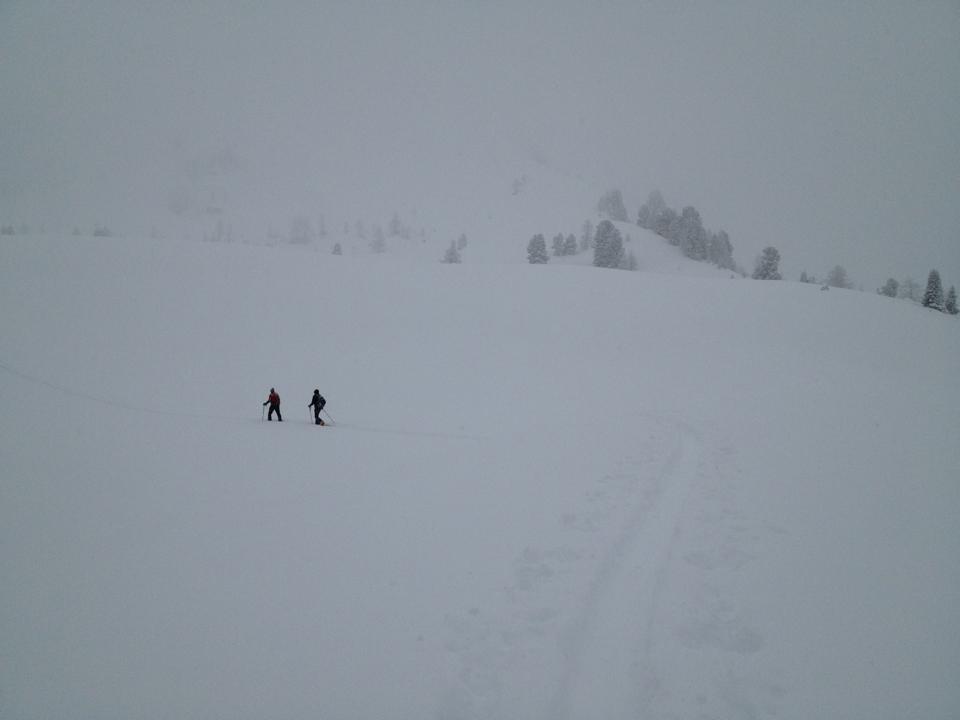 Wetter: Nur geringe Auflockerungen beim Aufstieg. Dann einsetztender Schneefall bis zum frühen Nachmittag. Sicht ab einer Höhe von 1900 m praktisch 0.