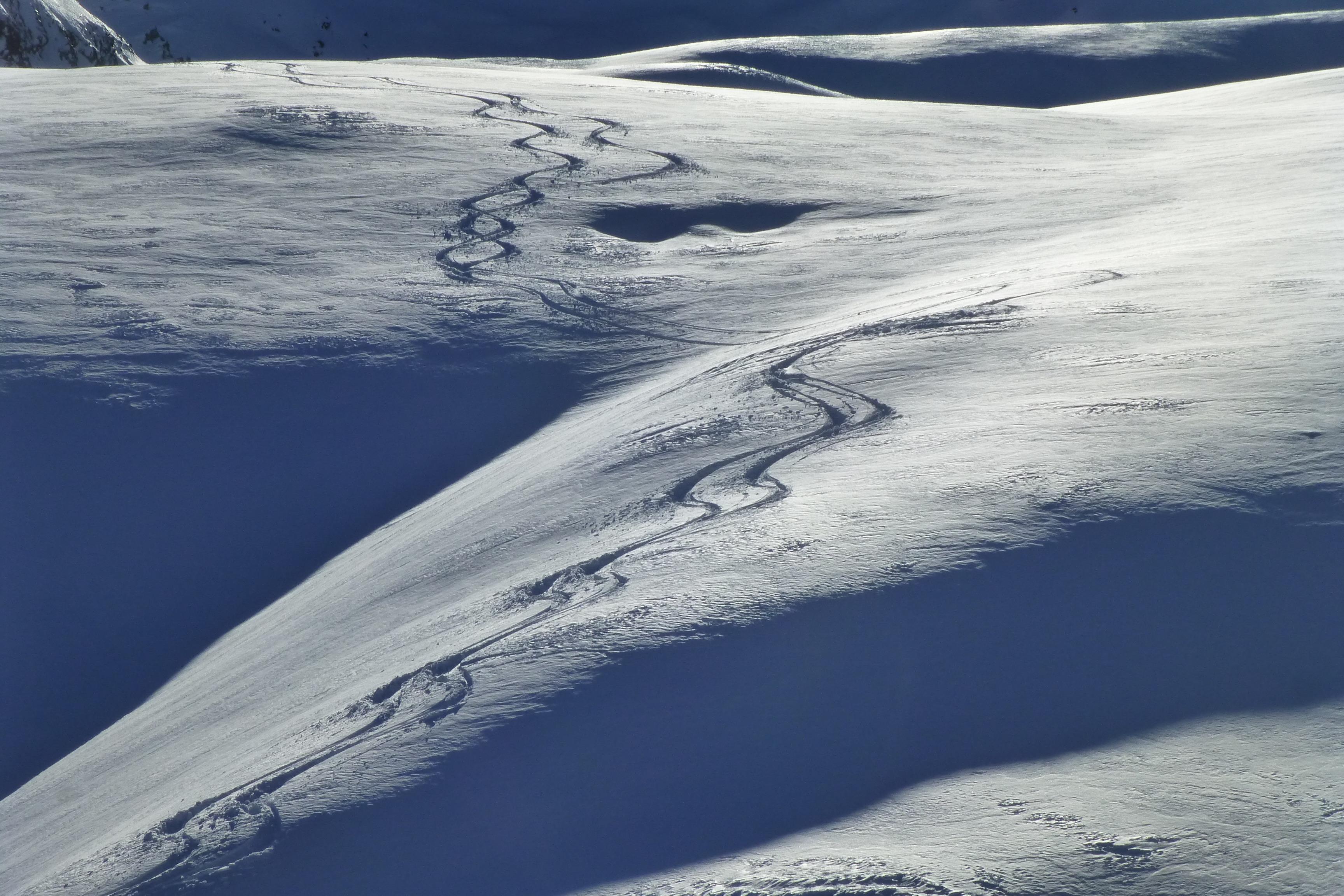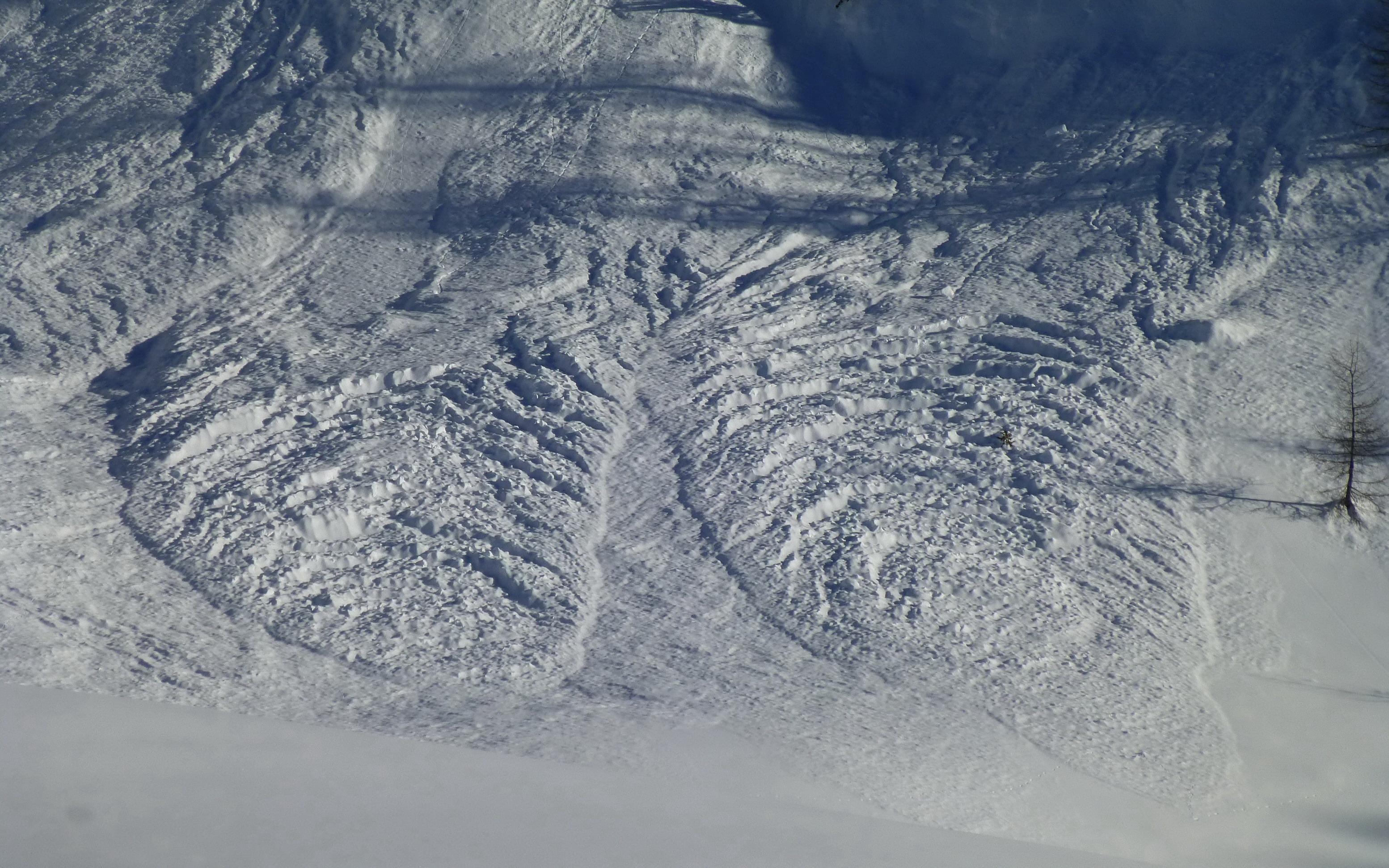 Auffällig viele Schneebrettabrisse auf ostschauenden Hängen, meist nur geringe Mächtigkeit (ca. 20 - 30 cm), aber relativ große Flächenausdehnung - vermutlich aufgrund der Windverfrachtungen in den Tagen nach dem letzten Schneefall (Sonntag 5.1.)!