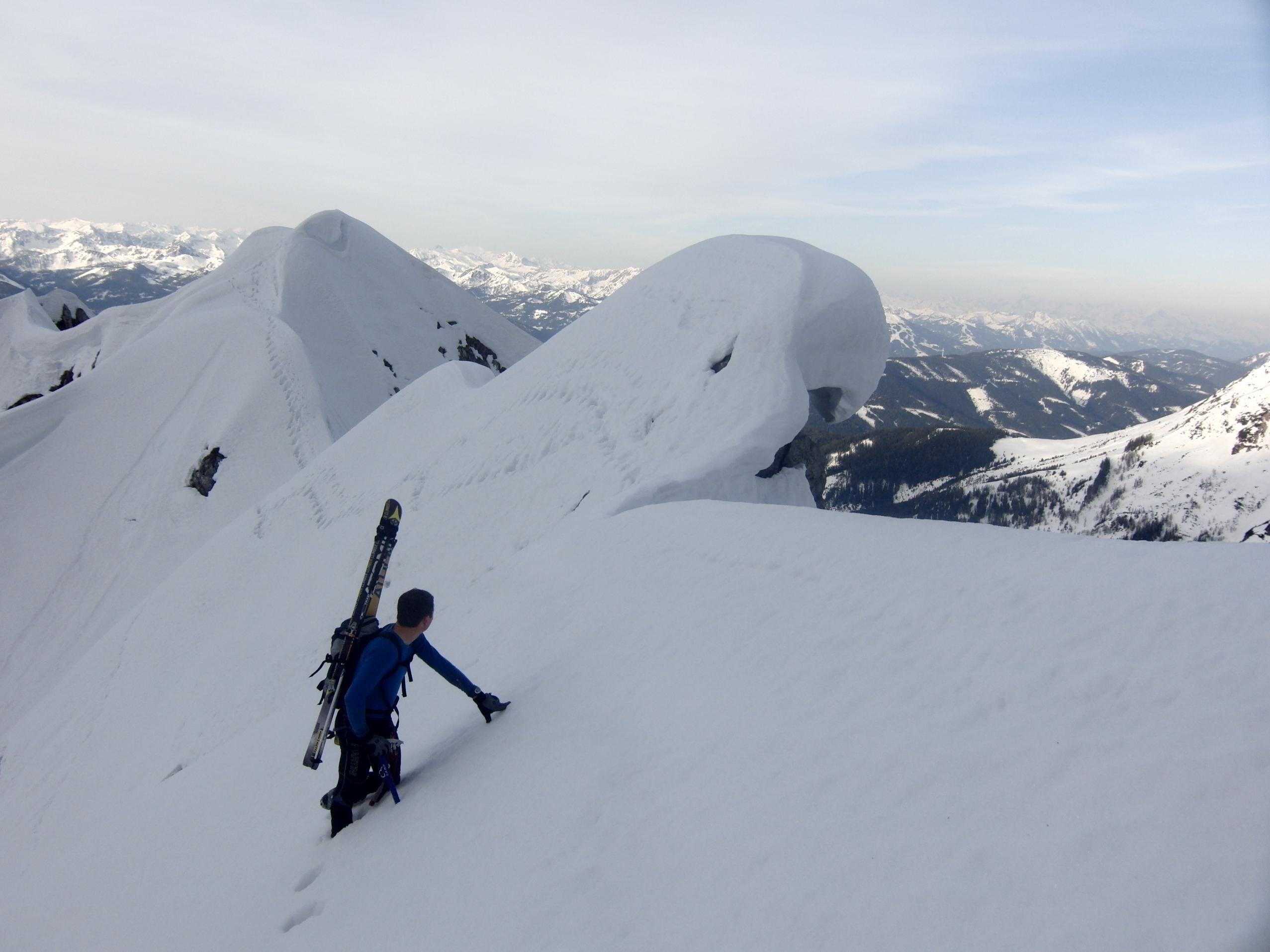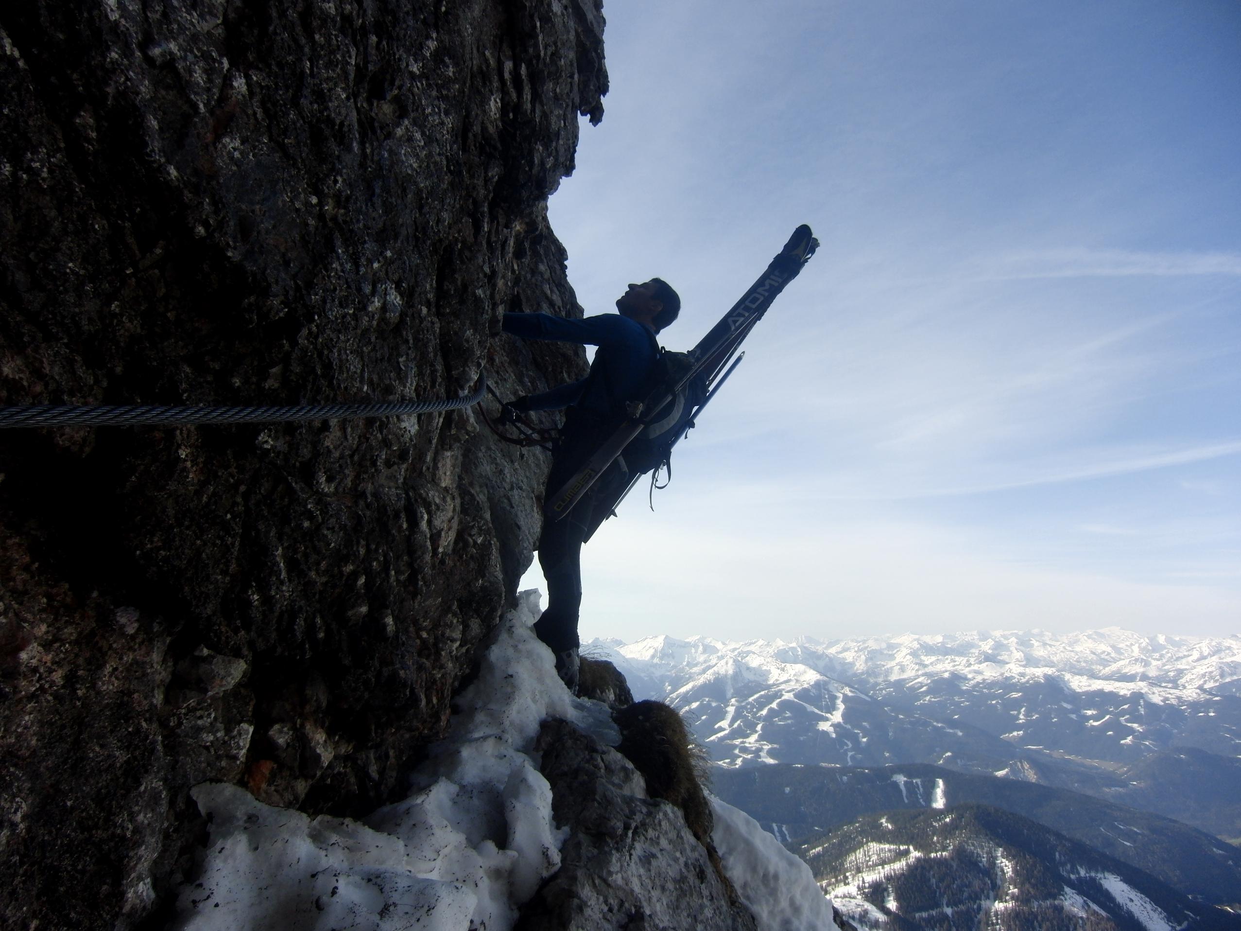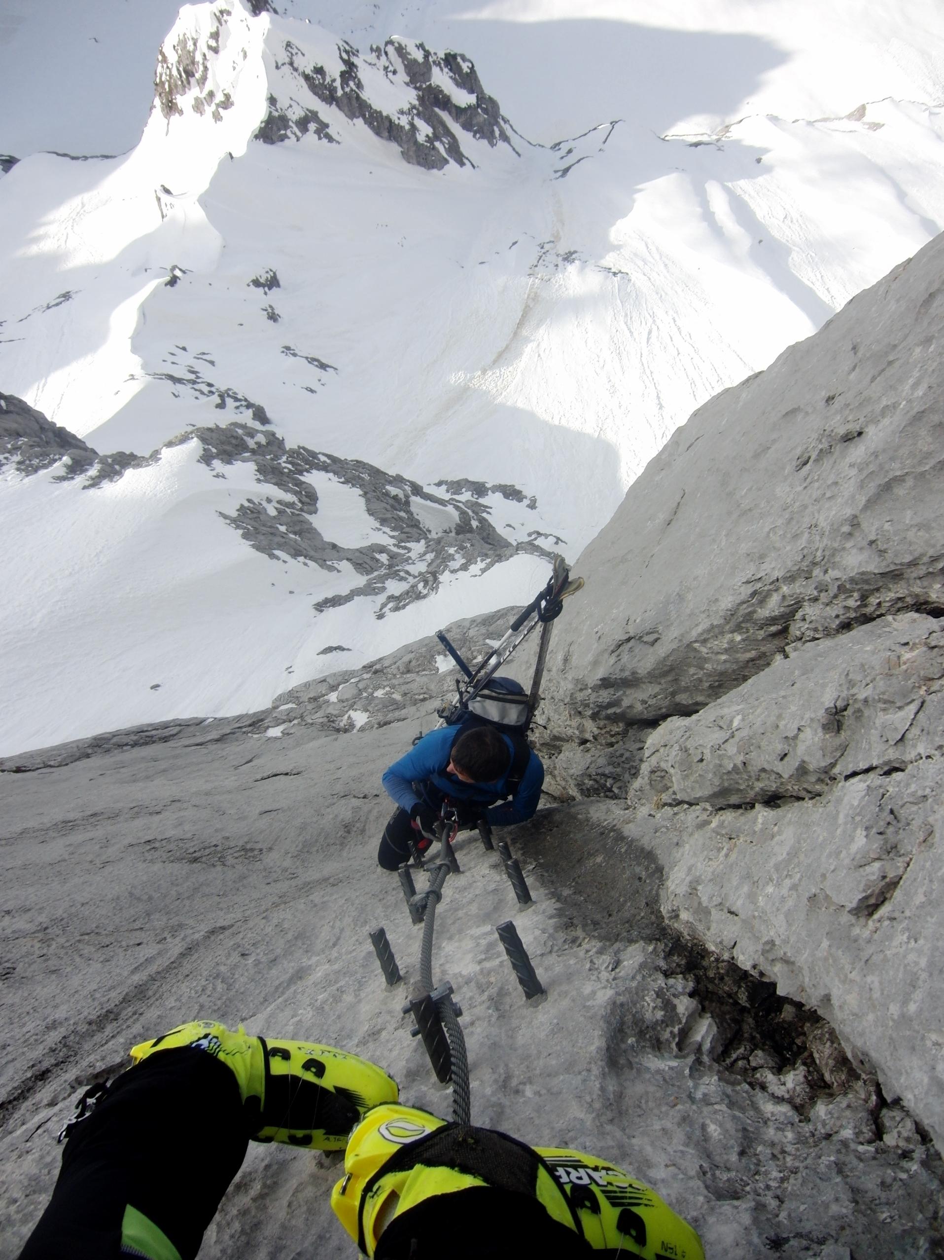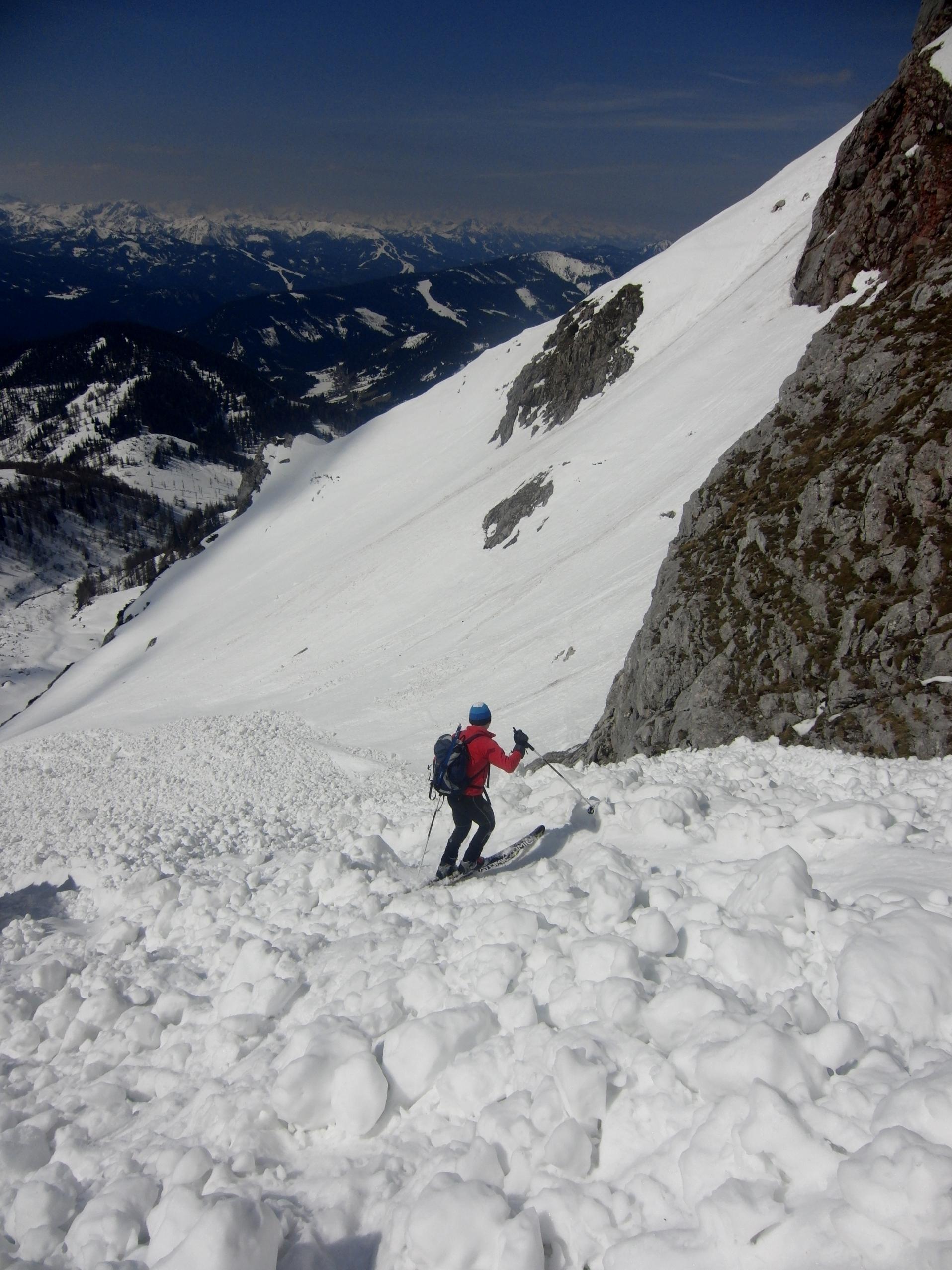 Schnee-Bedingungen: heute wirklich schlechte Bedingungen (mit Ausnahme Schwadrinne)! Immer wieder bricht man tief durch. Unterhalb der dünnen Kruste stark angefeuchteter Schnee. Auch unterhalb der Seethaler Hütte (immerhin auf über 2700) bricht man durch. Darunter dann meist tiefer Sulz. Überraschend guter Zustand in der Schwad-Rinne. Am besten waren wir heute jedenfalls in den Klettersteigen aufgehoben.
