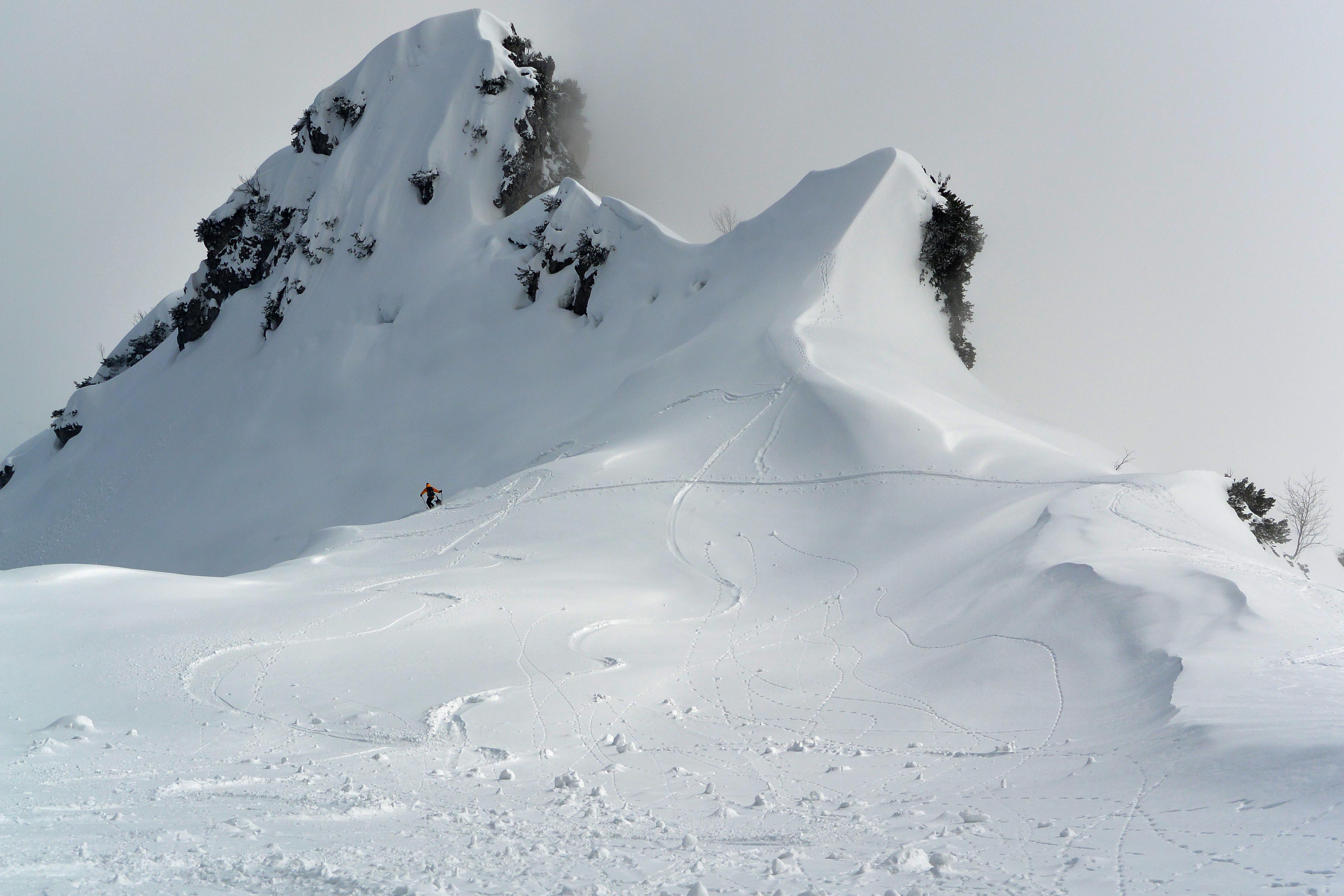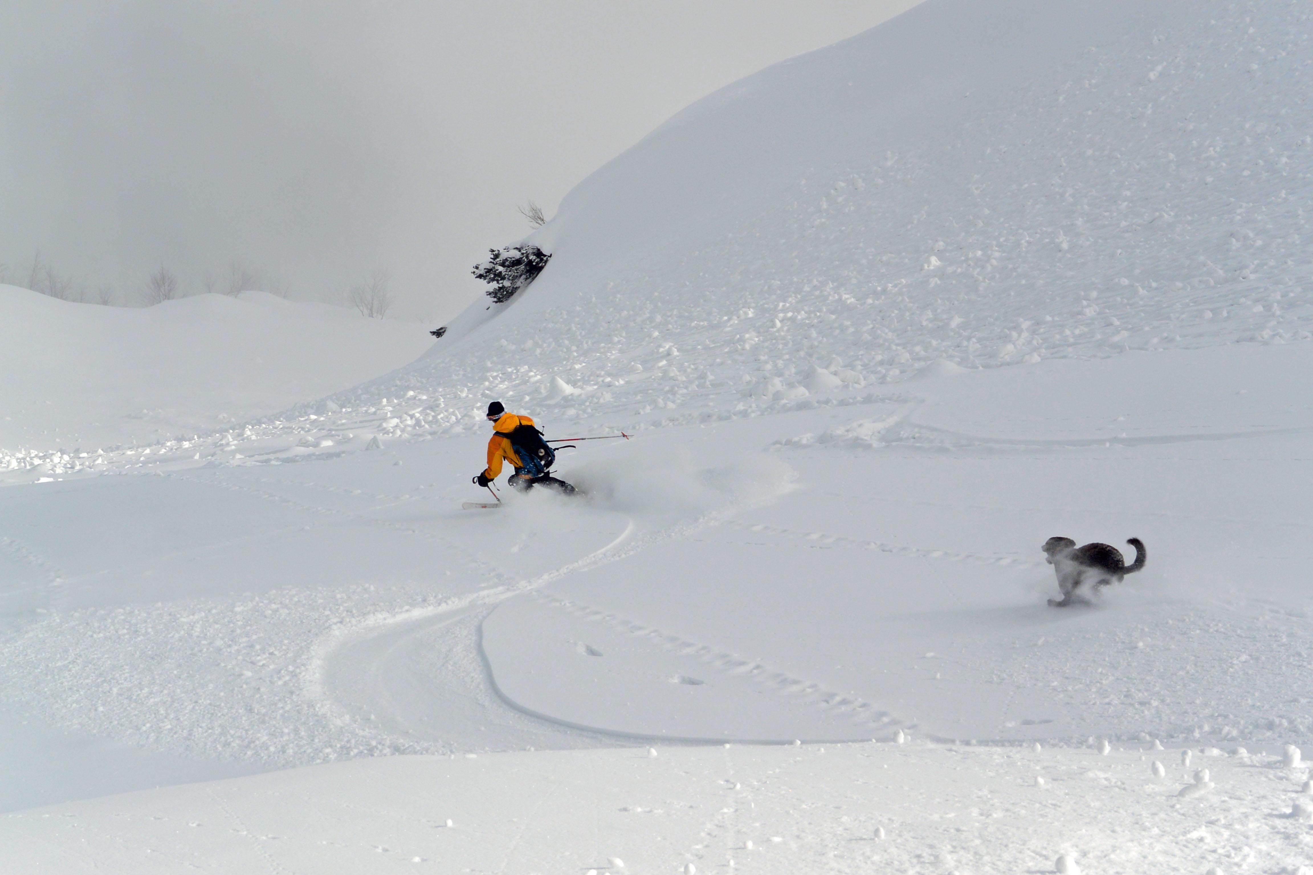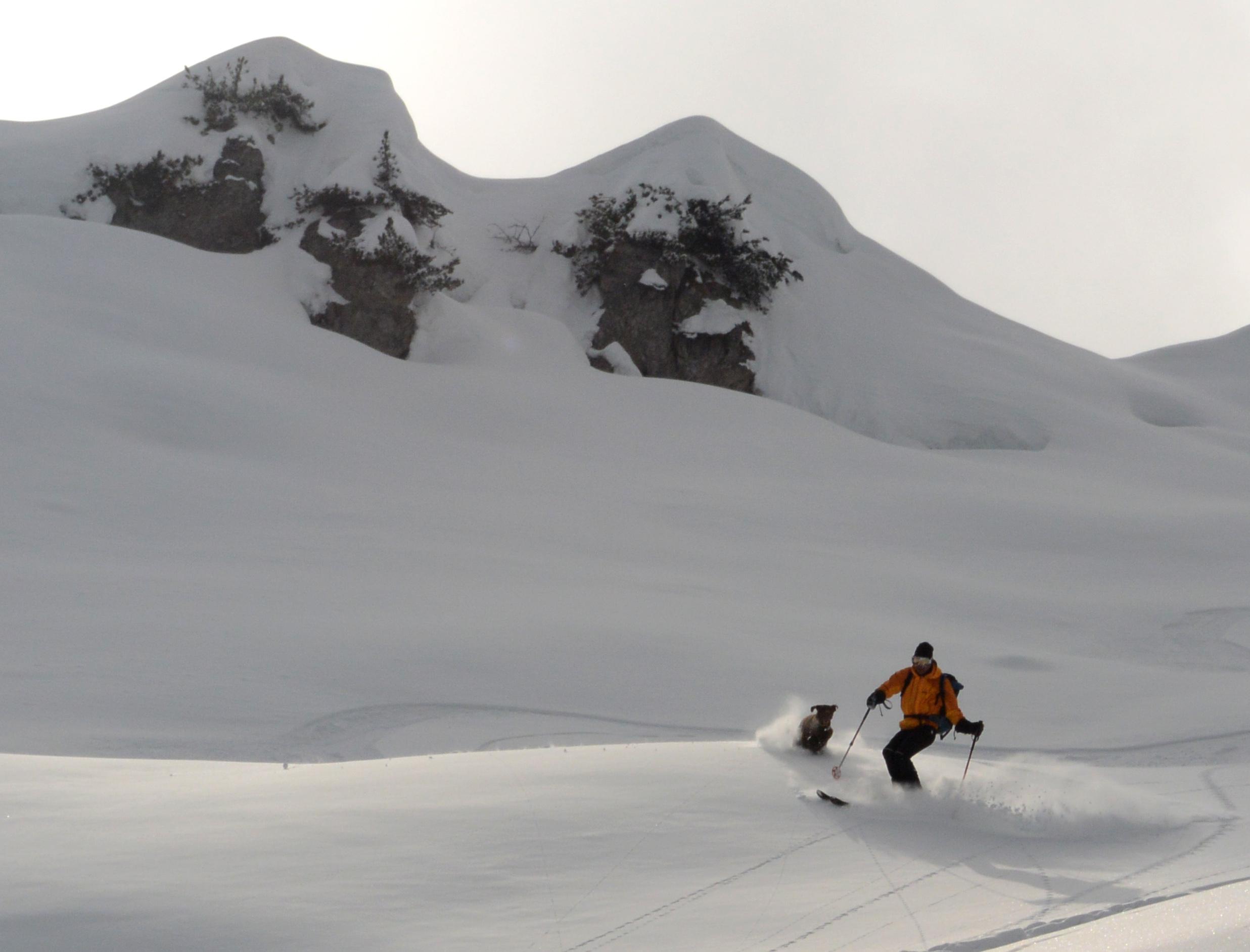 Die Abfahrt ist unerwartet genussreich, 10cm Pulver auf einem tragenden Harschdeckel.