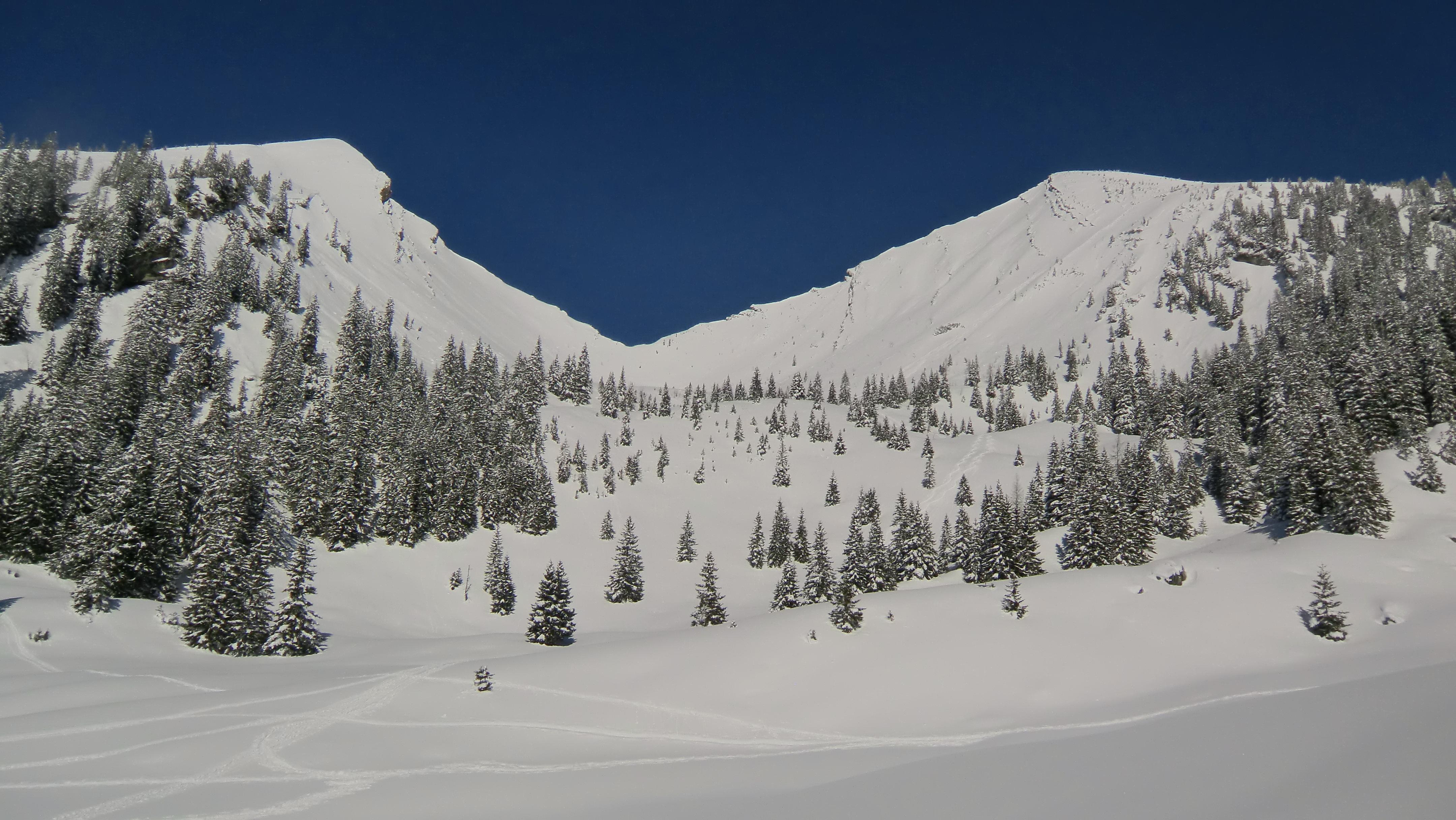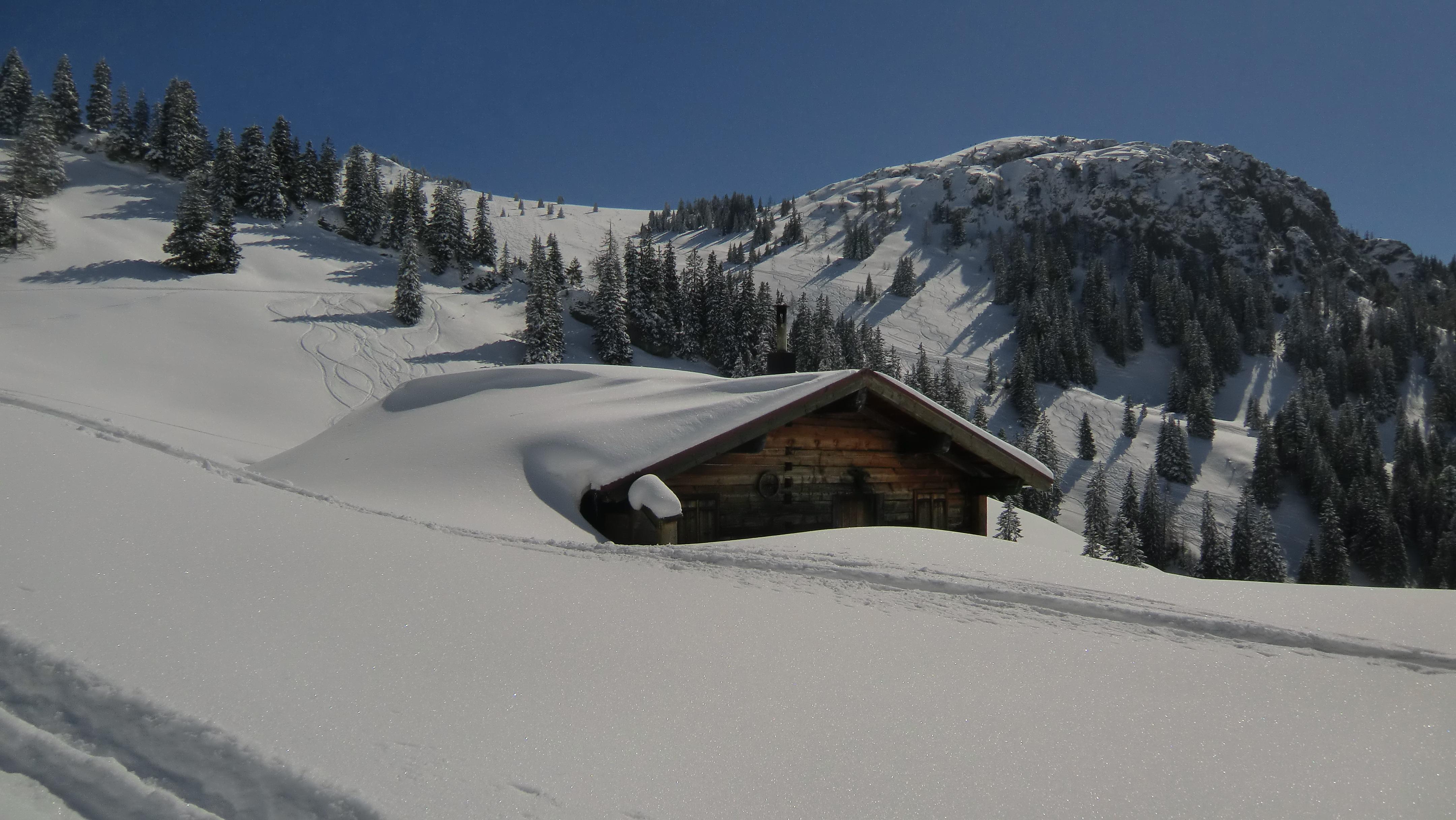 Heute hat es die Vorsichtigen alle ins Heutal verschlagen. Dort herrschten grandiose Bedingungen - hatte man erstmal die Schlüsselstelle (=Parkplatzsuche) gemeistert - mit ca. 30 cm Neuschnee der durch den kalten Wind aus Süd bis West ab 1500m ganz gut konserviert wurde. Unterhalb 1500m hat ihn die Sonne angewärmt, wobei in den Waldpassagen auch dort pulvrige Verhältnisse herrschten. Tiefwinterlich heute - mit der angekündigten Erwärmung und dem aufkommenden Fön wird der Zauber leider nicht lange anhalten.