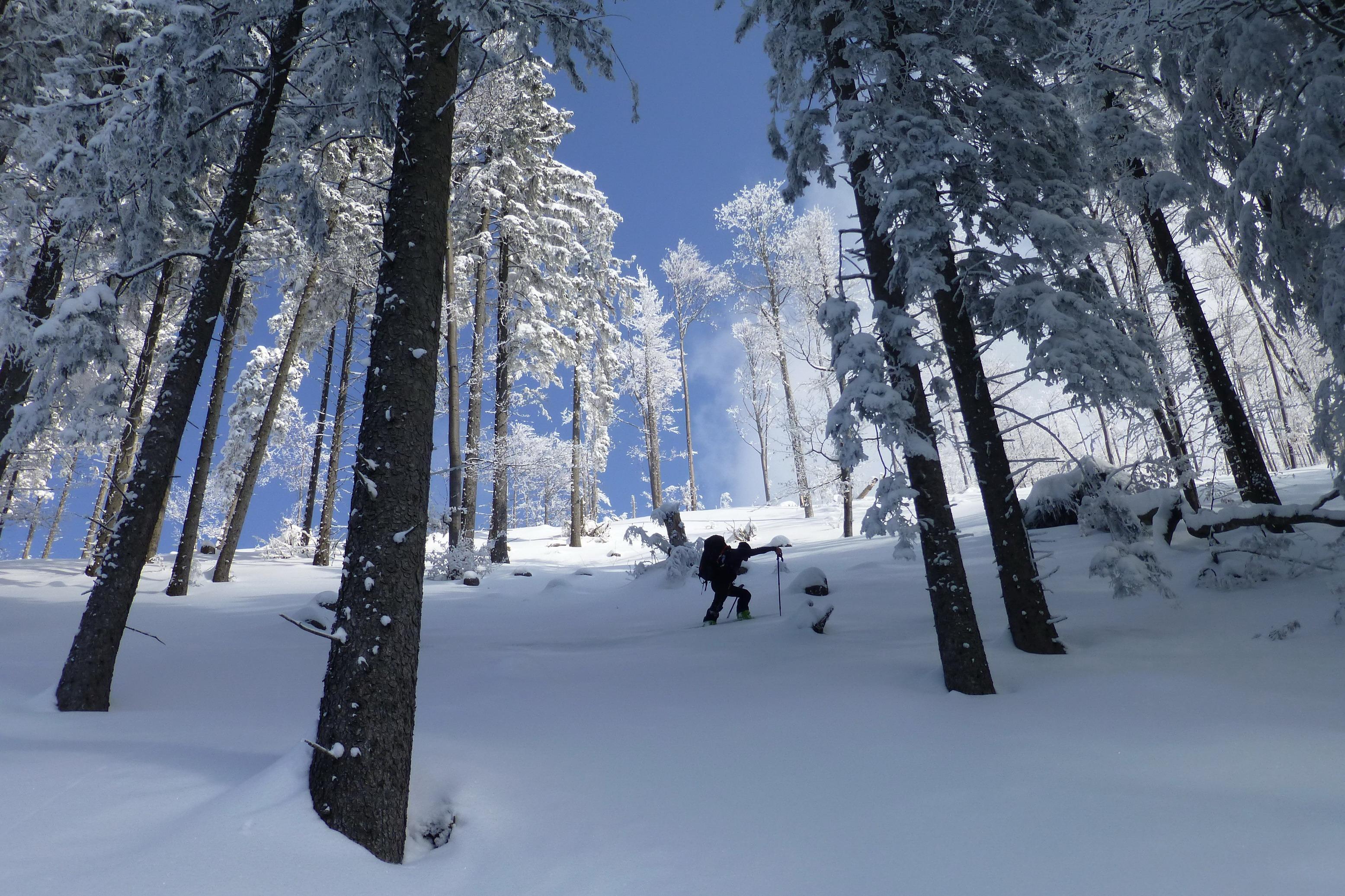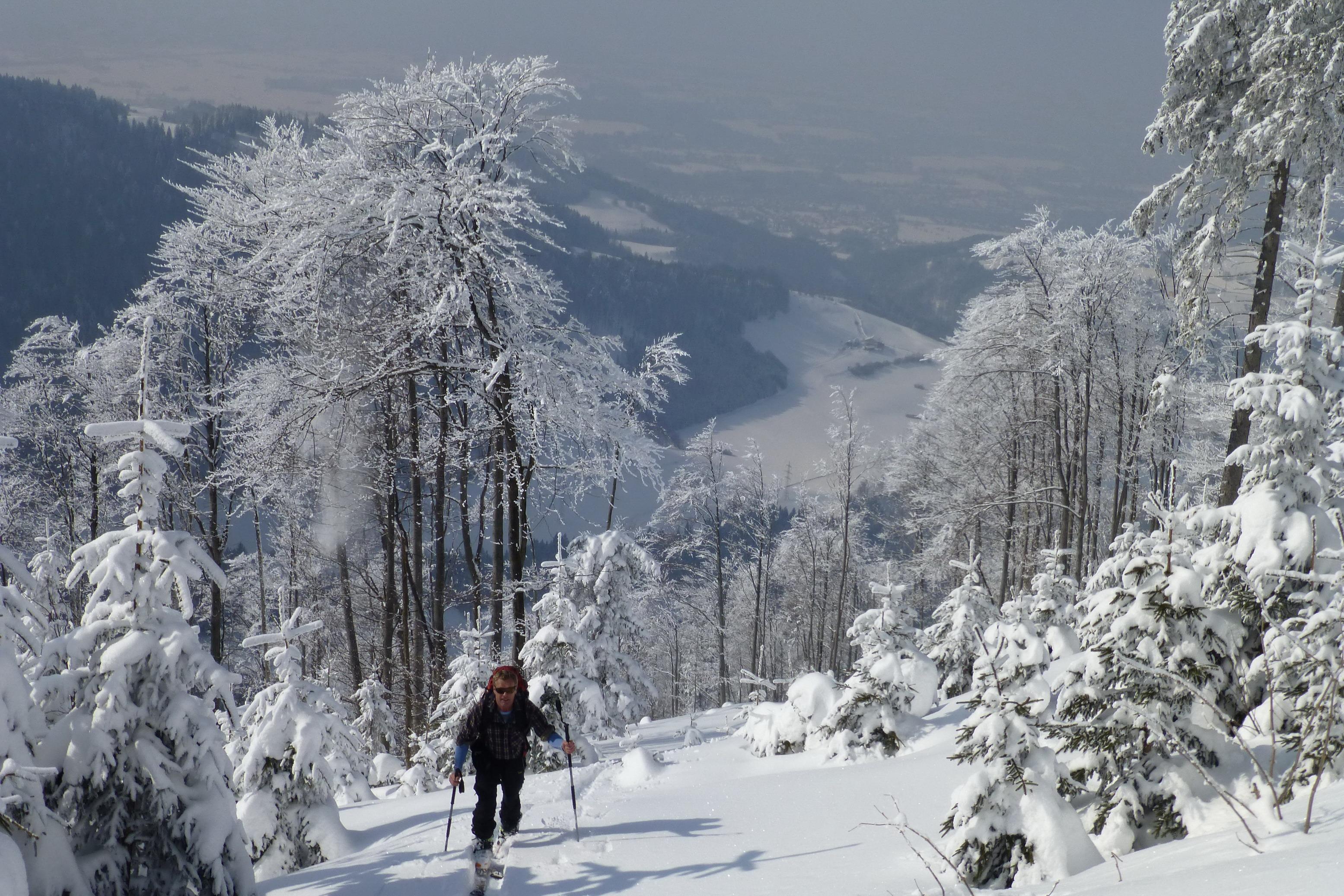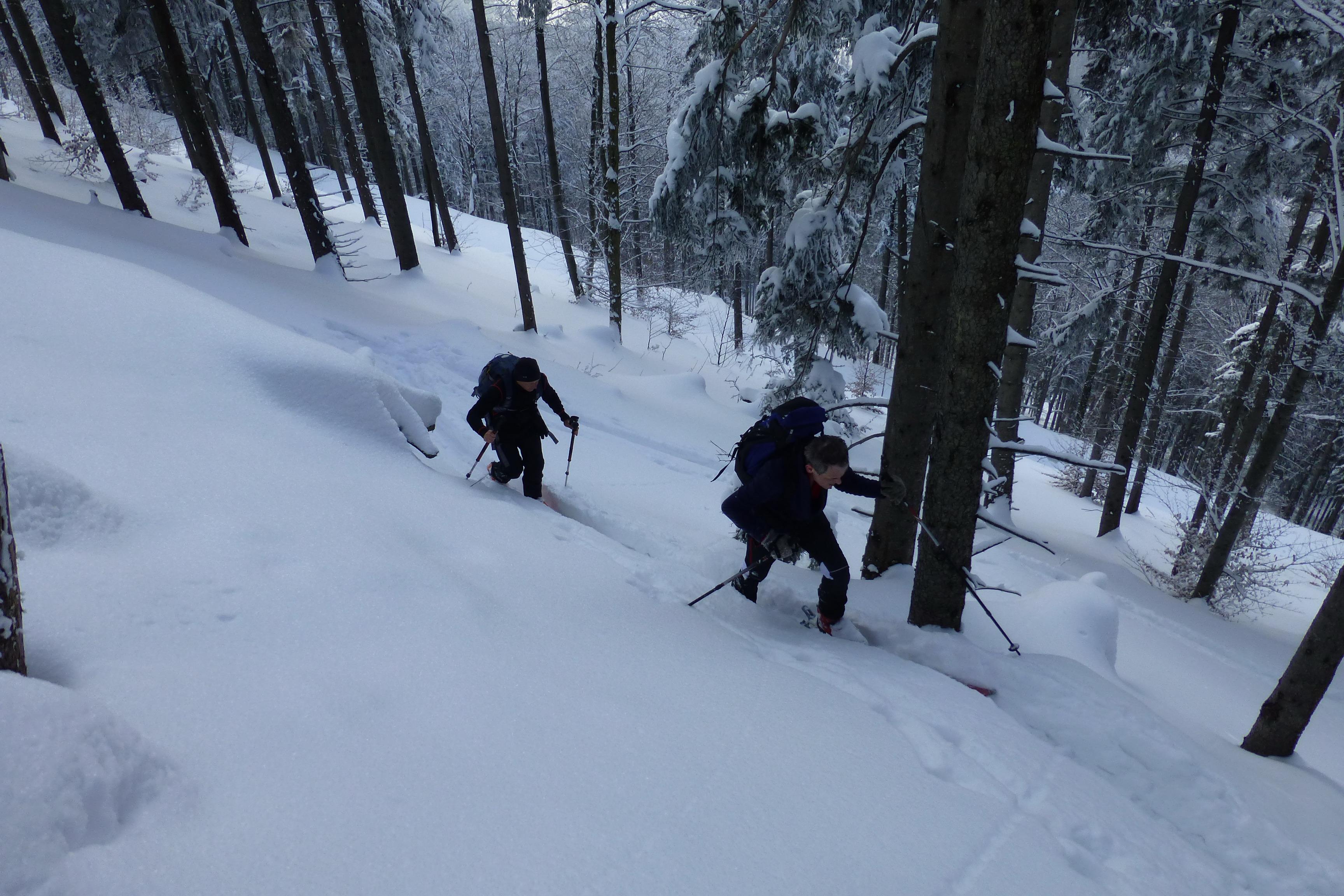 - vereinzelt war während des Spurens im Hochwald ein Gleithorizont ca. in 20 - 25 cm Tiefe spürbar (vermutlich auch eingeschneiter Oberflächenreif) - im großen und ganzen aber eine ziemlich spannungsfreie Schneeoberfläche