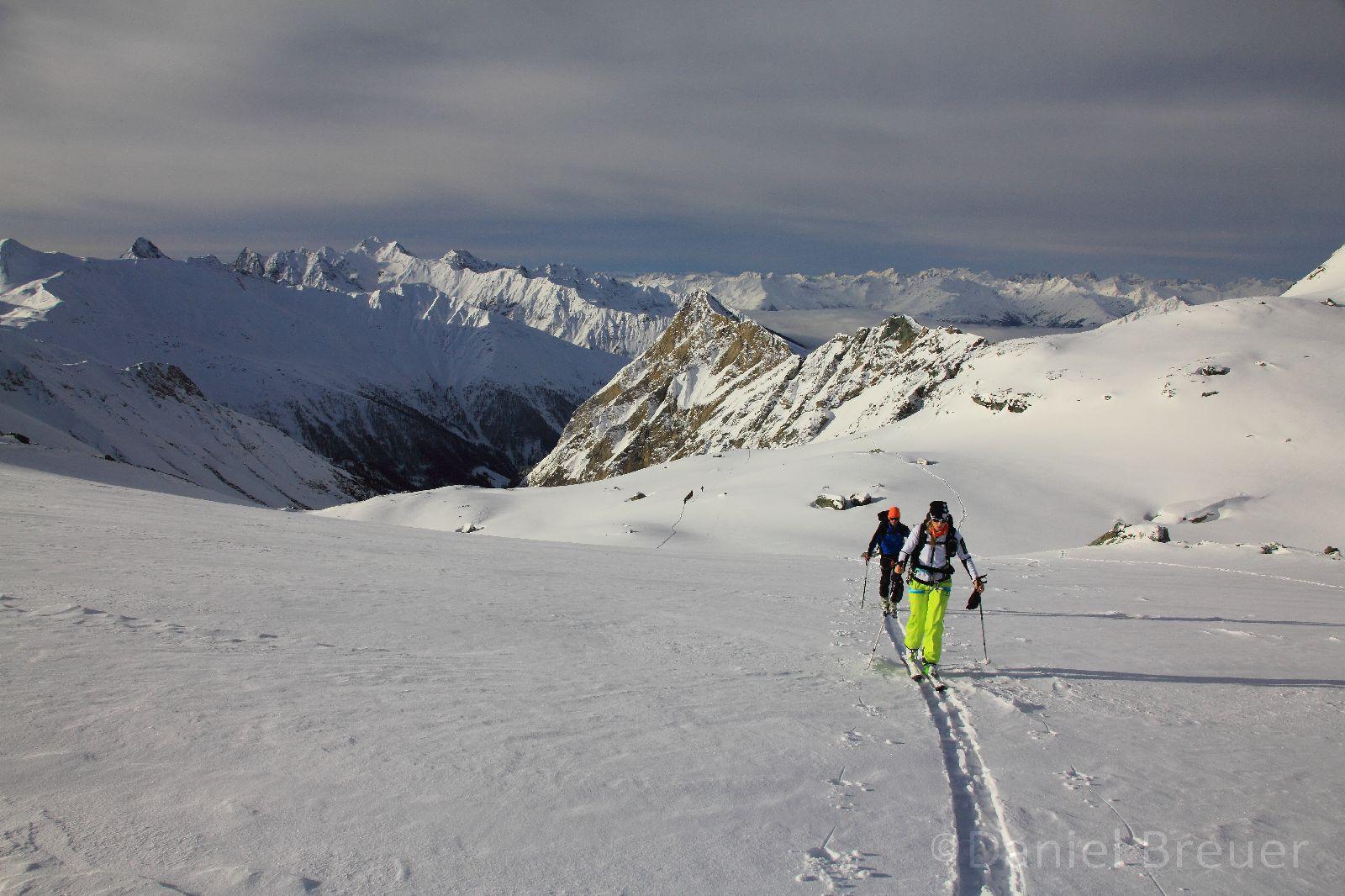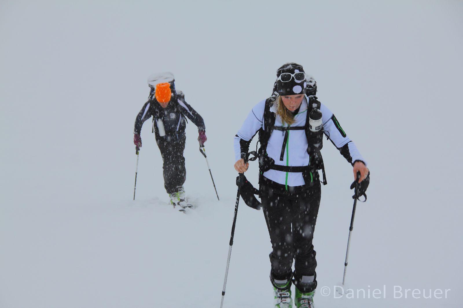Wetter: Freitag Nebel und leichter Schneefall. Nullgradgrenze auf ca. 1900m; Samstag anfangs wolkenlos und gute Fernsicht. Im lauf des Tages Wetterverschlechterung und auflebender Südwestwind. Gegen Mittag Nebel und leichter Schneefall (Schneefallgrenze bei ca. 1800m).