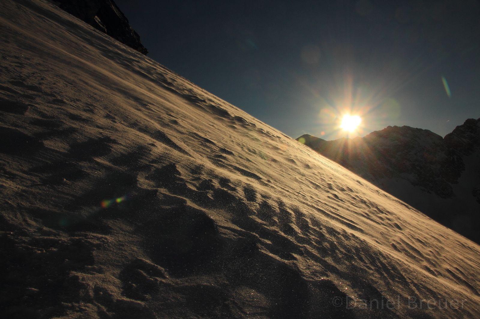 Schnee: 10-15cm Neuschnee auf solider Basis (Harsch). Unterhalb von 2500m war der Neuschnee oberflächlich leicht angefeuchtet, oberhalb pulvrig. In Kammnähe wurde der Neuschnee vom Westwind verfrachtet und bildet im Lee kleinräumige Triebschneeansammlungen.