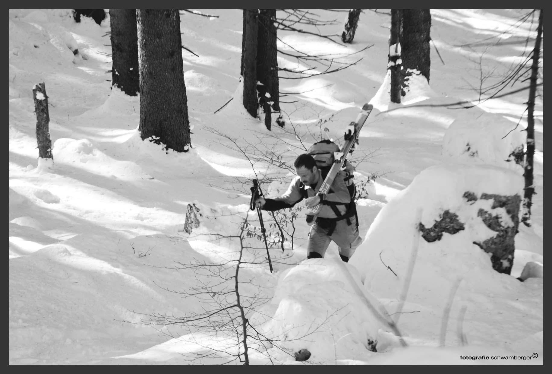 Ausgangspunkt Langwies, die ersten 500hm sind die Ski entlang des Sommerweges zu tragen, ab ca. 1000m ganz gute Schneelage.