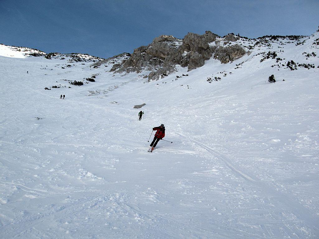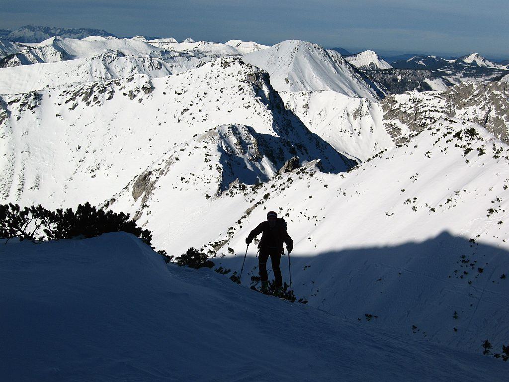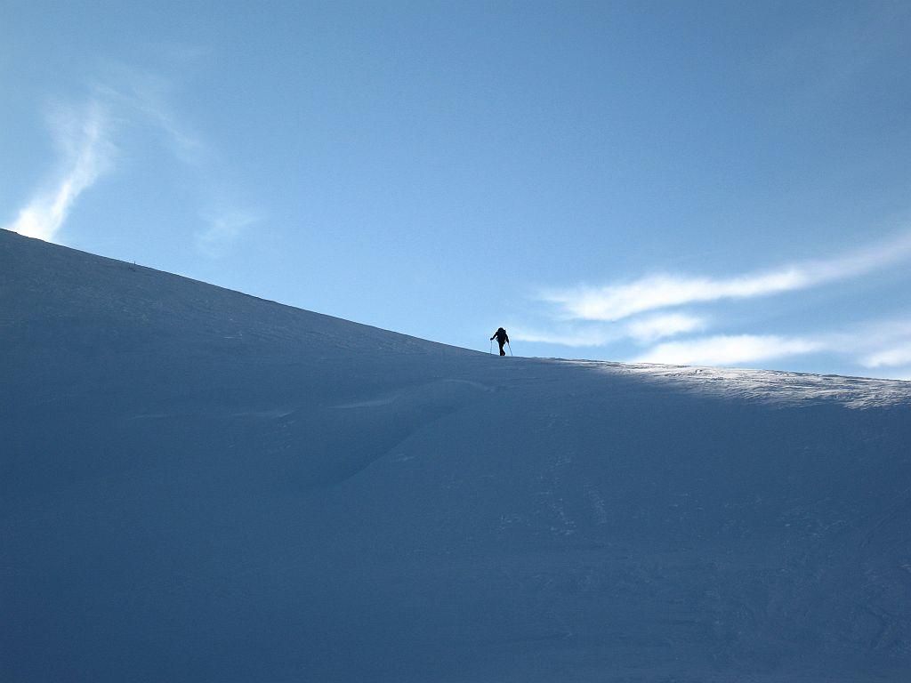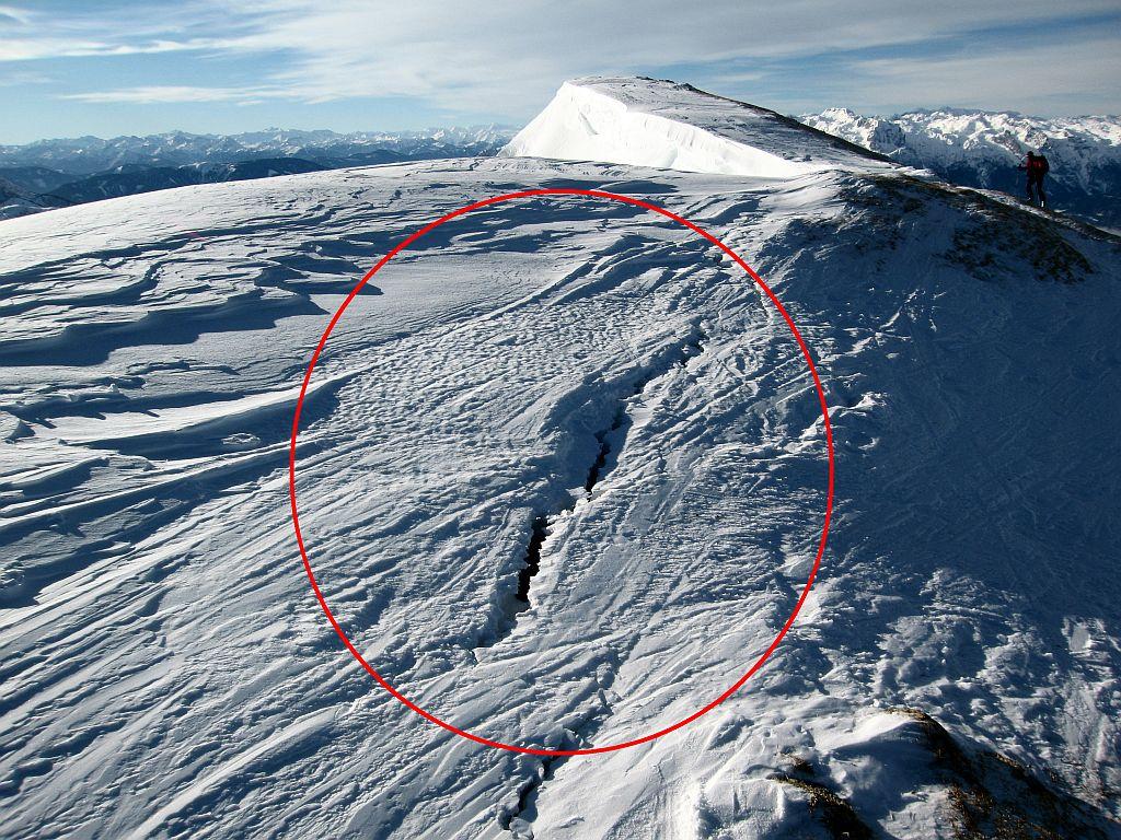 Schneesituation: Der letzte Neuschnee hat sich durch Wärme, Wind und im unteren Bereich auch Regen gesetzt. Durch die Bekanntheit der Tour ist es bereits ziemlich ausgefahren. Der Gipfelrücken wie immer abgeblasen, heute aber kaum Wind und relativ warm. Am letzten Stück vor dem Gipfel hat sich wieder eine Wechte gebildet (siehe Bericht von W. Köberl aus dem heurigen Frühjahr http://www.lawine.salzburg.at/tour/index3.php?id=51540), welche schon einen Riss aufweist. Dies beim Zustieg zum Gipfel berücksichtigen.
