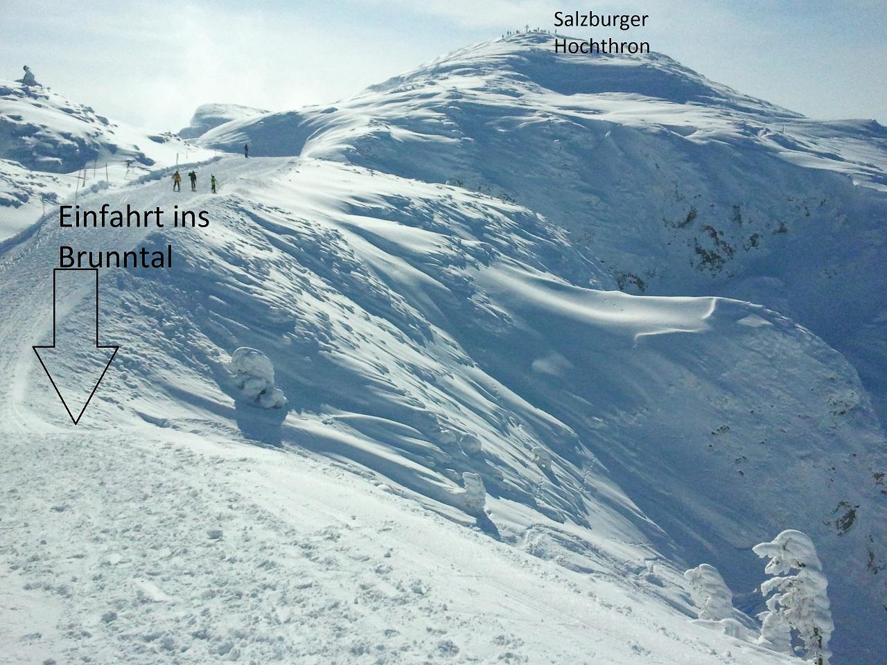 Beeindruckende Abfahrt durchs Große Brunntal am Untersberg. Nur bei sicherer LWS und freier Sicht befahrbar, weil durchgehend steil, aber nicht über 45 Grad und Gefahr von Dolinen und Absturz. Heute sichere Verhältnisse, obwohl