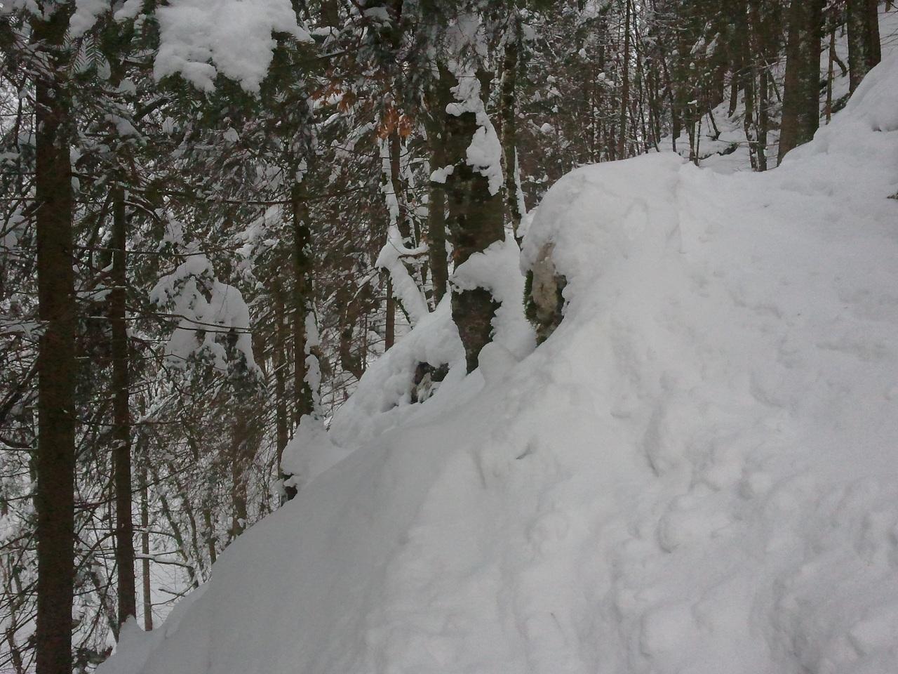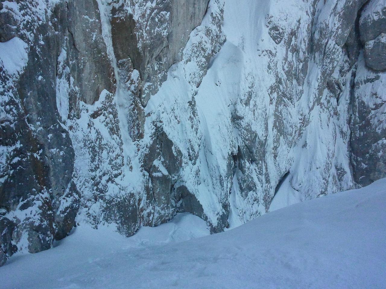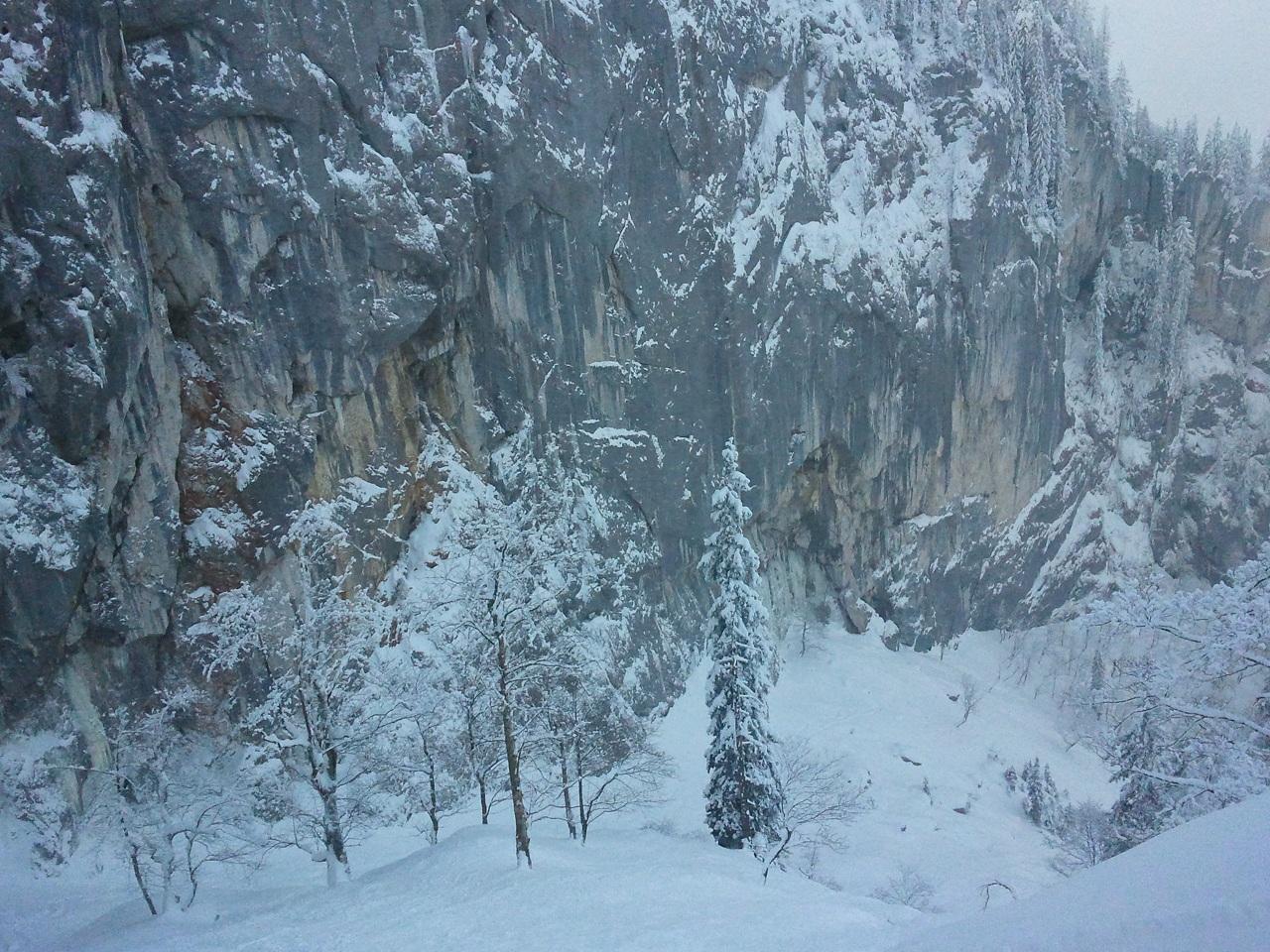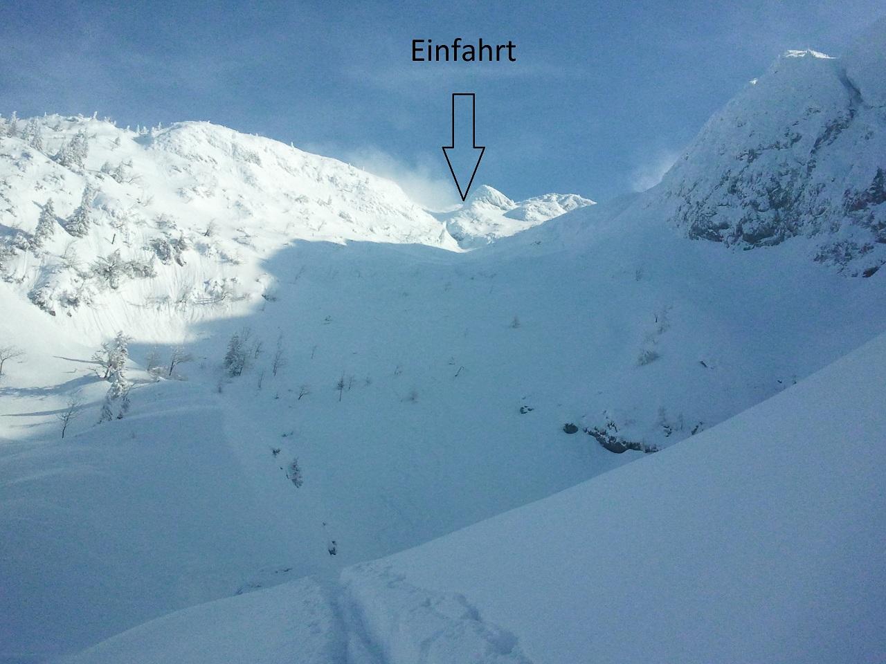 ich zwei Gleitschneerutsche aus dem benachbarten, sehr steilen Gelände gesehen habe. Im oberen Bereich und auch in der steilen Rinne an den Wänden entlang, sehr gute Tiefschneeverhältnisse. Ab der Waldgrenze ist Steinkontakt unvermeidbar. Es gibt für den Neuschnee der letzten Tage keine Unterlage. Spätestens beim Steinbruch müssen die Schi getragen werden, aber da ist der Belag schon arg mitgenommen. Trotzdem, wegen der Nähe bei der Abfahrt zu den 100m (od. mehr ) hohen, senkrechten Wände, ist das beeindruckend.