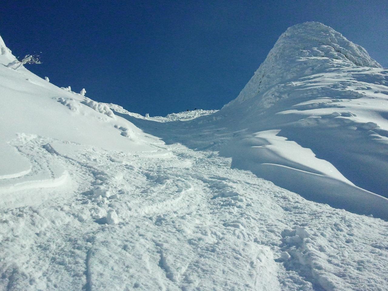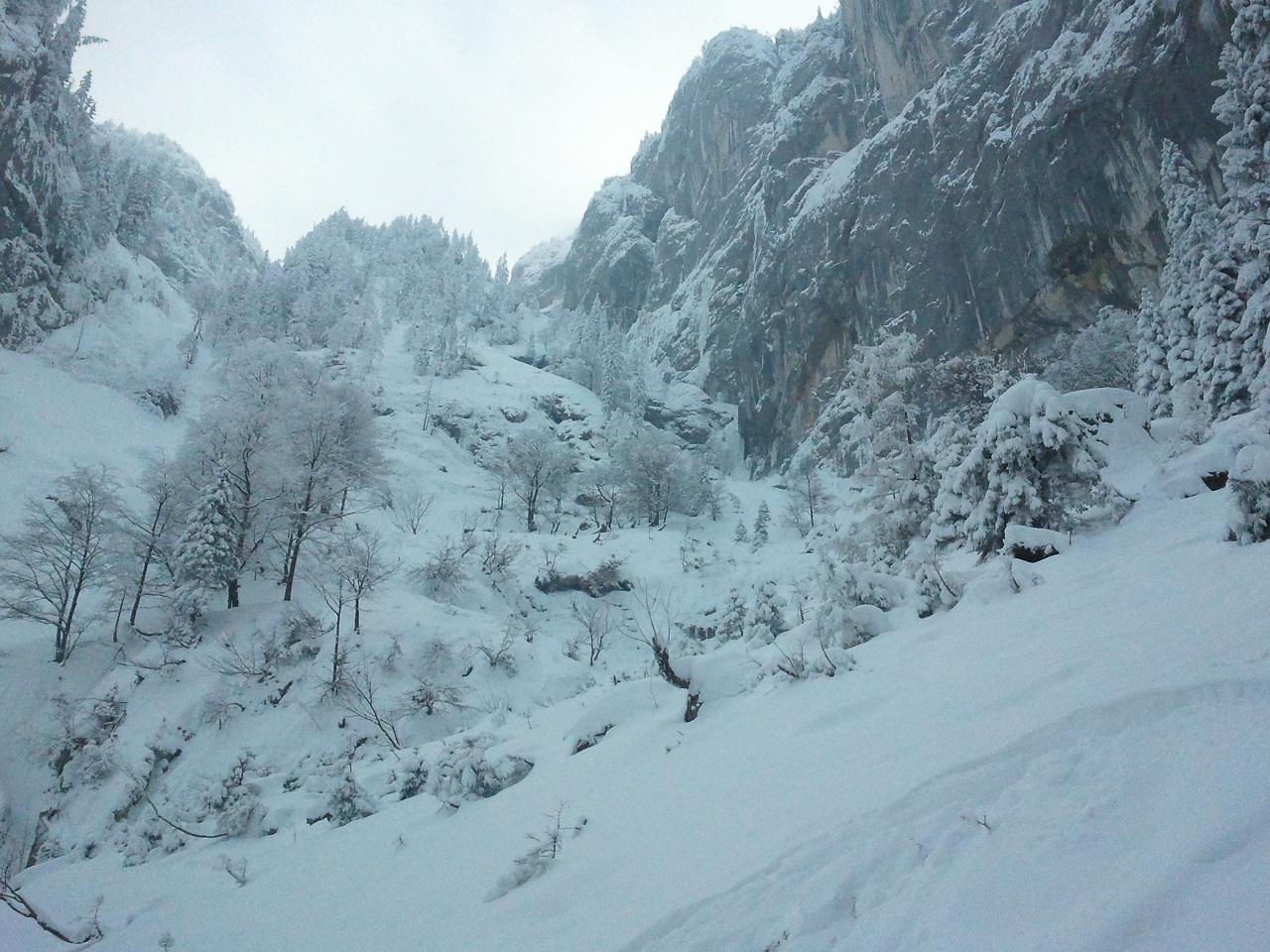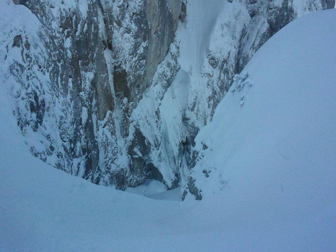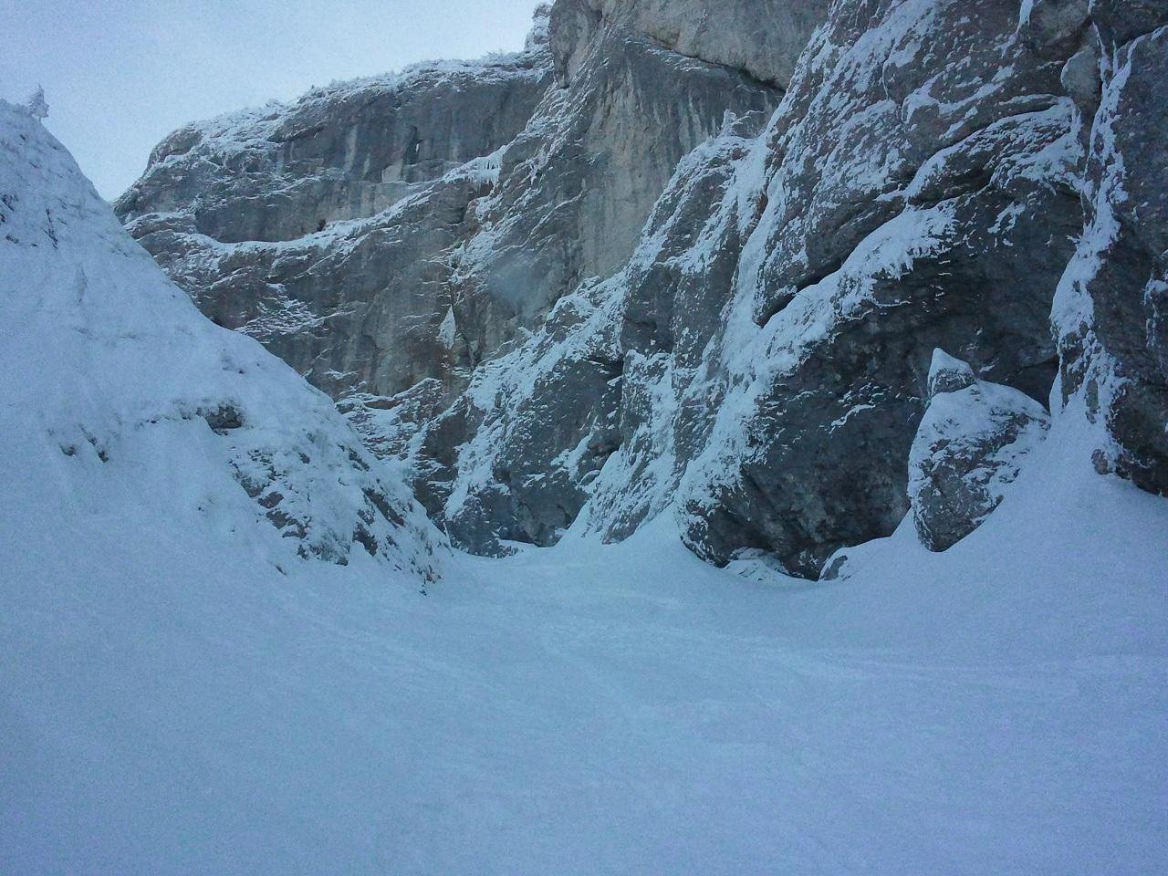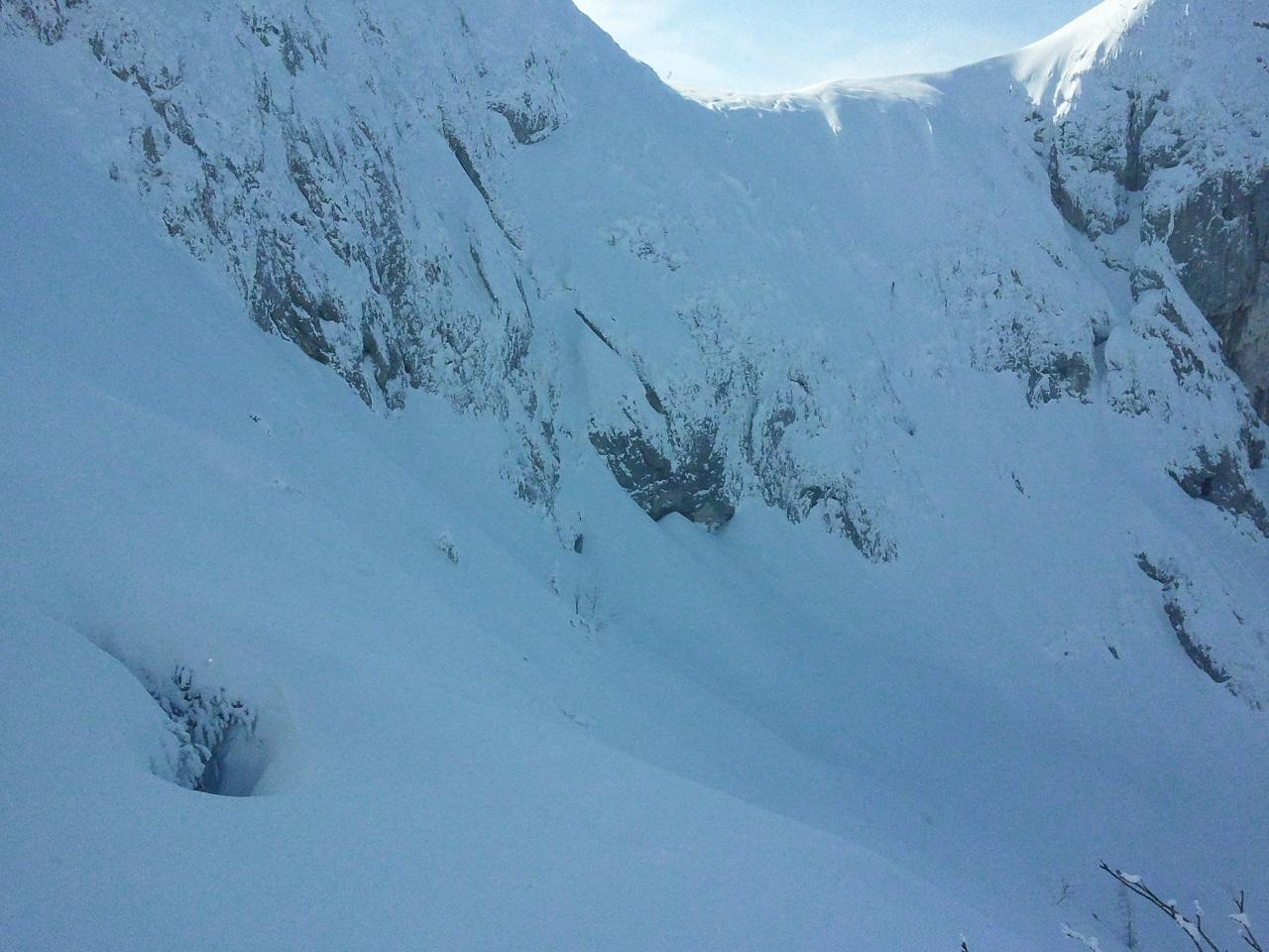 ich zwei Gleitschneerutsche aus dem benachbarten, sehr steilen Gelände gesehen habe. Im oberen Bereich und auch in der steilen Rinne an den Wänden entlang, sehr gute Tiefschneeverhältnisse. Ab der Waldgrenze ist Steinkontakt unvermeidbar. Es gibt für den Neuschnee der letzten Tage keine Unterlage. Spätestens beim Steinbruch müssen die Schi getragen werden, aber da ist der Belag schon arg mitgenommen. Trotzdem, wegen der Nähe bei der Abfahrt zu den 100m (od. mehr ) hohen, senkrechten Wände, ist das beeindruckend.