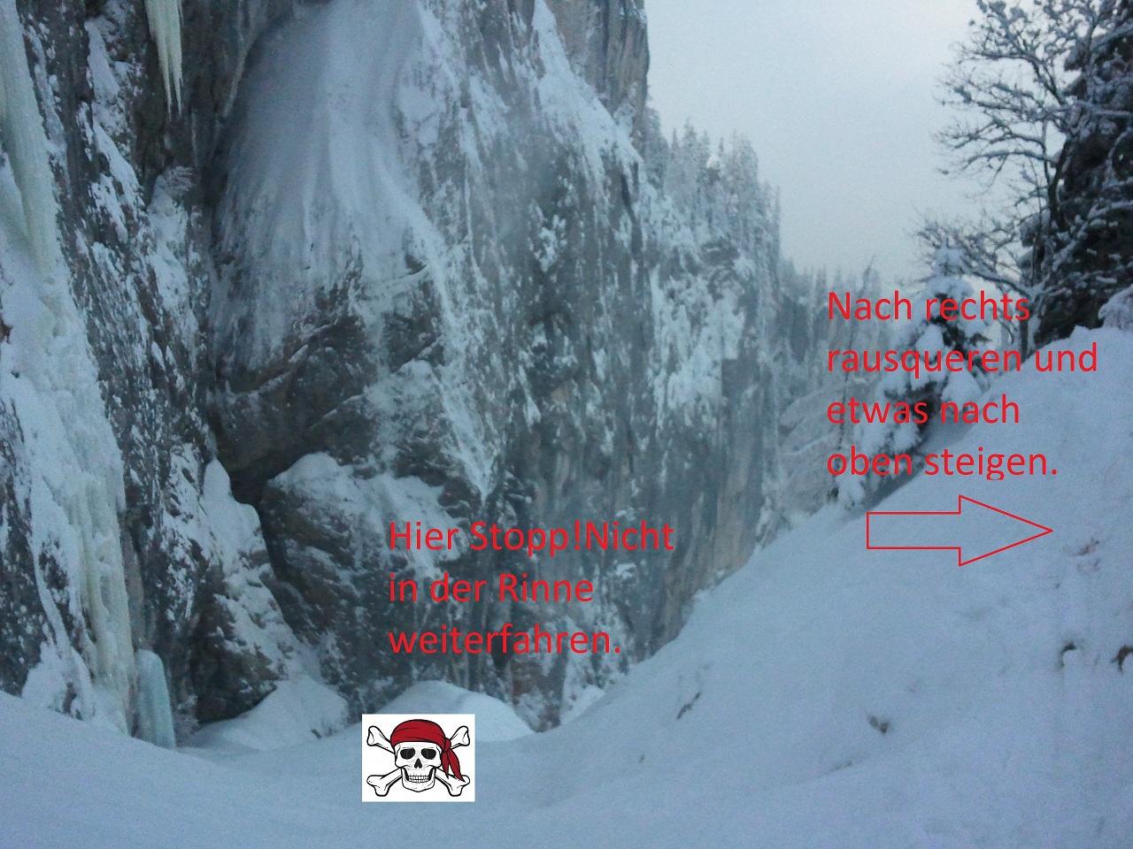 9 Hier Stopp! Querung nach rechts! Unterhalb bricht die Rinne 50m senkrecht ab.