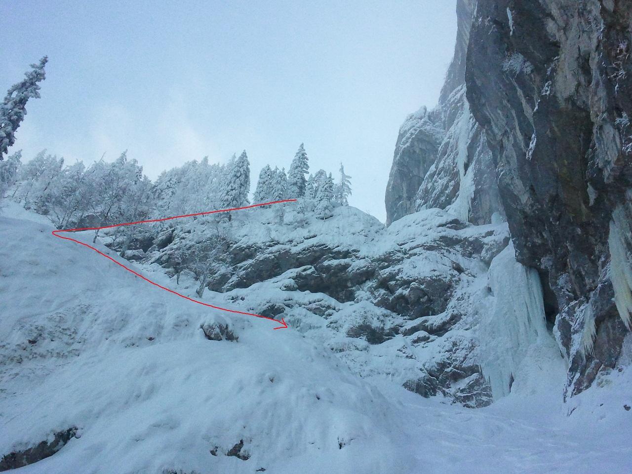 11 Oberhalb des 50m-Abbruches im Abfahrtssinn nach rechts aus der Rinne zwischen den Baeumen in einen steilen Hang hineinqueren. Dieser steile Hang ist sehr lawinenanfaellig!