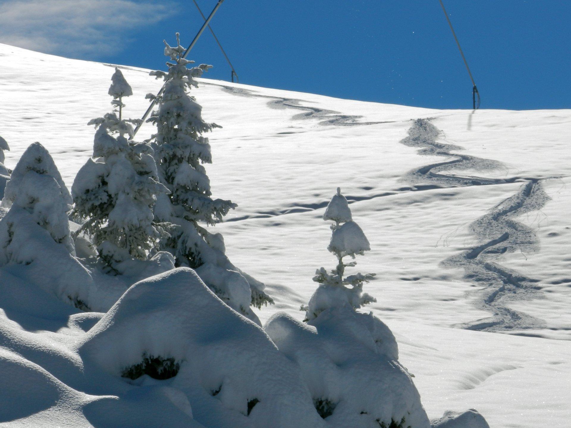 Aufwärts - eine schöne Tour durch frisch verschneite Landschaft. Abwärts - zum Vergessen. Sonnseitig (weiter zur Hanglhöhe) klebt der Schnee, ich bleibe alle paar Meter stecken. Schattseitig Pulver ohne Tragfähigkeit.