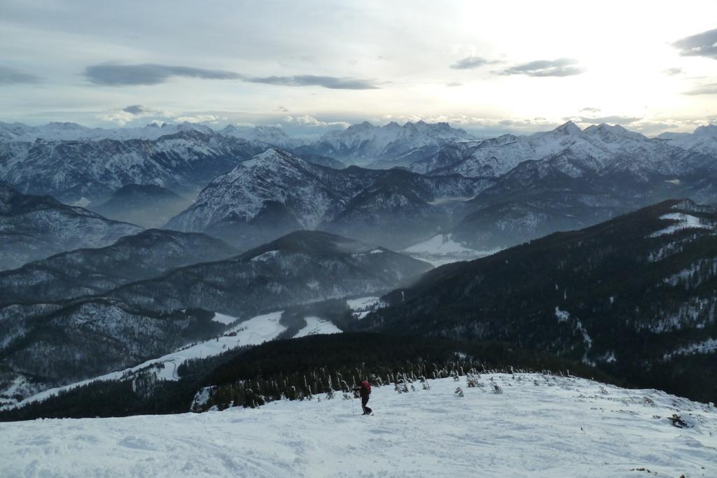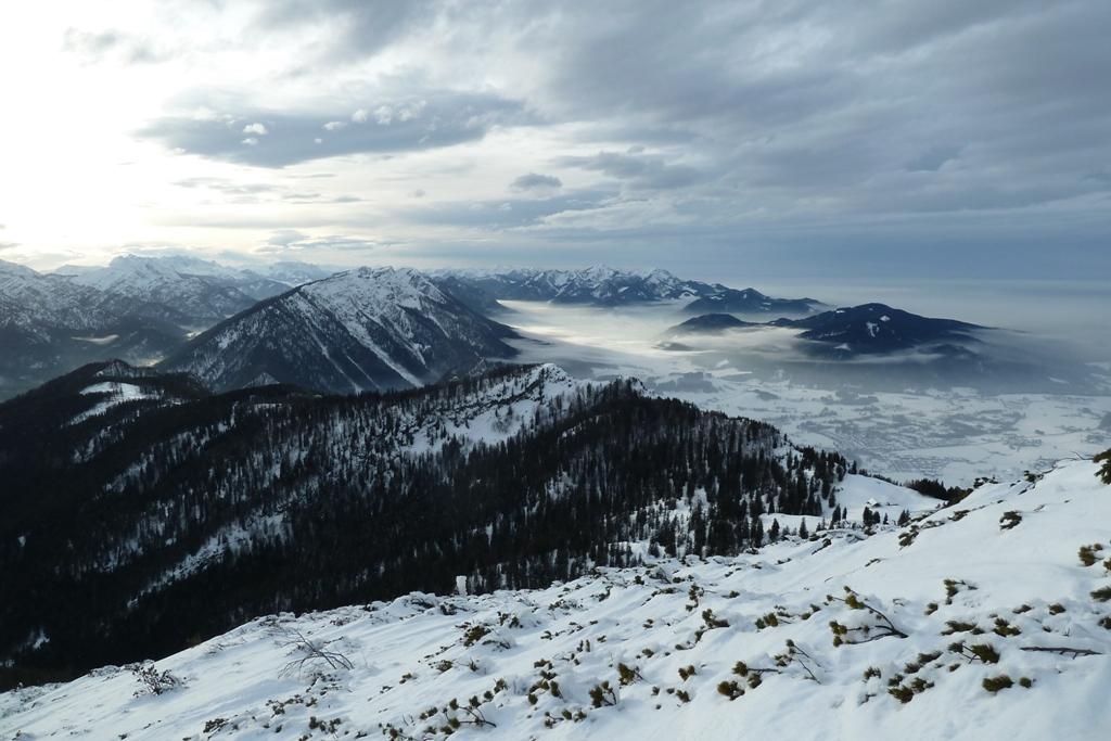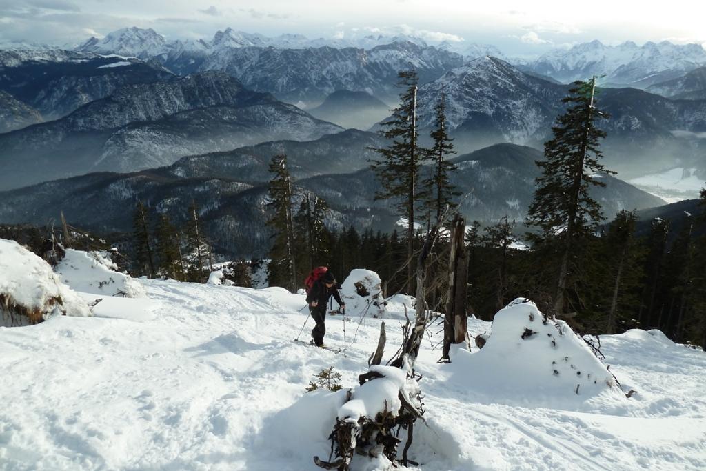 Aufstieg von Jochberg bei Weißbach an der Alpenstraße; 870 Hm, im unteren Bereich längere Zeit im Wald, erst oben freies Gelände. Schneedecke am späten Nachmittag schon sehr durchfeuchtet