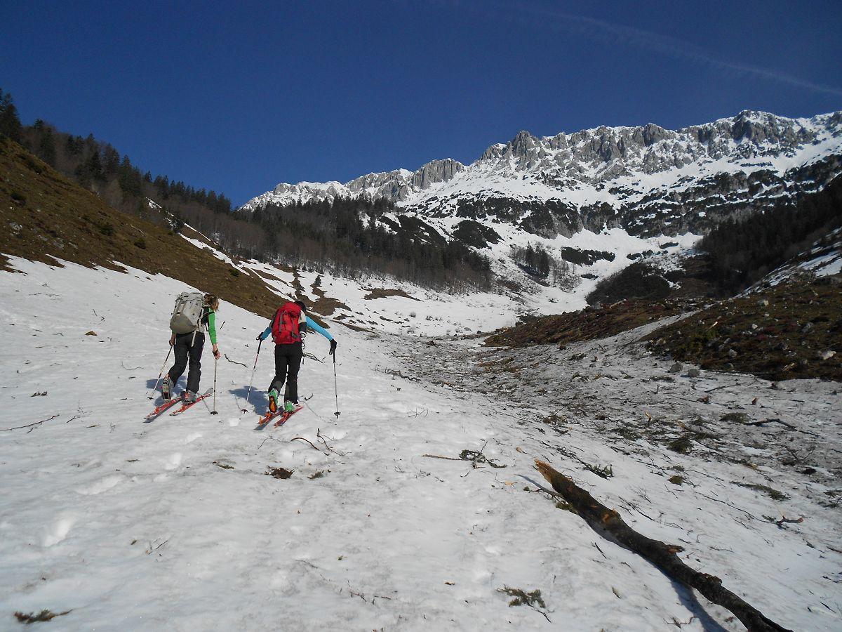 Abfahrt um 12.30 Uhr bei idealen Verhältnissen: weicher Neuschnee, griffig, Sturz- und Abrutschgefahr sehr gering. Ab ca. 1700 m Butterfirn auf glatter Unterlage. Im Lawinenschnee konnte die Schneedecke nicht aufweichen. Ab dem früheren Standort der Wegscheid-Niederalm aper, es sind die Ski 15 bis 20 min. zu tragen.