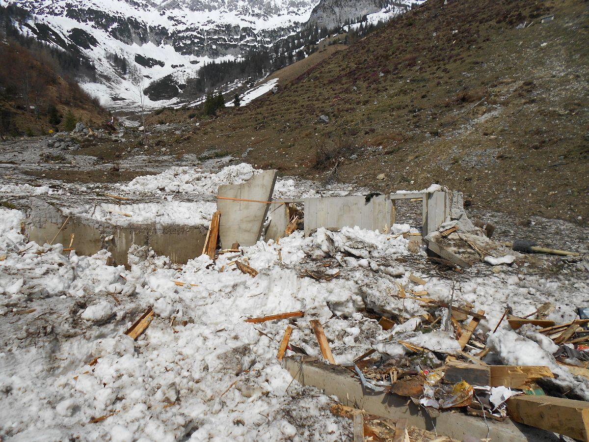Wer die Wucht einer Lawine studieren möchte, schaut sich die Alm und besonders das Wirtschaftsgebäude an: Stahlbeton wurde zerrissen, als ob eine schwere Fliegerbombe eingeschlagen hätte. Alle Geräte zerstört. Heute wurde für die Aufräumarbeiten die Almstraße freigebaggert.