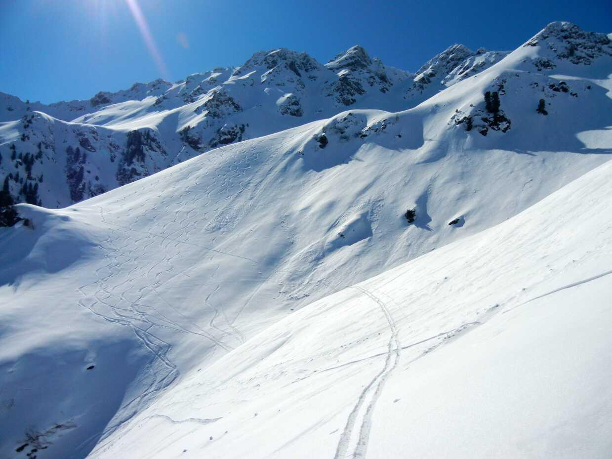 Schnee: am Morgen tragender Harsch, in den besonnten O-Hängen bereits um 9 Uhr T-Shirt-Temperatur und bereits weichwerdende Schneedecke. Oberhalb ca. 1800-1900m nicht tragfähiger Harschdeckel, darunter z.T. pulvriger, z.T. umgewandelter Schnee (Einsinktiefe ca. 10-15cm).