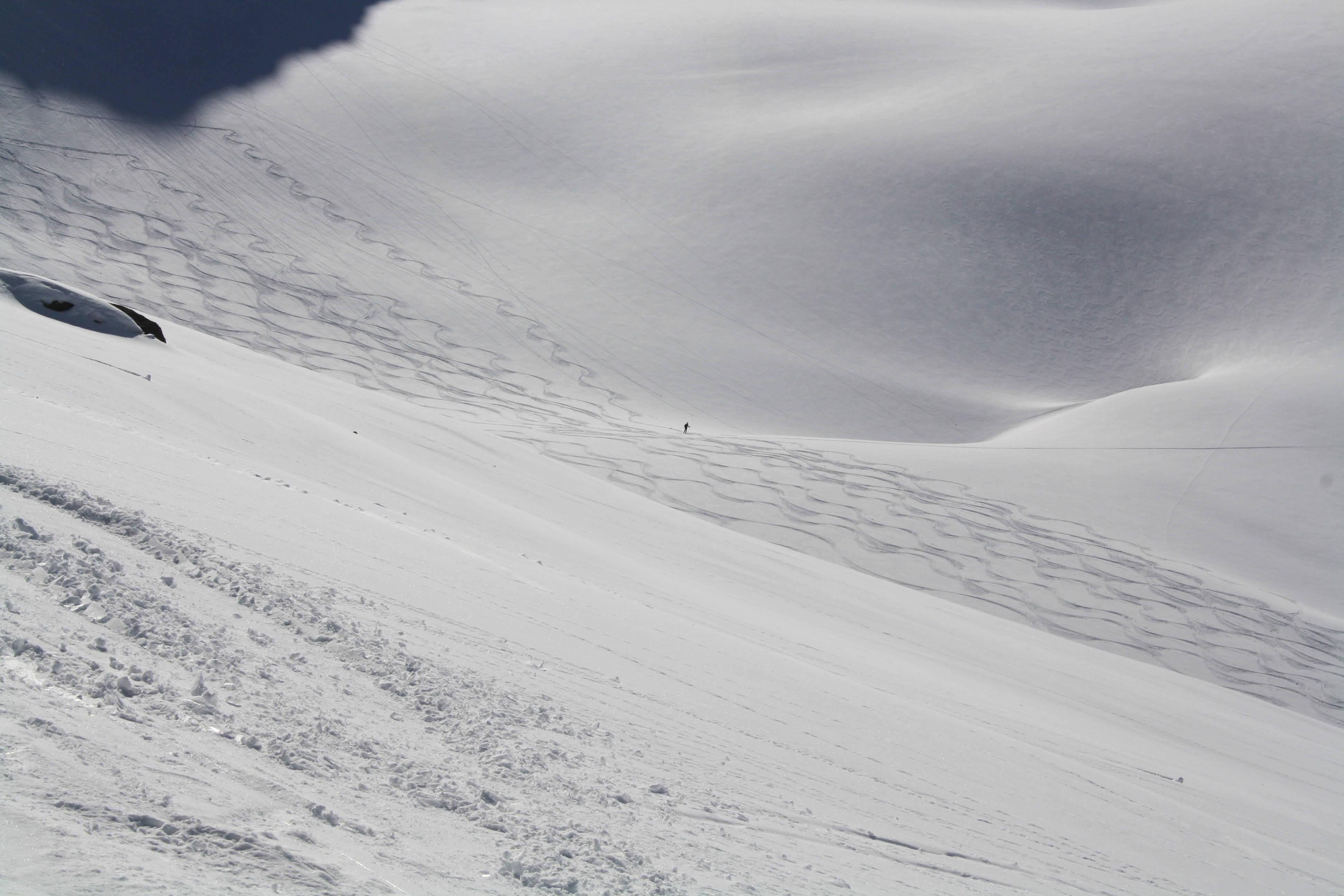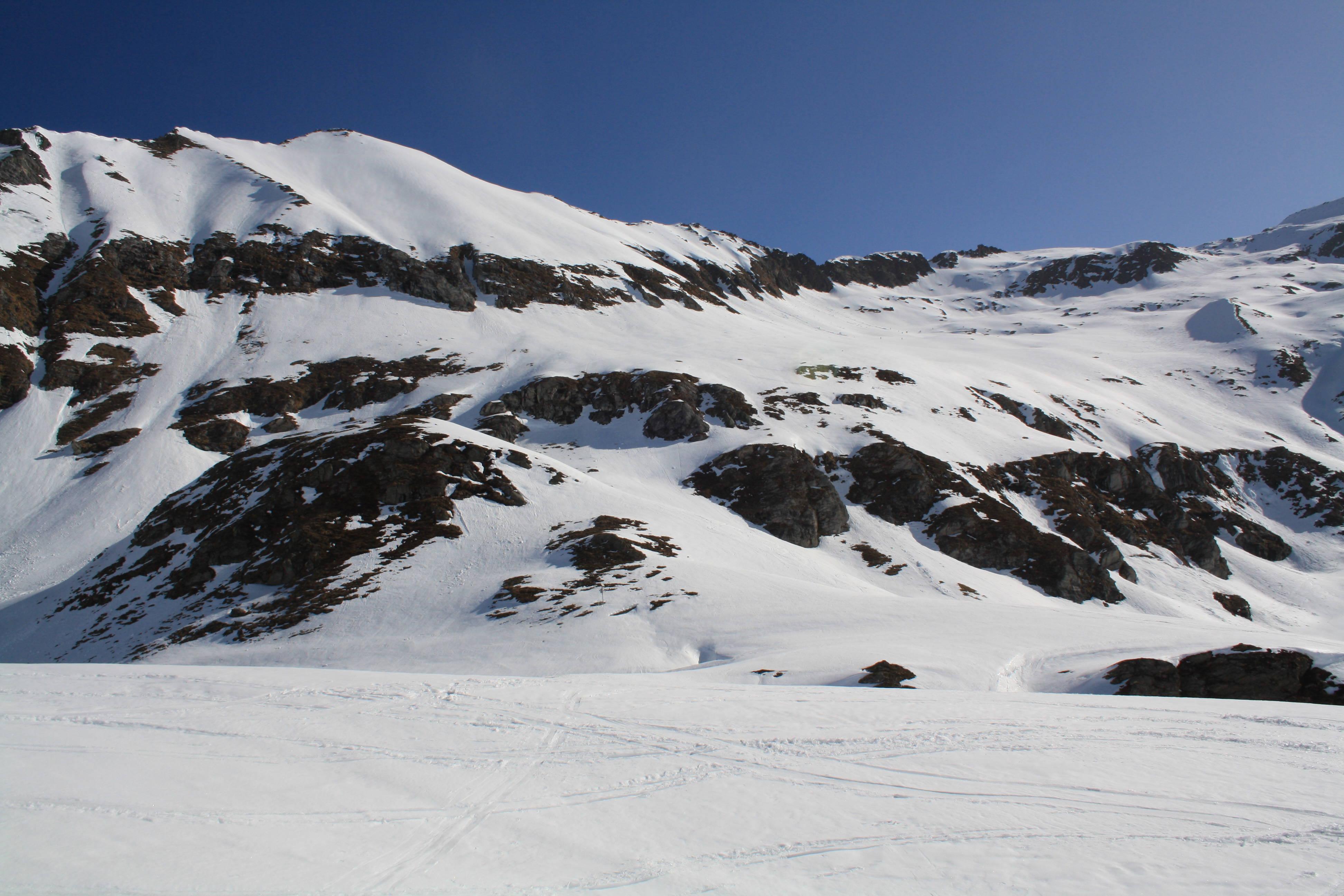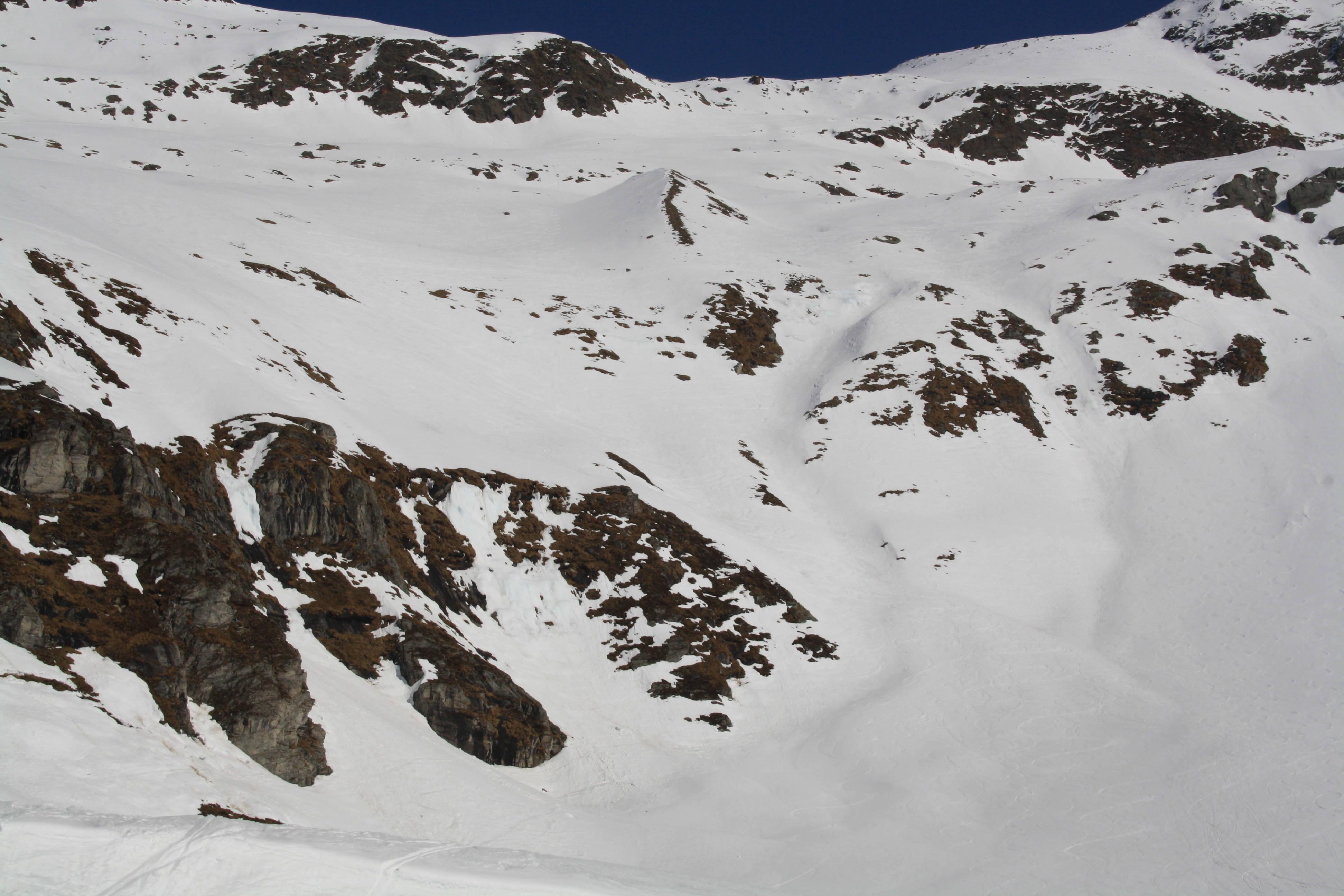 Gute Bedingungen im Ritzenkar. Noch reicht die geschlossene Schneedecke bis zum Parkplatz. Abfahrt bei bestem Firn um kurz nach 10 Uhr. Im obersten Teil muss man sich um diese Uhrzeit in Abfahrtsrichtung rechts halten (steile Rinne hinter einem Felsturm), da der östliche obere Teil des Kares noch im Schatten liegt und sehr hart ist.
