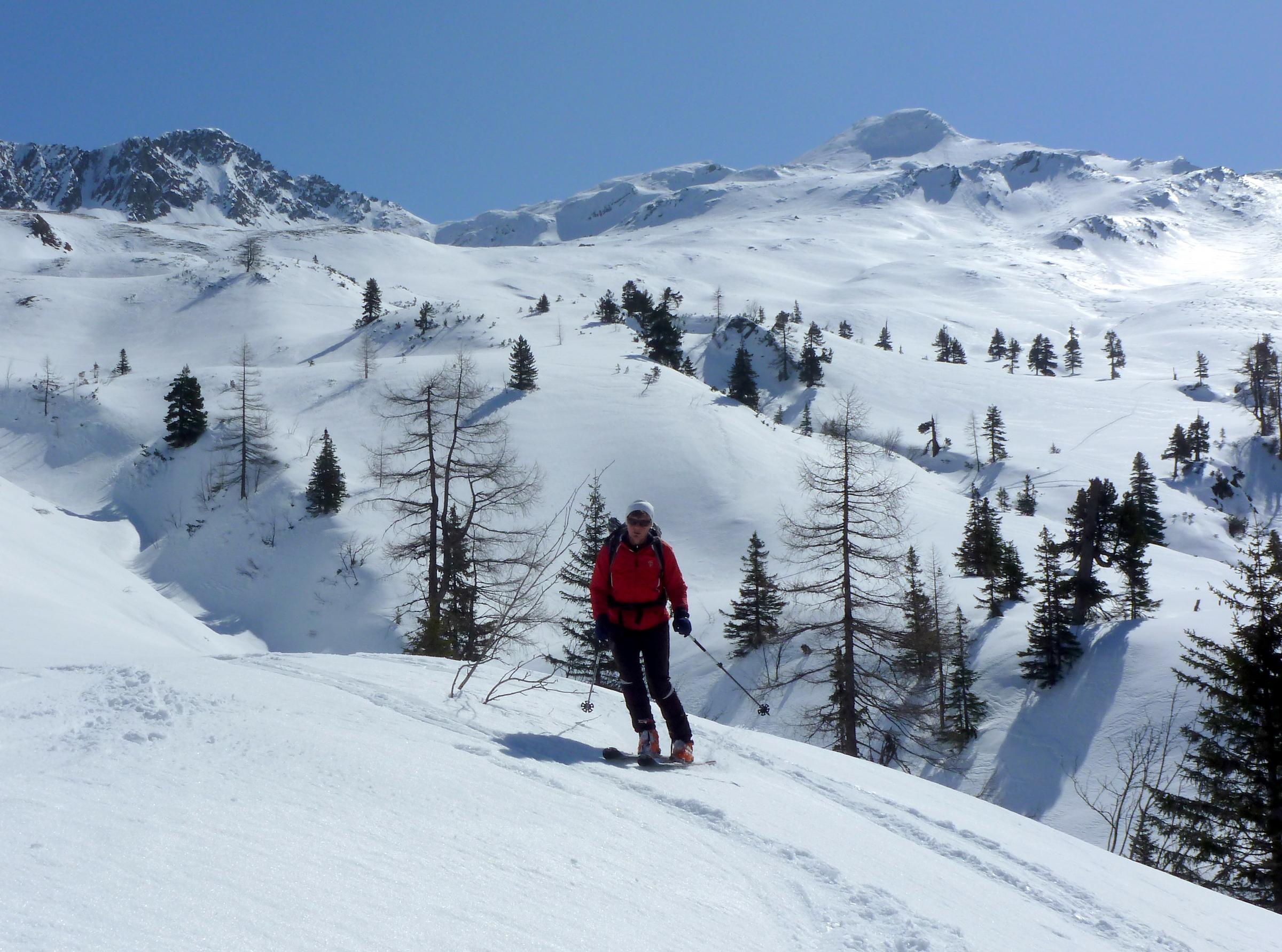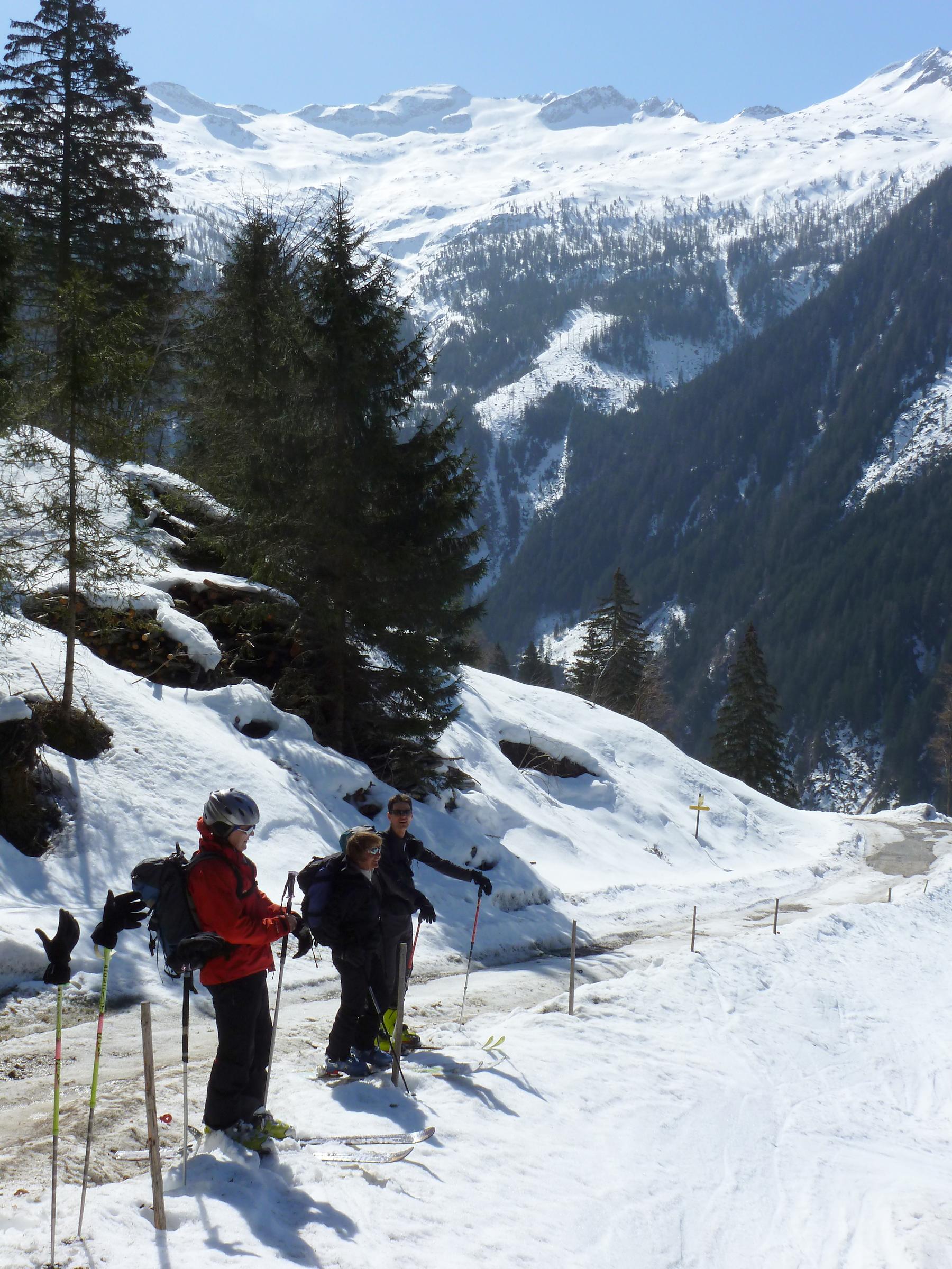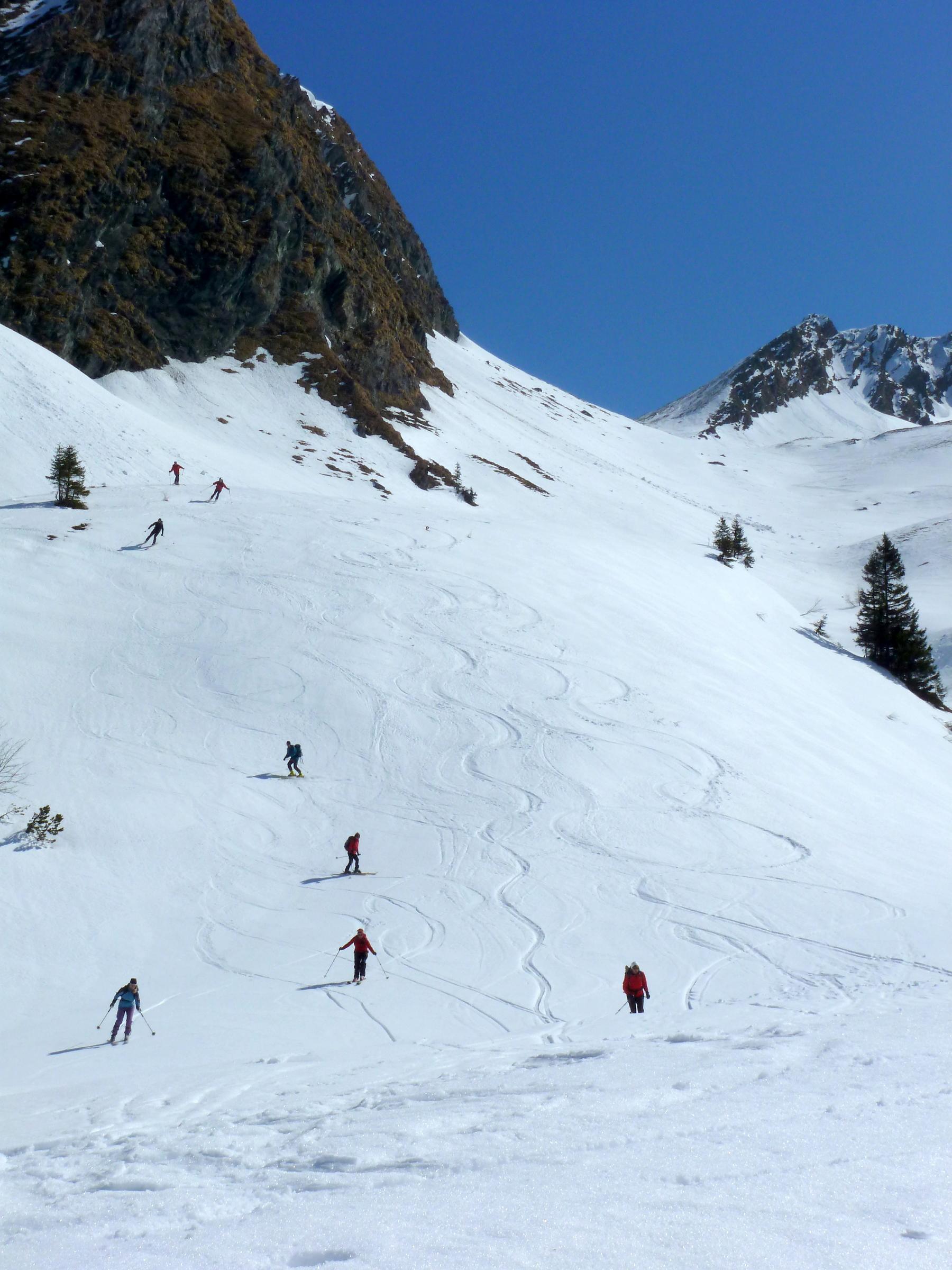 Der Pulver im Kreekar von letzter Woche ist inzwischen weitgehend in Richtung Firn unterwegs, der Glanz in den Fotos von Annamirl H. vom Donnerstag hat sich noch verstärkt, sodass wir heute fast überall gut tragenden Harsch und bei entsprechender Hanglage auch feinen Firn antrafen.