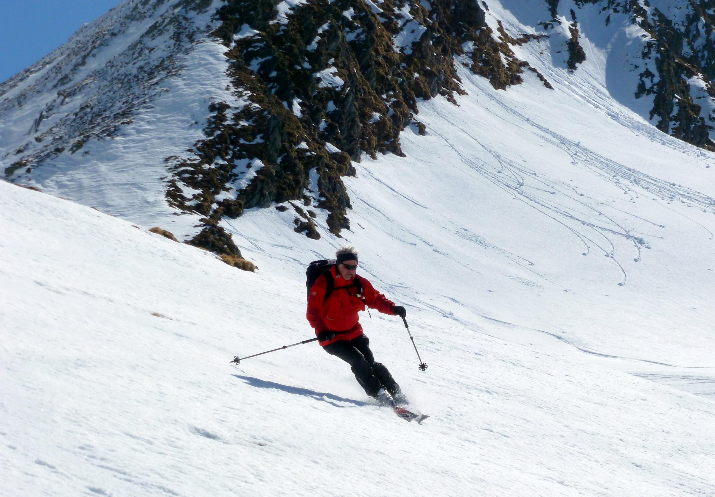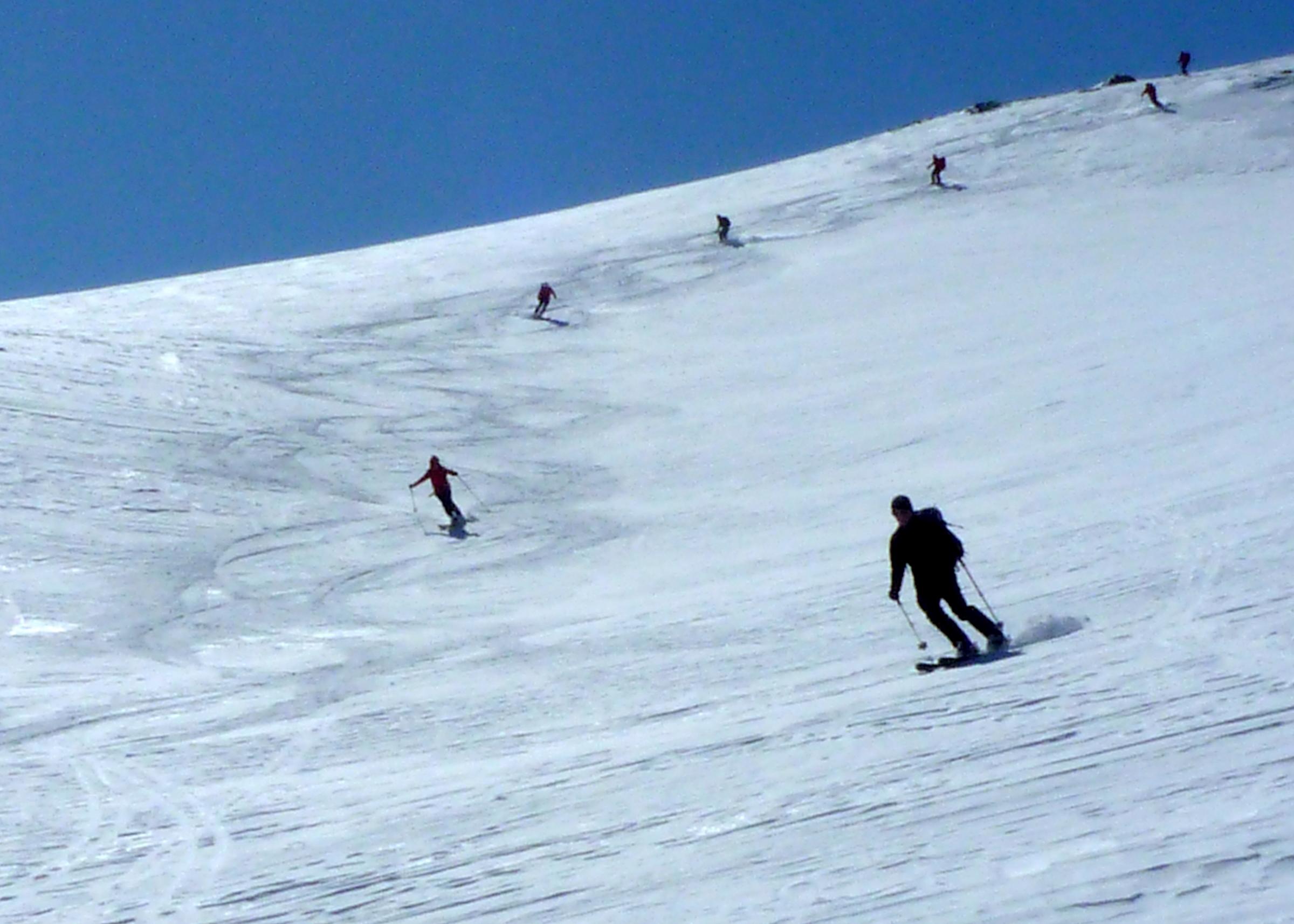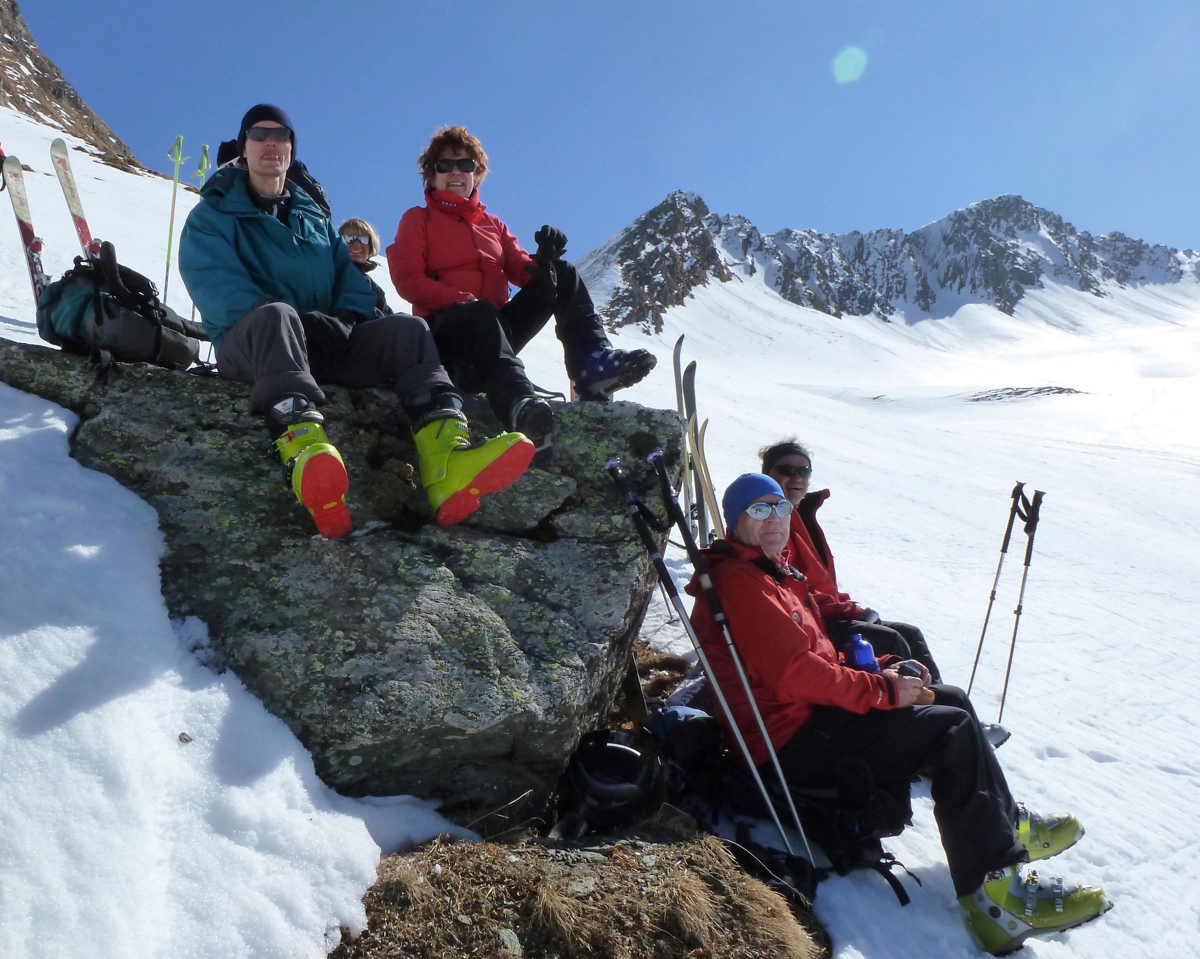 Der Pulver im Kreekar von letzter Woche ist inzwischen weitgehend in Richtung Firn unterwegs, der Glanz in den Fotos von Annamirl H. vom Donnerstag hat sich noch verstärkt, sodass wir heute fast überall gut tragenden Harsch und bei entsprechender Hanglage auch feinen Firn antrafen.