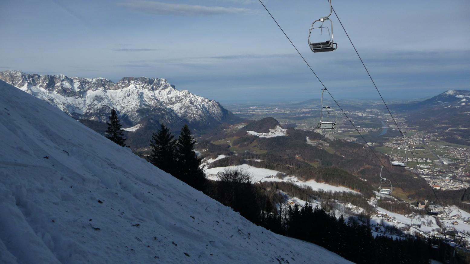 immer wieder lohnende tour in stadtnähe: dürrnberg parkplatz zinkenkogel talstation diretissima auf den zinkenkogel, abfahrt über den osthang bis zum wald (250 hm), auffellen zum rossfeld - kreuz, abfahrt retour inkl. teilstück vom osthang >(weil zwar angestochener, aber noch gut fahrbarer schnee), wieder auffellen zur bergstation, abfahrt über steilhang, retour auch über die wiesen entlang aufstiegsspur ! ungefähr 1100hm !