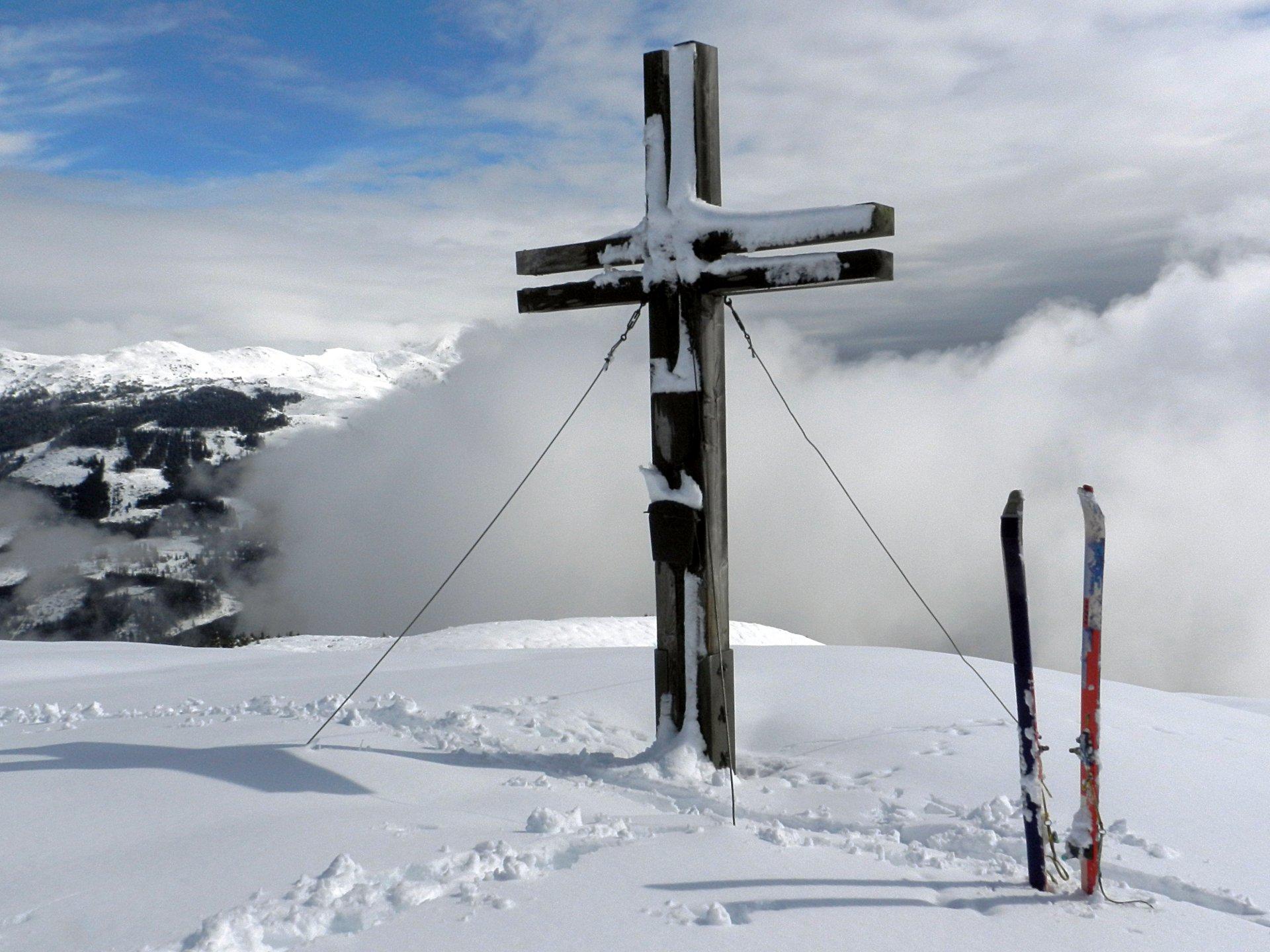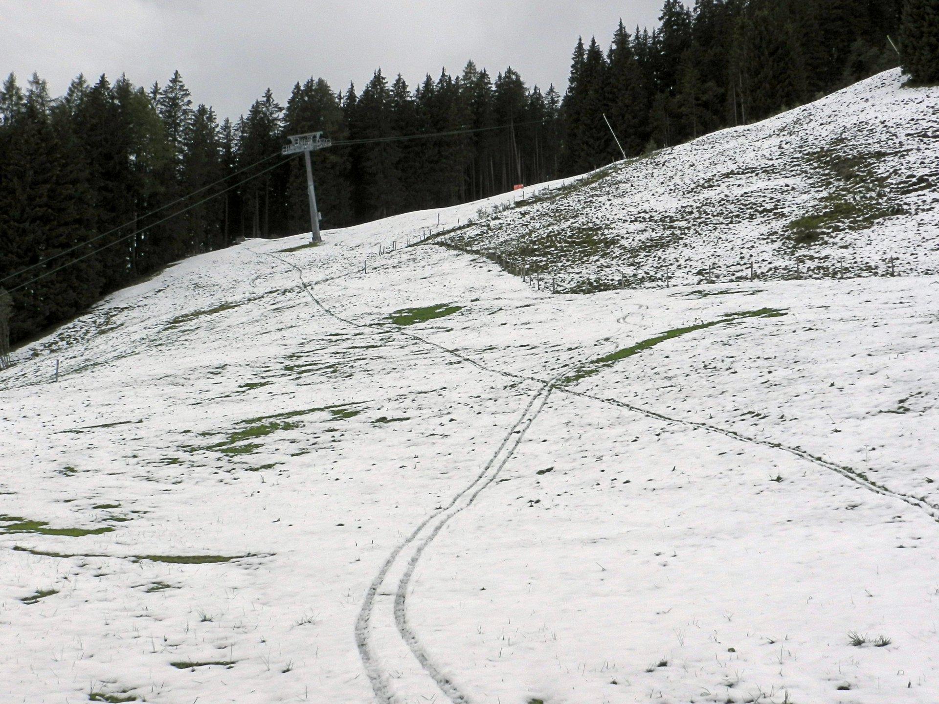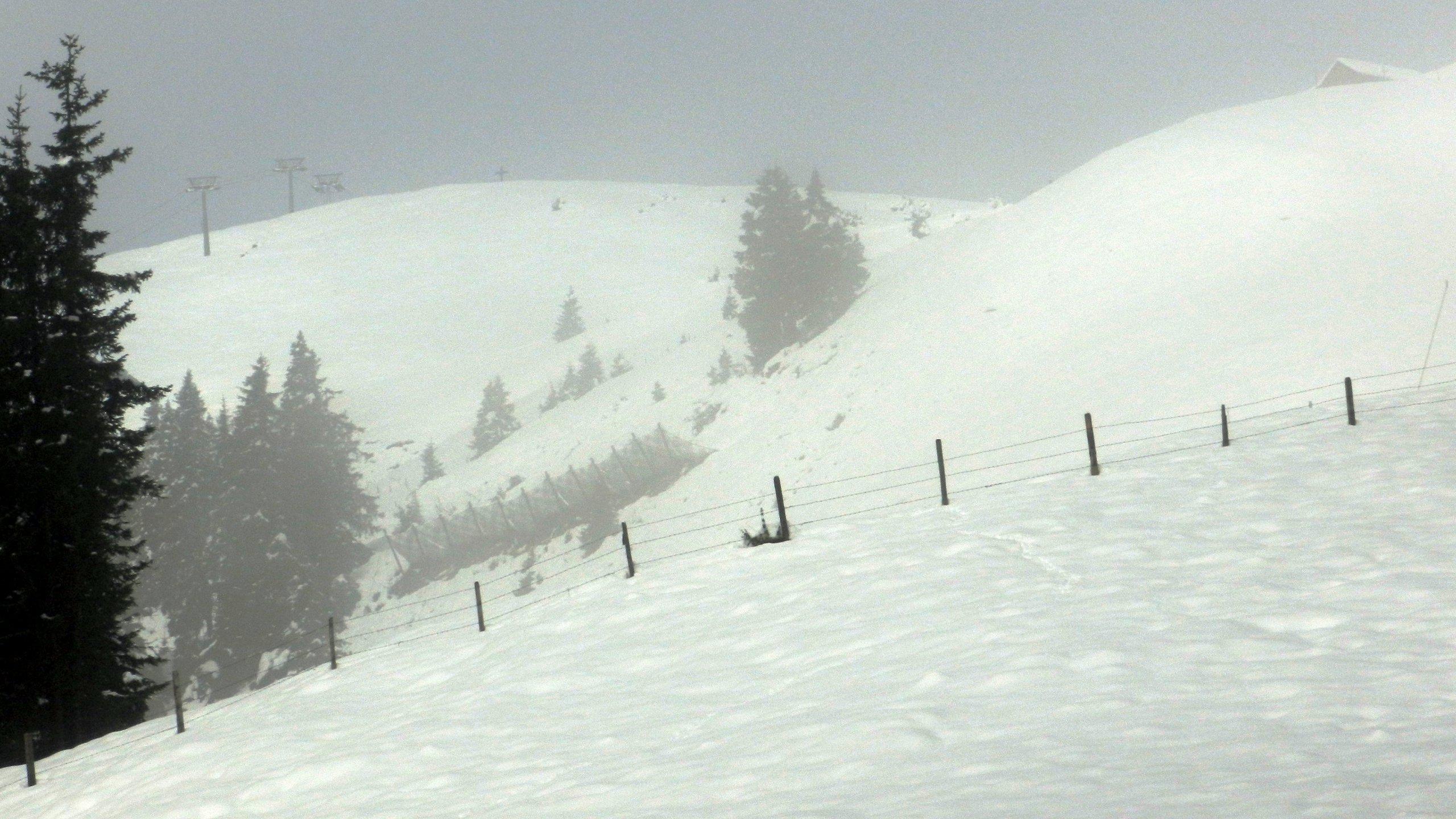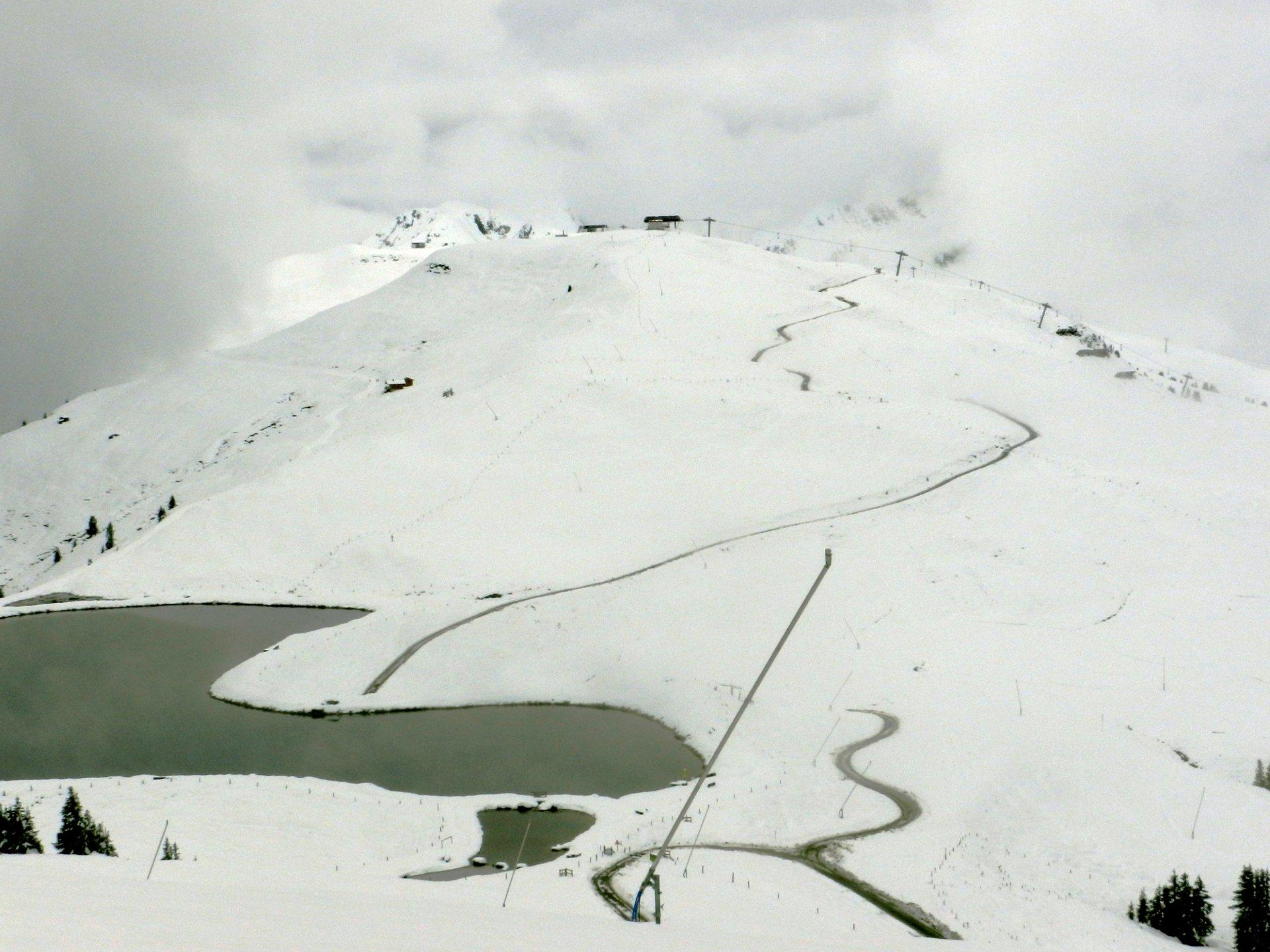 Auf etwa 1350 m 20 cm Schnee. Oben 40 cm. Natürlich pappig, beim Abfahren schiebt sich sofort ein Keil vor den Schuhen zusammen, der die Schi stoppt.