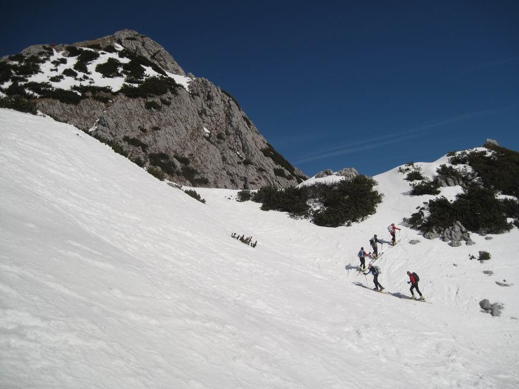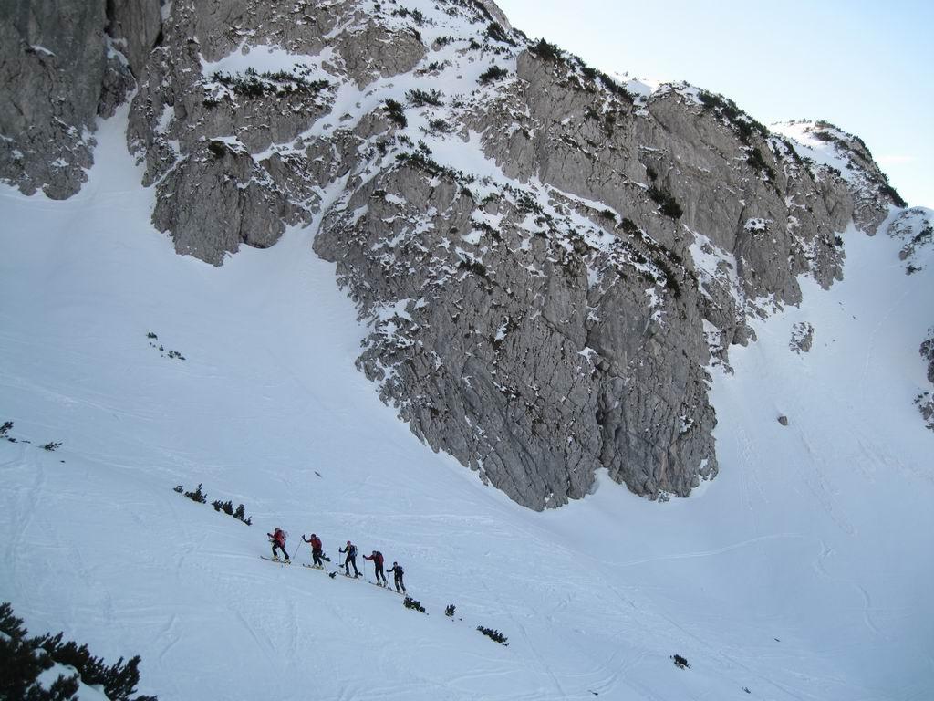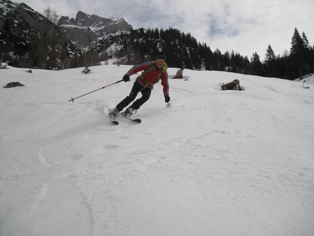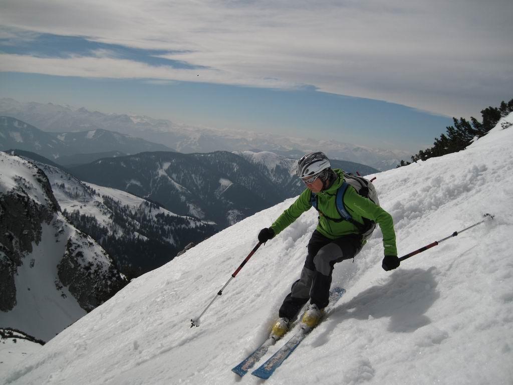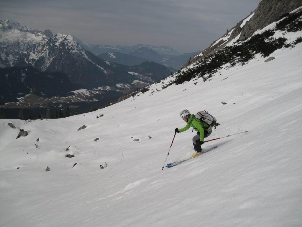 Heute steigen wir dem Strichkogel einmal von der anderen Seite aufs Haupt. Von Annaberg/Volksschule Gugg ein kurzes Stück entlang der Schipiste und danach weiter, eine Steilstufe überwindend ins Sulzkar. Durch dieses über gestufte Mulden bis kurz unter den Gipfel und die letzten Meter zu Fuß auf diesen. Am späteren Vormittag wie angekündigt Aufzug von dünner, hoher Bewölkung und kräftiger Südwind. Die Abfahrtsverhältnisse waren trotz geringer Schneelage ganz gut. Sulzig, weiter unten dann Firn.