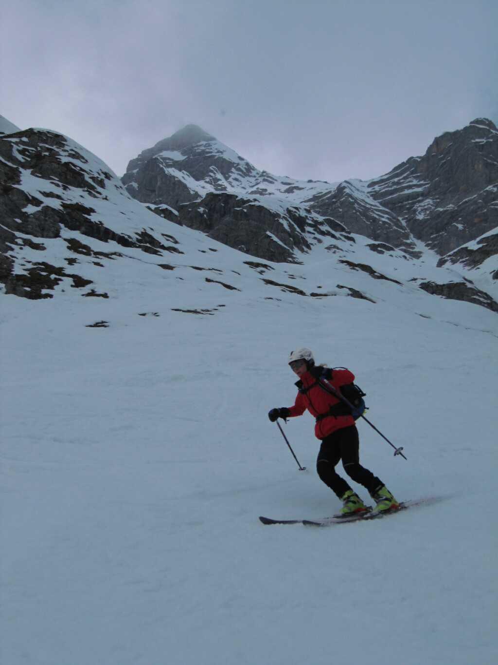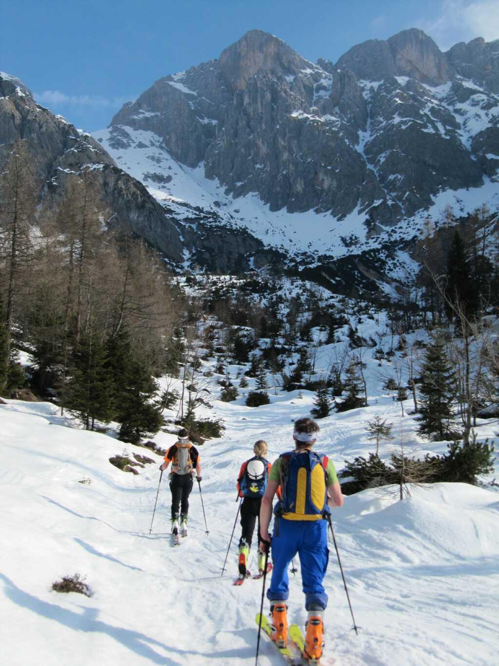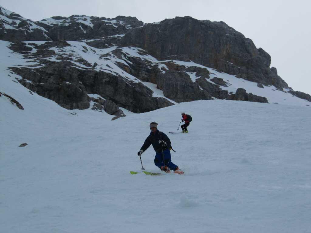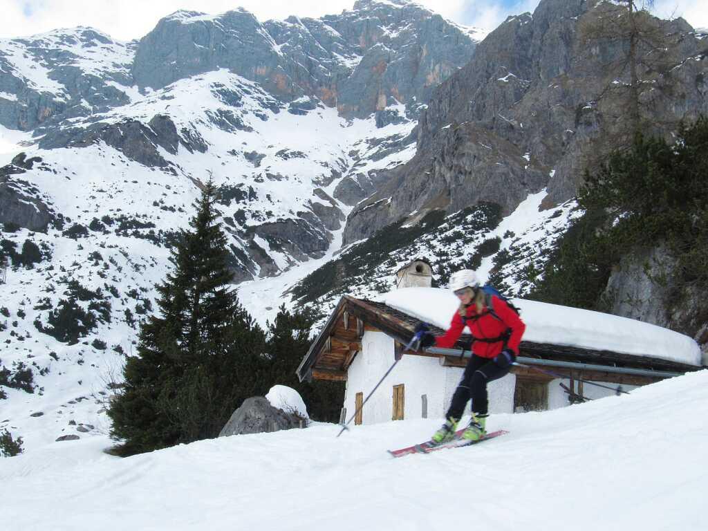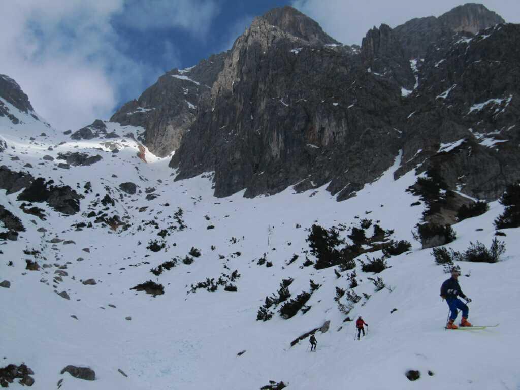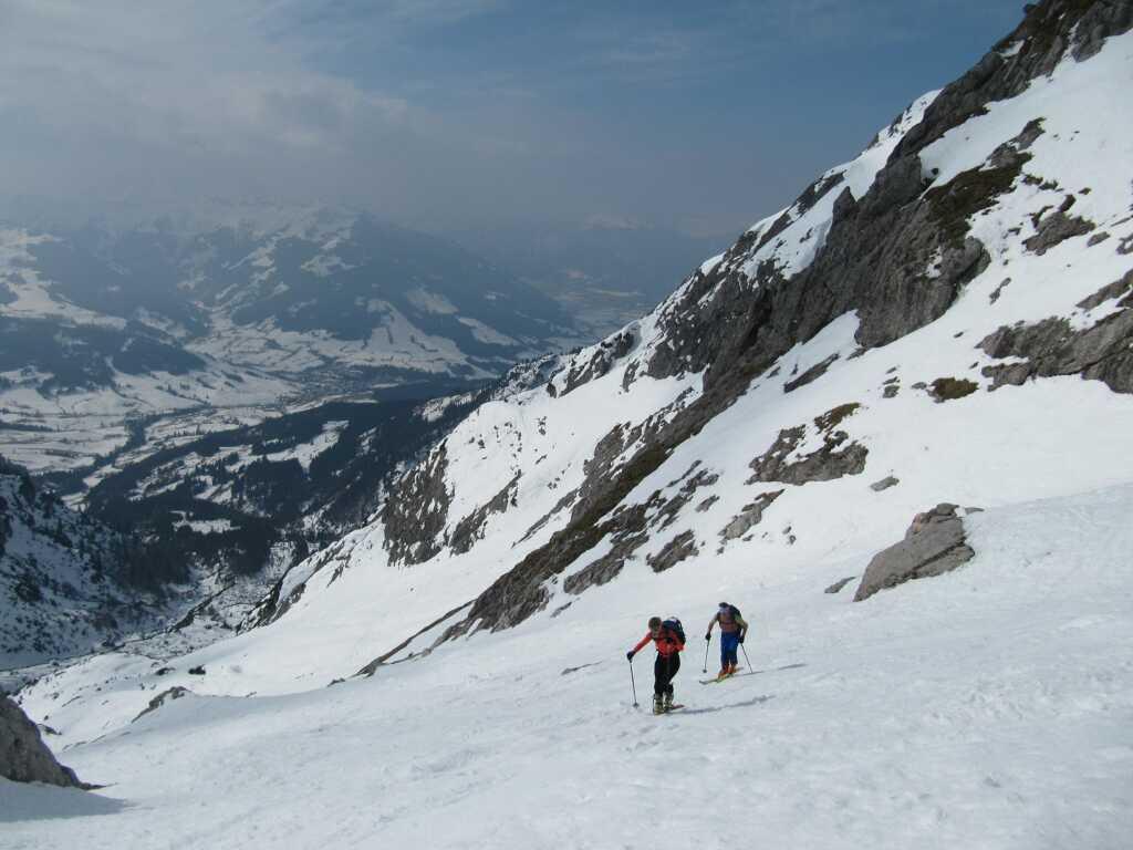 Von Maria Alm/Rohrmoos (900) über Kasereggkapelle (1049) und Freithofalm (1555) zur Buchauer Scharte (2269) und linkerhand hoch bis zu den Felsen (ca. 2400). Wetter: Anfangs heiter, gegen Mittag rel. stark bewölkt mit wenig Sonne, nachmittags wieder zunehmend aufheiternd, nur geringer Wind. Schneelage: Ski müssen bis ca. 1200m (Waldgrenze, ca. 30-40min) getragen werden, dann durchgehend ausreichende Schneedecke, im Bereich Freithofalm eingefahrener Latschenslalom; Abfahrt ca. 12:15, obere 200Hm noch etwas hart, darunter zunehmend firnig, insgesamt noch erstaunlich gute Abfahrtsverhältnisse bis zum Wasserfall (ca. 1170), Rest wieder Ski getragen.