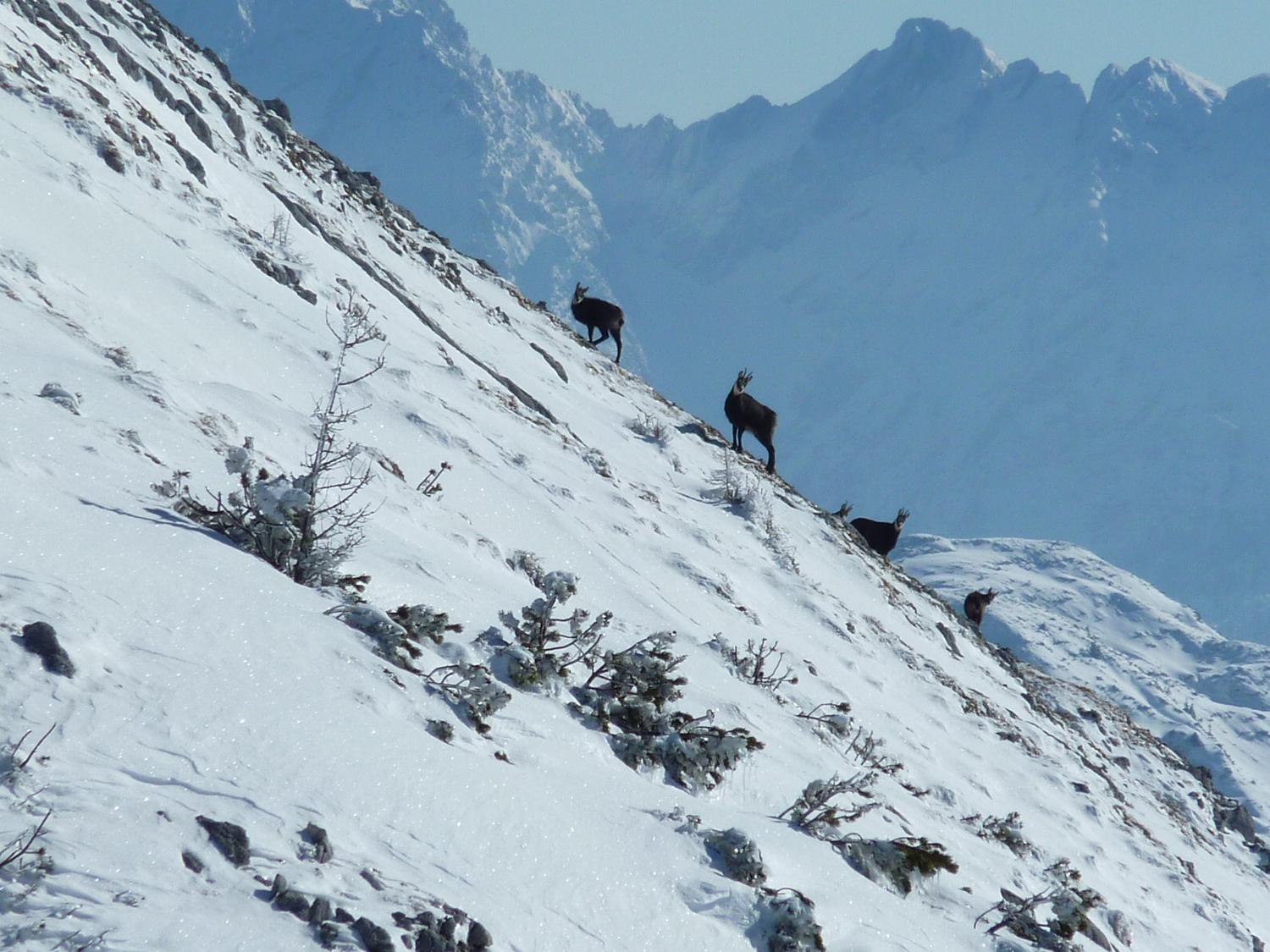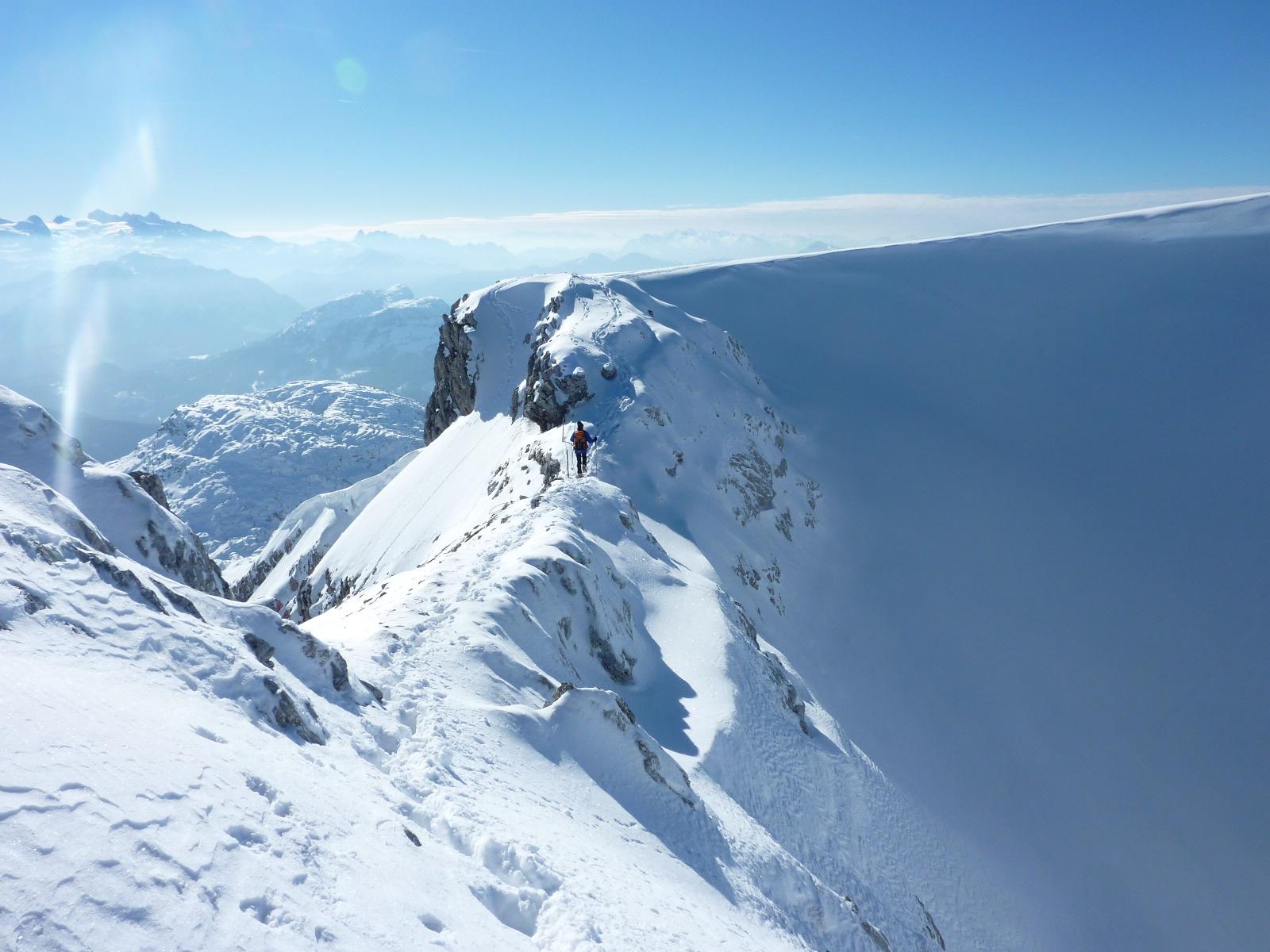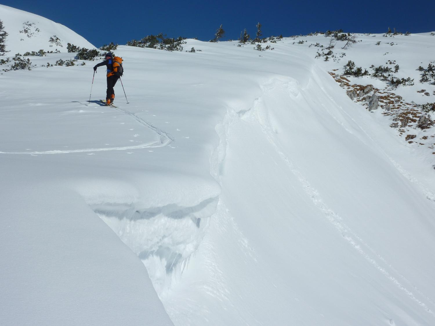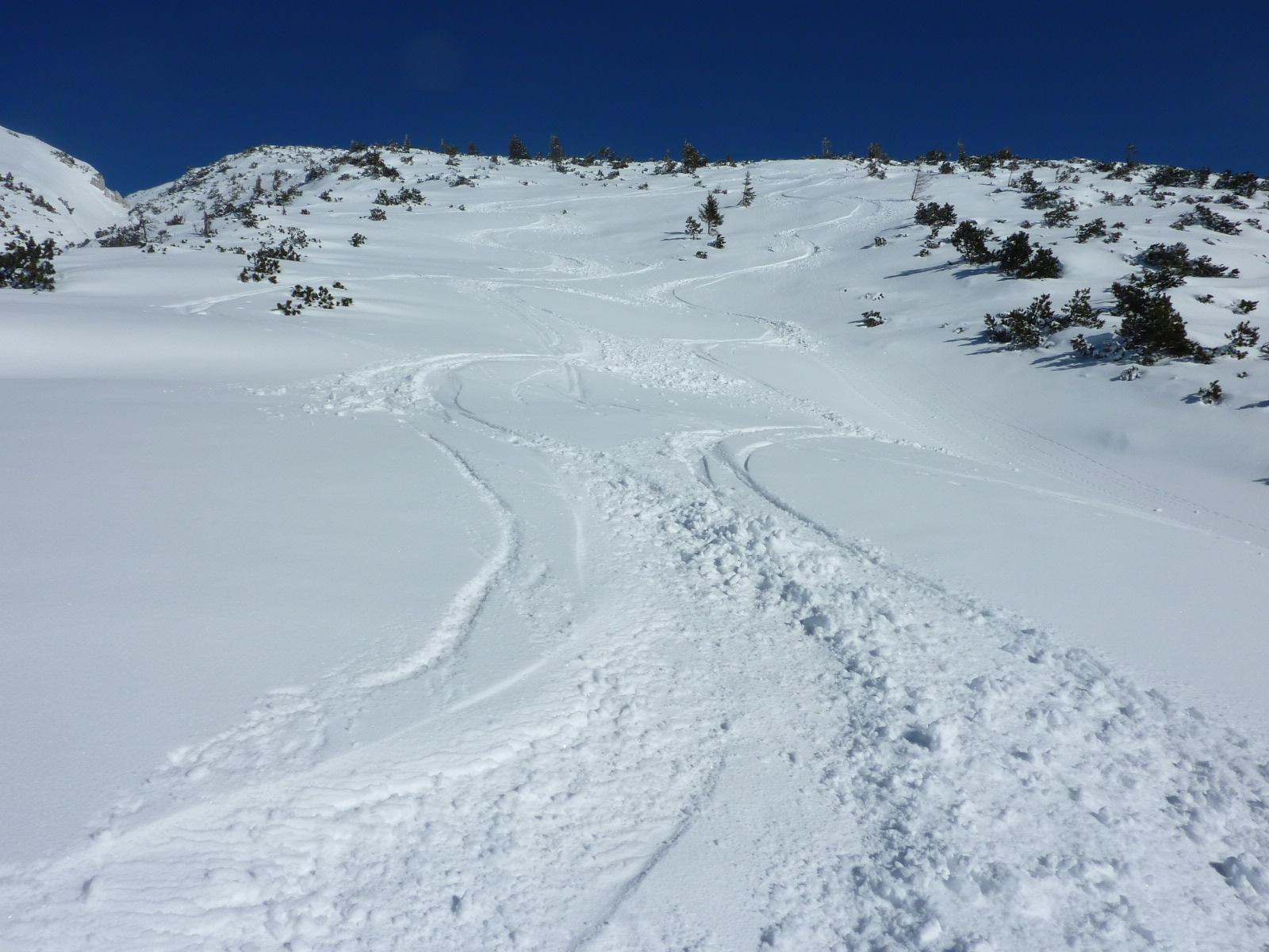 Ein traumhafter Tag, herrliche Bergkulisse, von Lawinengefahr keine Rede, vom letzten Schneefall (Samstag) schattseitig noch unberührter Pulver da, auch sonnseitig ohne Harsch noch herrlich zu fahren, und außer der Gamsbegleitung nur wir beide auf dem Berg - da werden die 1500 Hm zur Genußtour! Wie überall heuer auch auf dem Schönberg nicht zu viel Schnee. Es lassen sich aber zwischen den Latschen schöne Abfahrtsflächen und zwischenduch auch freie Hänge für schöne Schwünge finden.