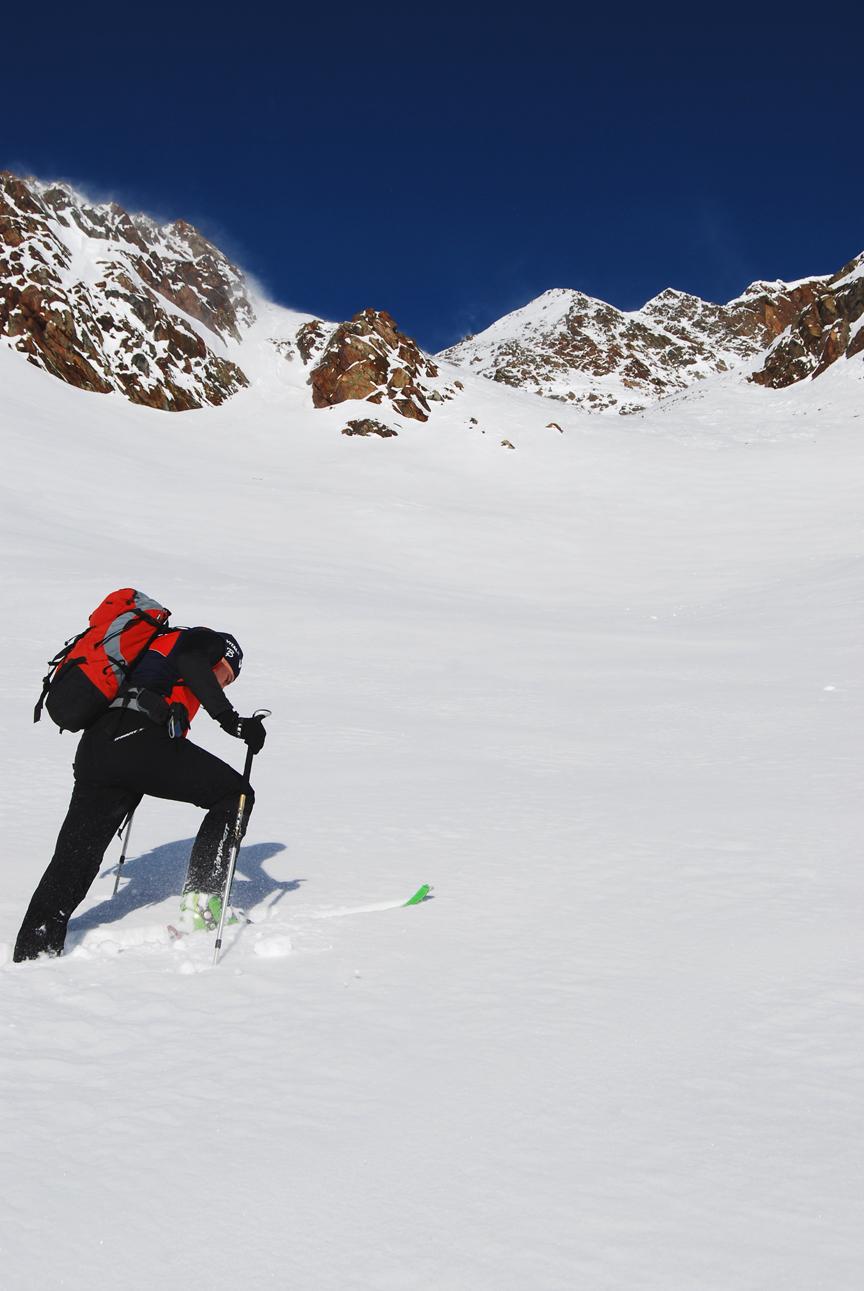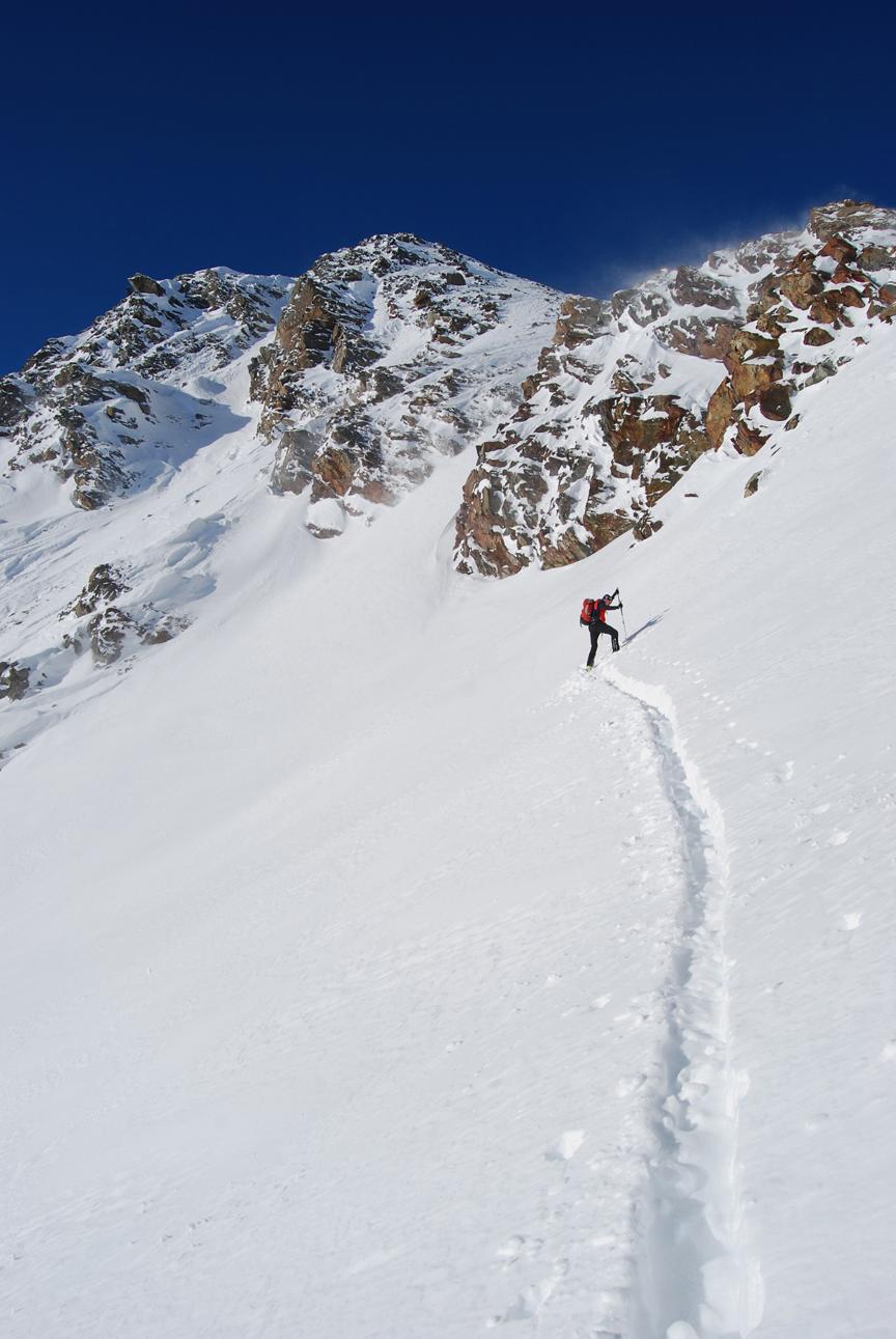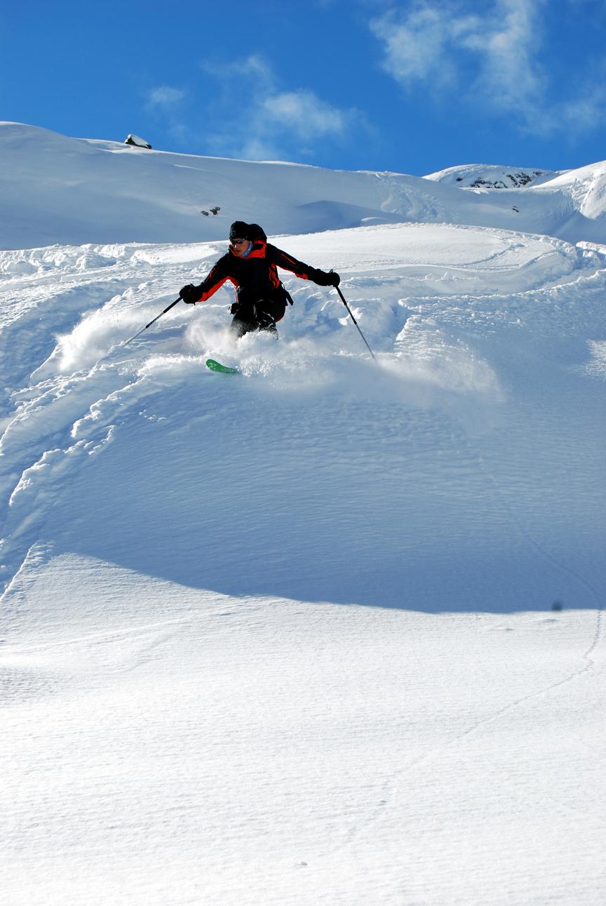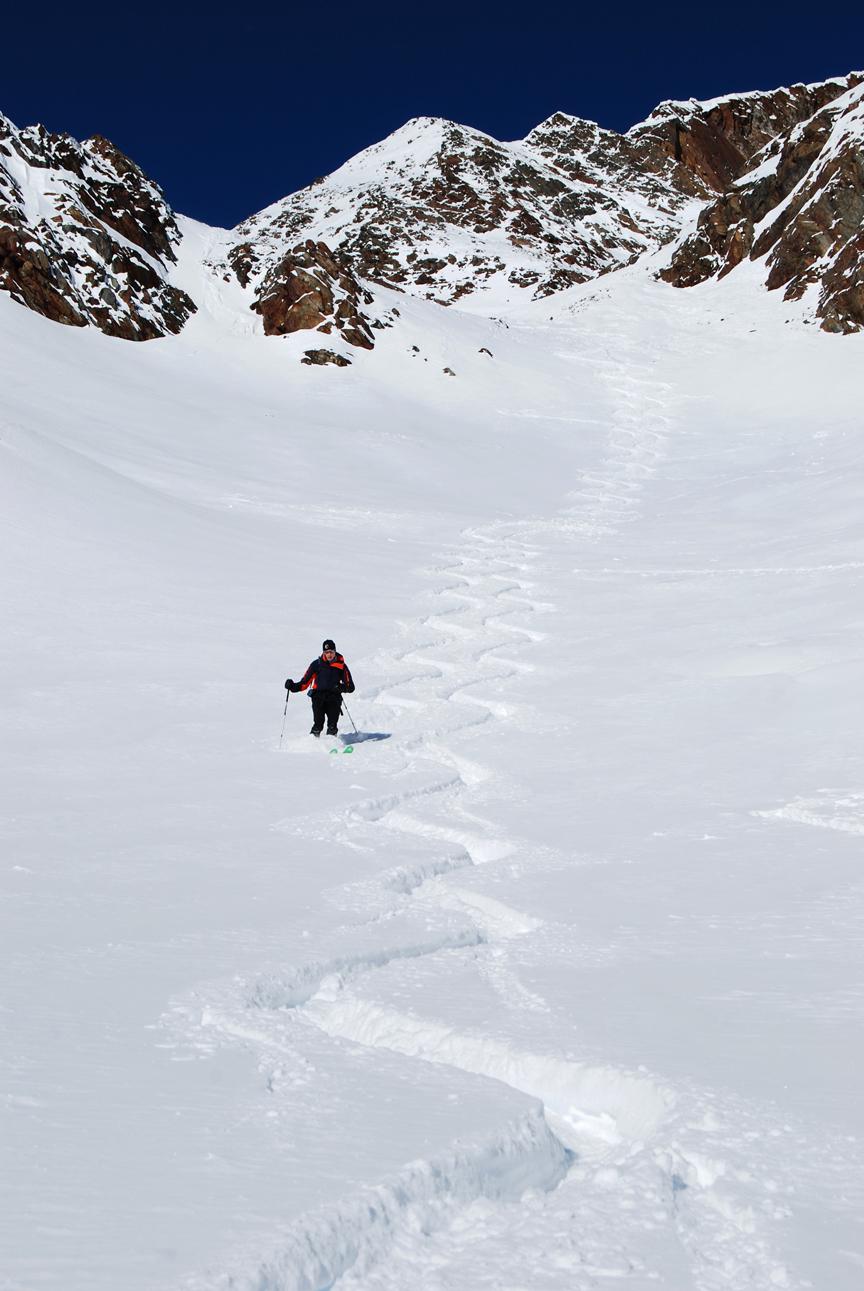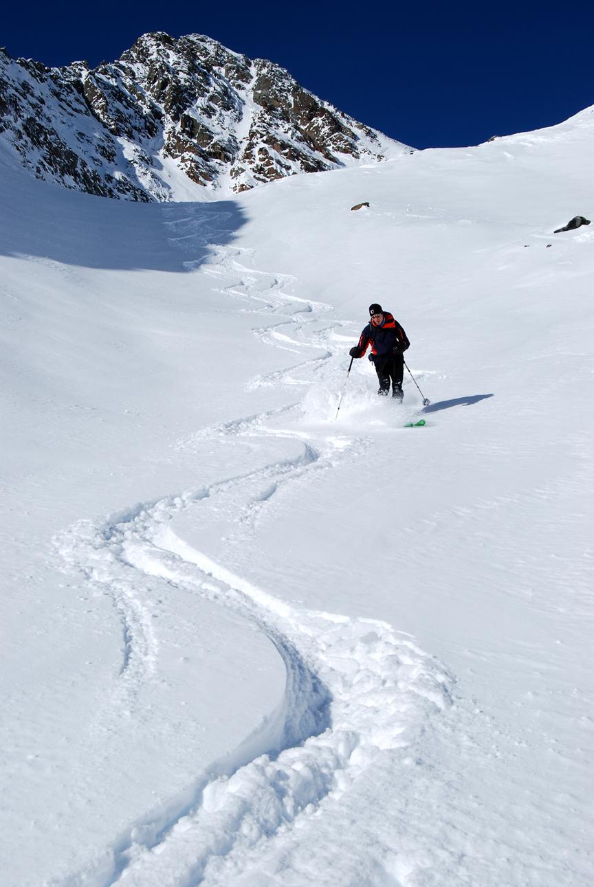 Unsere Tour startete am Gamsgarten und führte über eine schöne windgeschützte Mulde ins Daunjoch. Die Gipfelbesteigung brachen wir dann am Westrücken Richtung Grat wegen sehr viel grundlosem Schnee komplett ohne Unterlage ab und stiegen auf dem vom Daunjoch gegenüberliegenden Gipfel. Die Abfahrt über die windgeschützte Ostmulde Richtung Gamsgarten verlief im perfekten Pulverschnee. Wir fuhren über die Wilde Grube direkt zum Auto - Das wird im Oktober nicht oft möglich sein. Bei den ersten Hängen Richtung Wilde Grube haben wir ein paar Steine abbekommen ansonsten super Verhältnisse mit teilweise knietiefem Pulver bis zur Talstation.