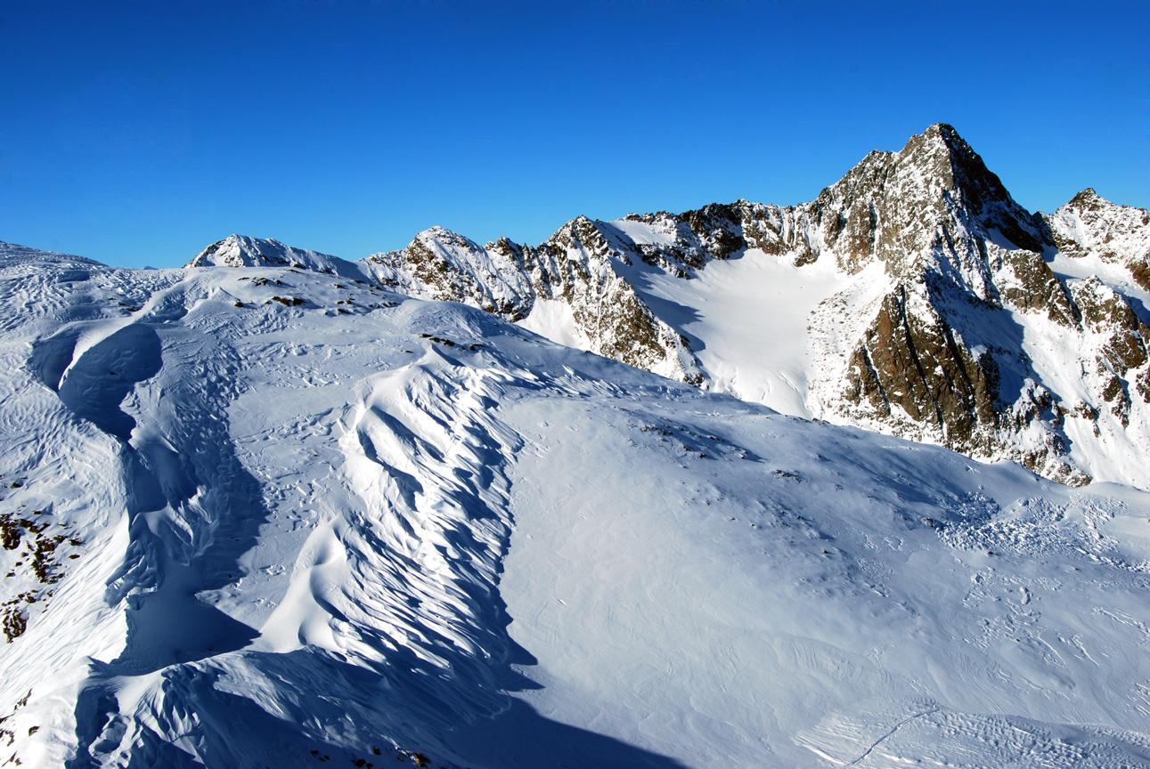 Schon an der Talstation der Stubaier Gletscherbahn liegt sehr viel Schnee, bei der späteren Abfahrt über die Wilde Grube z.T. sogar zu viel Pulver um so richtig in Fahrt zu kommen.