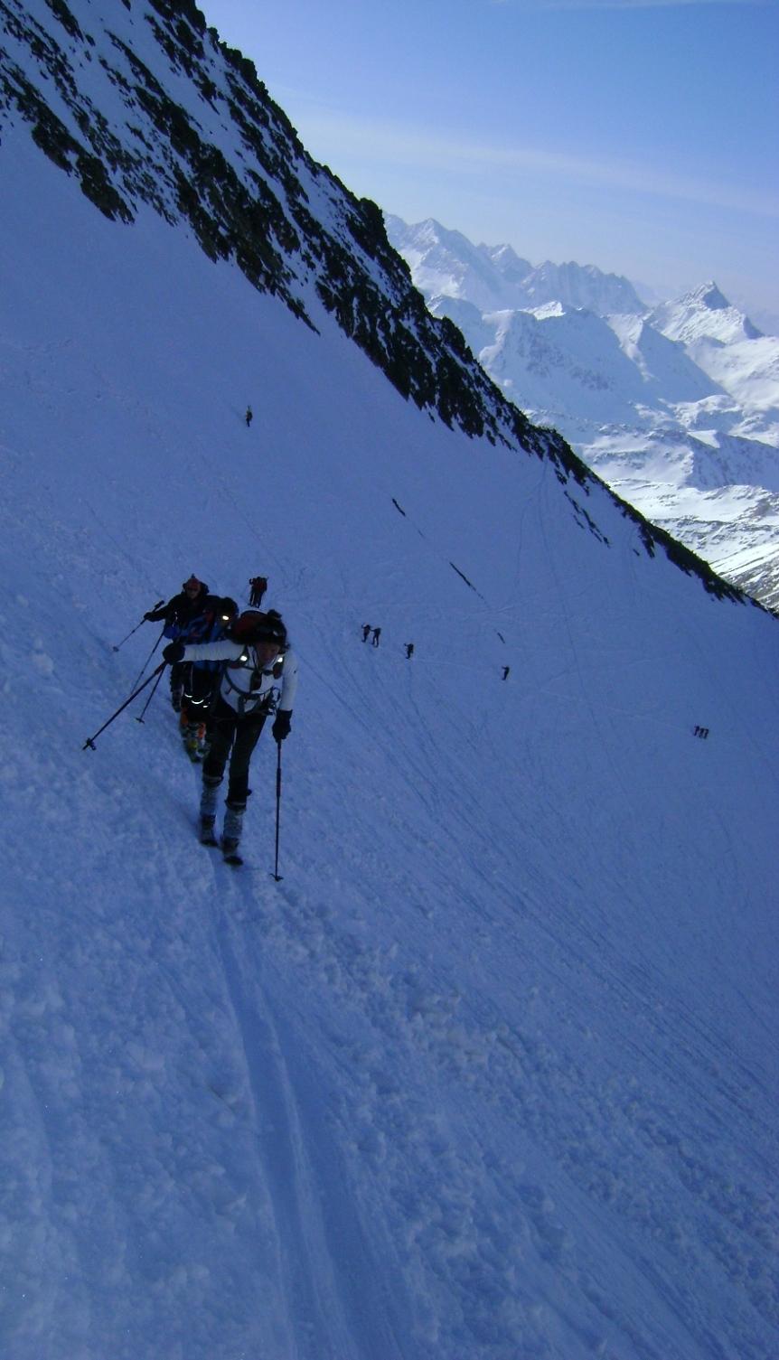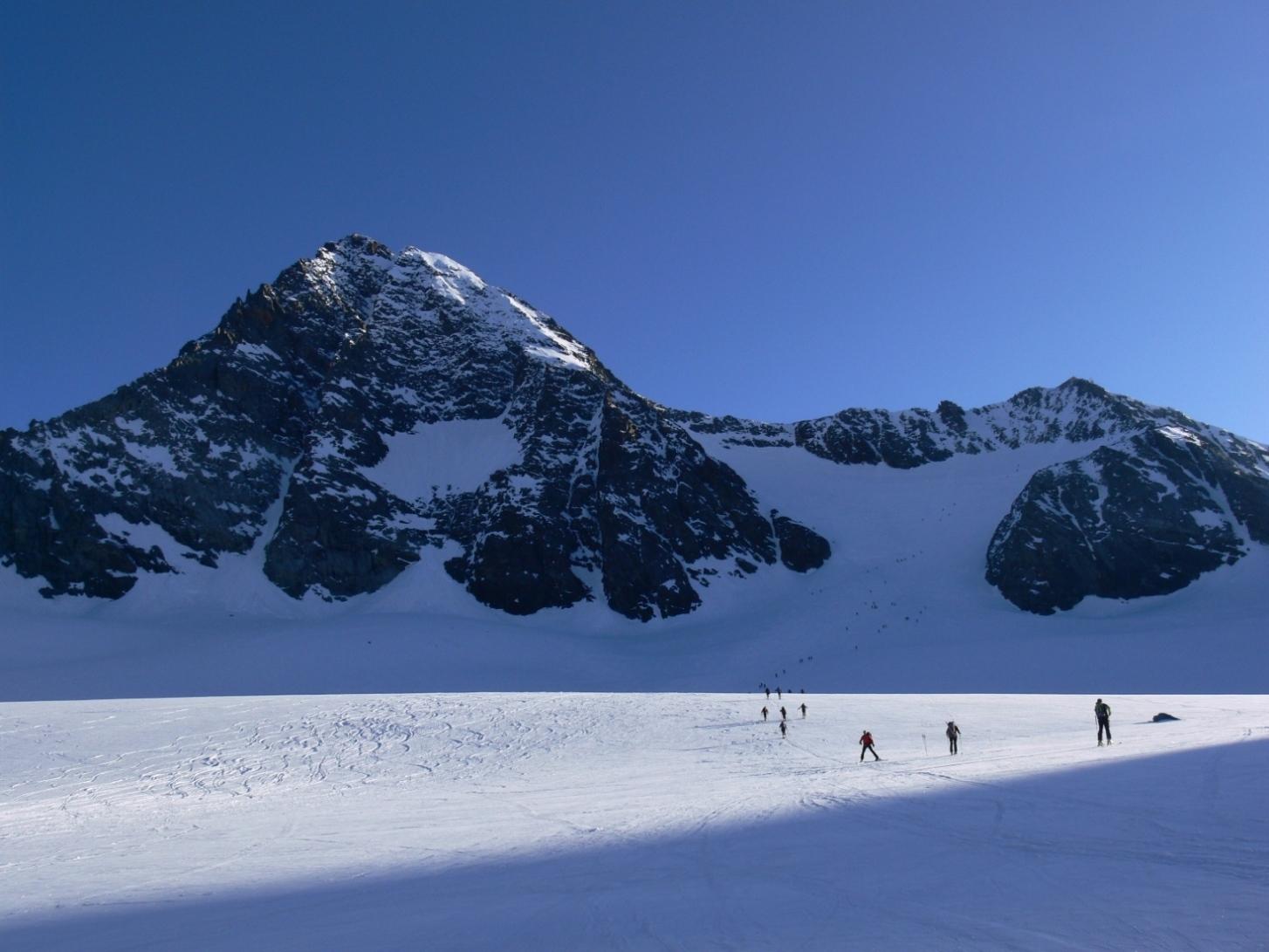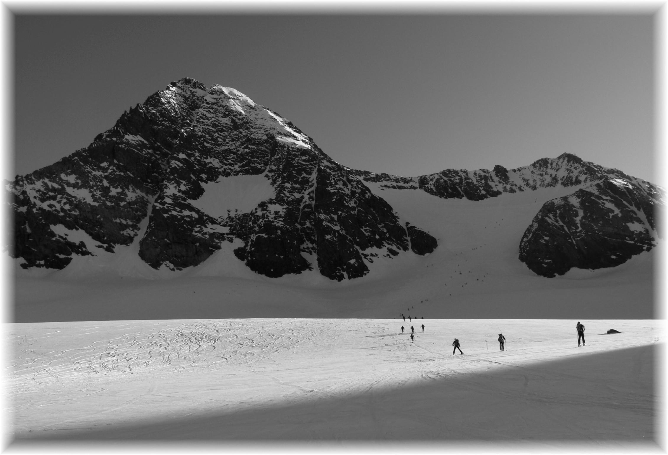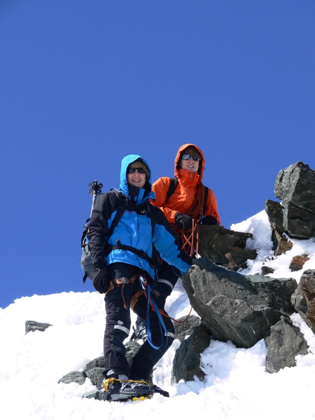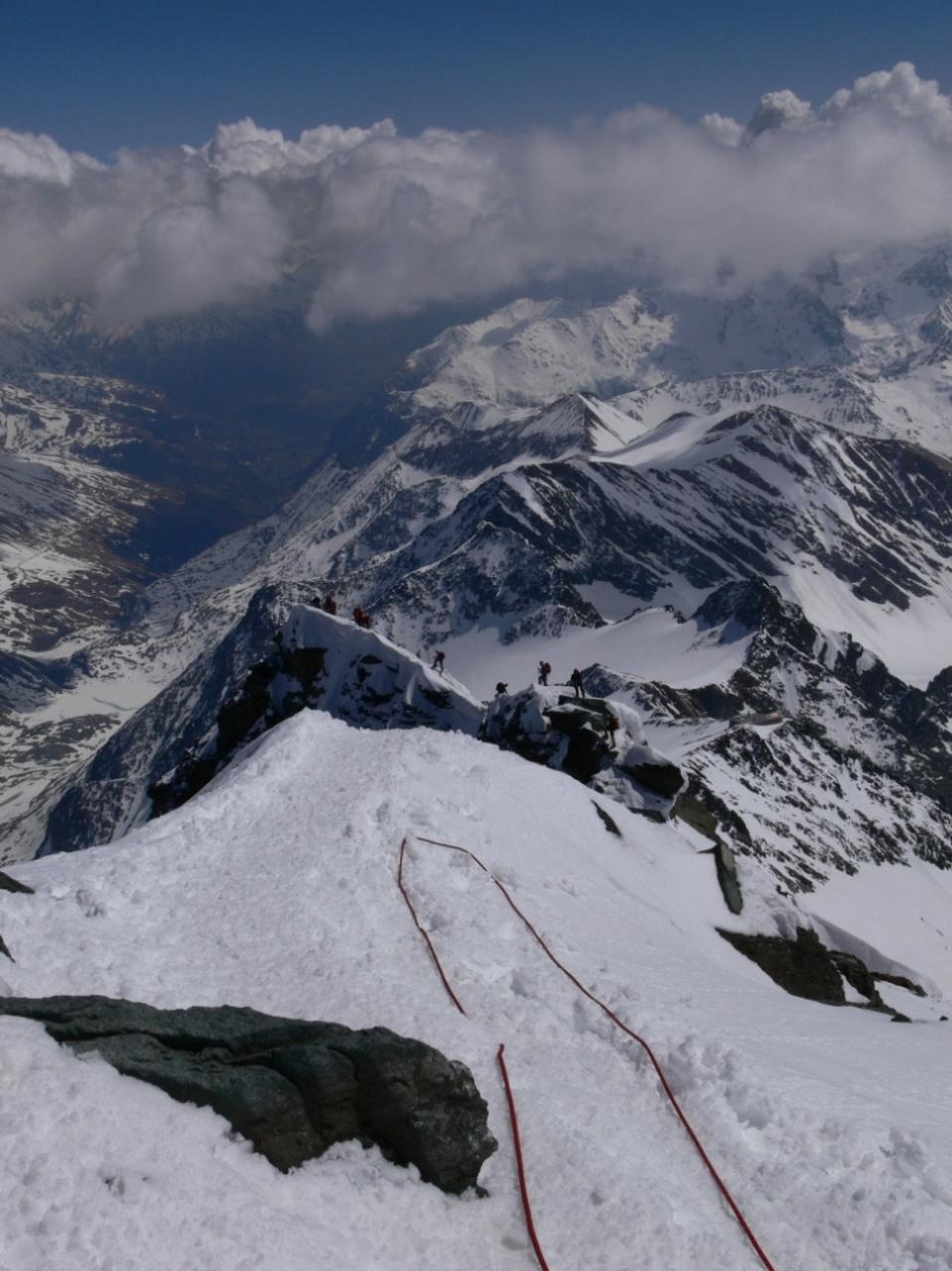 Beste Aufstiegs- und Abfahrtsbedingungen: über das Ködnitzkees Harscheisen empfehlenswert, der Glocknergrat gut zu begehen (nicht eisig), am Gipfel warm und windstill. Die Abfahrt - wie zu erwarten - sehr sulzig.