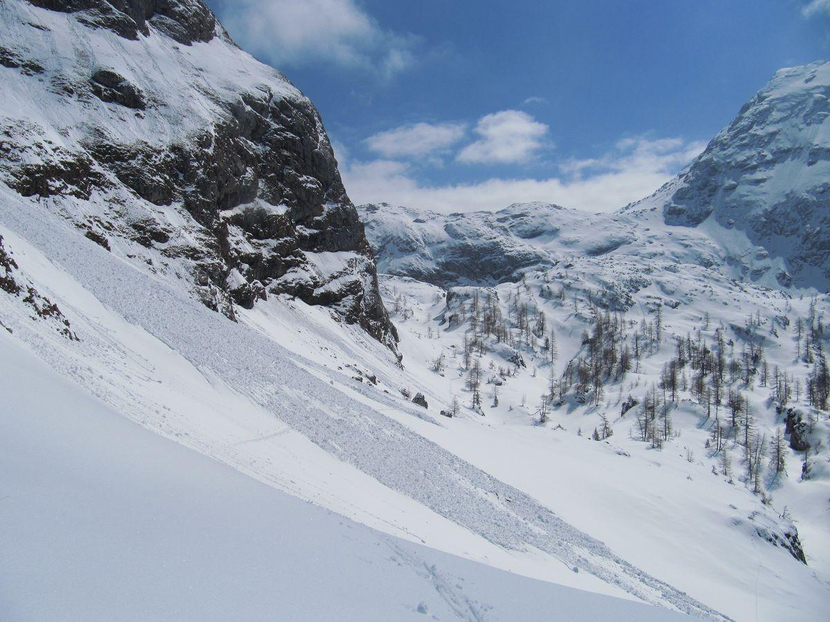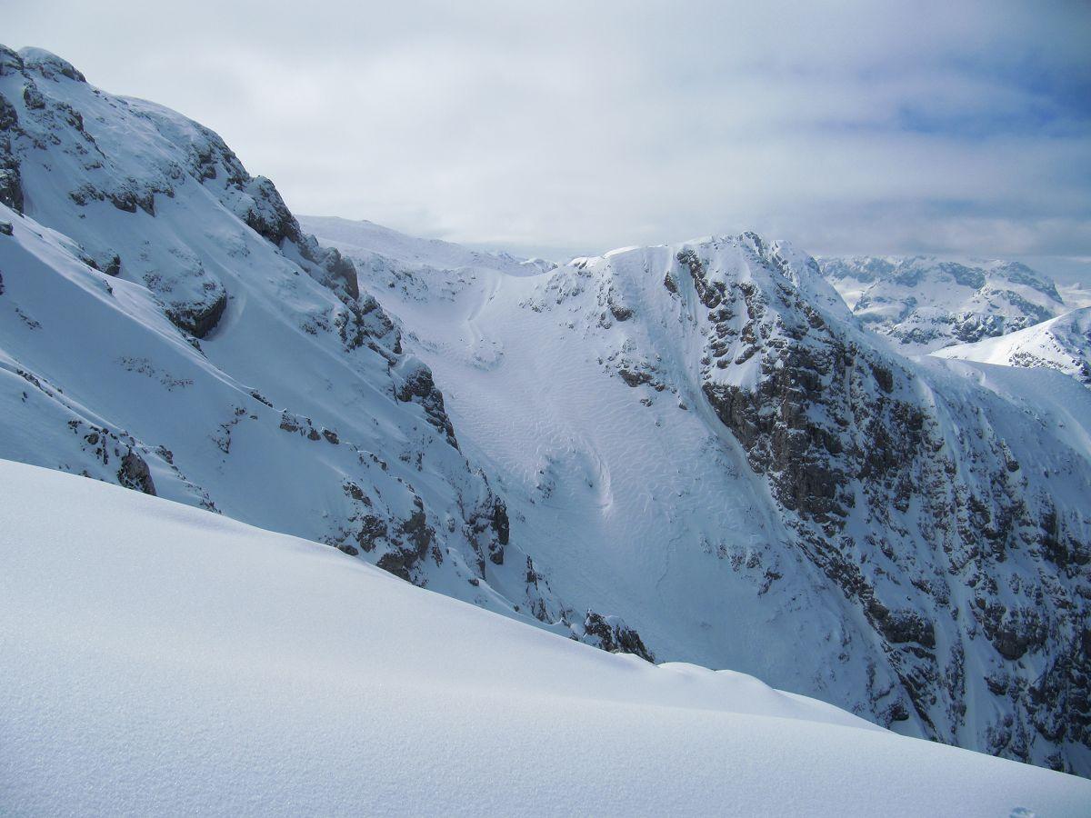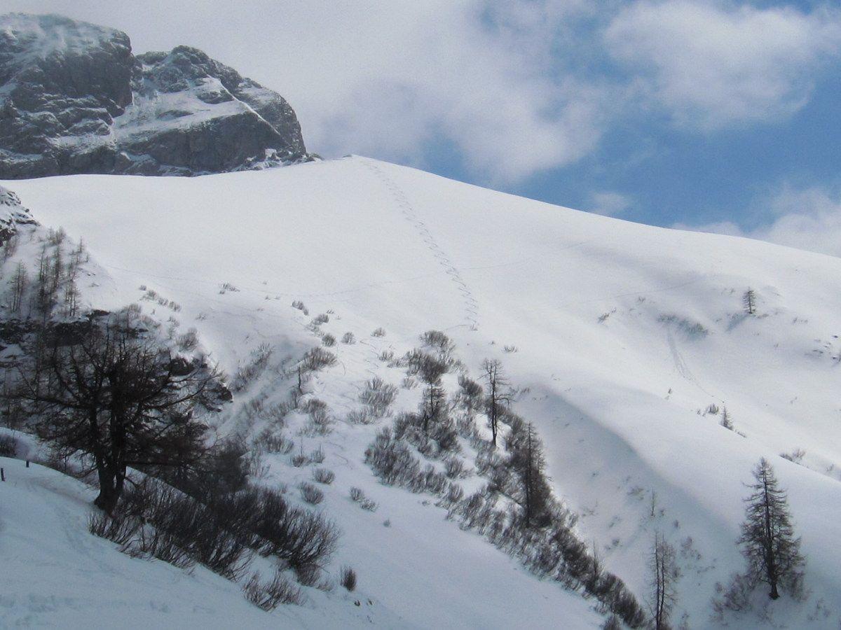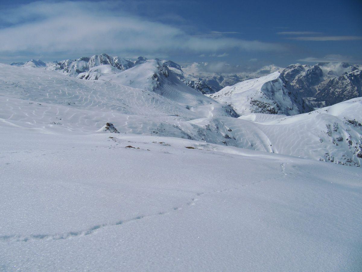 Selten, daß die Kleine Reibn nicht gespurt ist. Ab Schneibstein war ich ganz alleine. Die Windgangeln waren weich und störten kaum bei der Abfahrt und bei den Querungen. Vorsicht war dennoch geboten, denn ab und zu verdeckte die Neuschneeauflage nur notdürftig die Steine. Lockerschneerutschen konnten mit ruhigem Gewissen gequert werden, auch die vor den Hohen Roßfeldern. Die Abfahrt an den Rossfeldern: 30 cm Neuschnee, nur Wildspuren, keine Aufstiegs- oder Abfahrtsspur. Um die Ski nicht weit tragen zu müssen, Gegenanstieg auf den Jennergipfel und Abfahrt durch den Spinnengraben bis Talstation Krautkaserlift. Ski mußten hin und zurück (Hinterbrand-PP) nur je ¼ Stunde getragen werden, deshalb: immer noch eine lohnende Skitour ohne weite Anfahrt!
