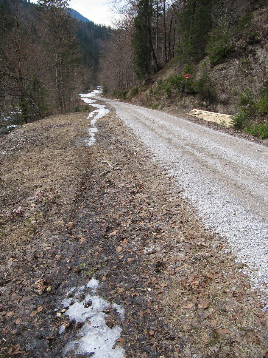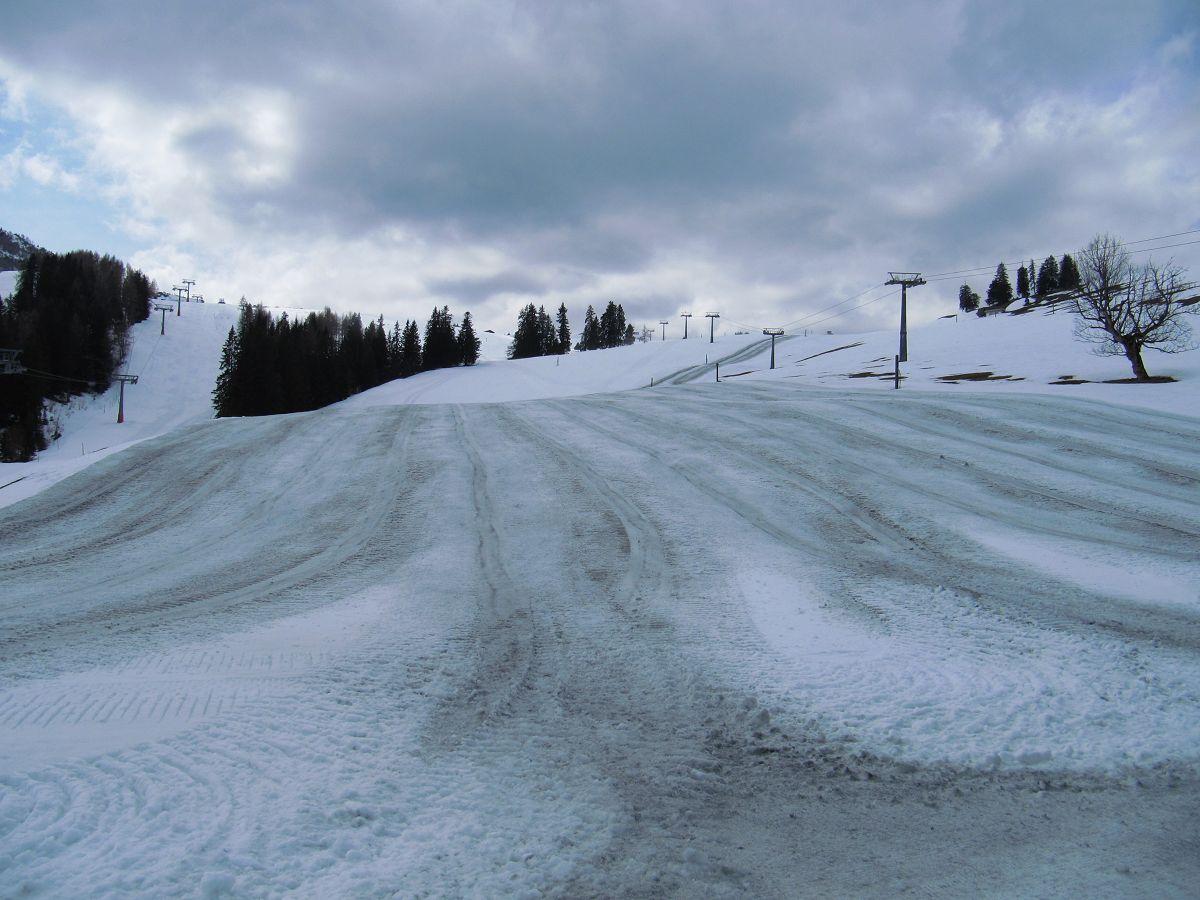 Zur Steinplatte / Kammerköhr am Dienstag, siehe die beiden letzten Bilder: man hat auf den Skipisten Kunstdünger gestreut, bei der Möseralm gibt’s trotz aufgezogener Fahne vom Wirt kein Bier, hat diesen Winter genug verdient. Abfahrt mit 5 – 10 min. Skitragen bis PP Seegatterl.