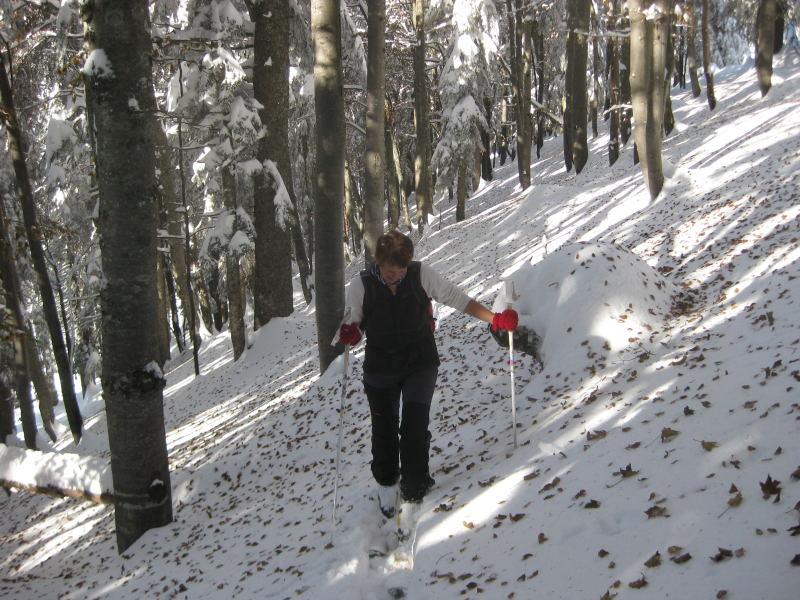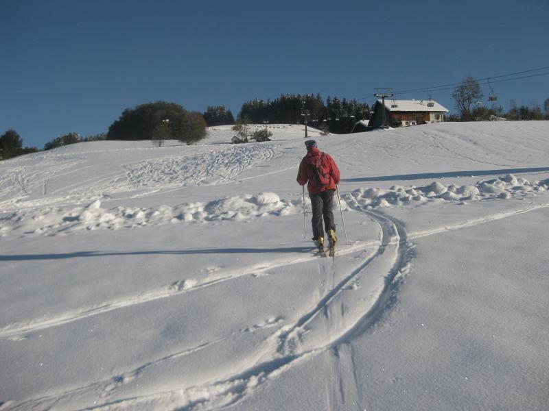 Es liegt genügend gesetzter, zerfurchter und vormittags gefrorener Schnee - alles vorhanden: tragender Harsch, Bruchharsch, Eisunterlage, ein wenig "Firn", homöopathisch Pulver (hinterm Baum). Die freudigen Pulverspuren des grauen kalten Wochenendes sind an diesem herrlichen Altweibersommerdienstag zu erahnen.