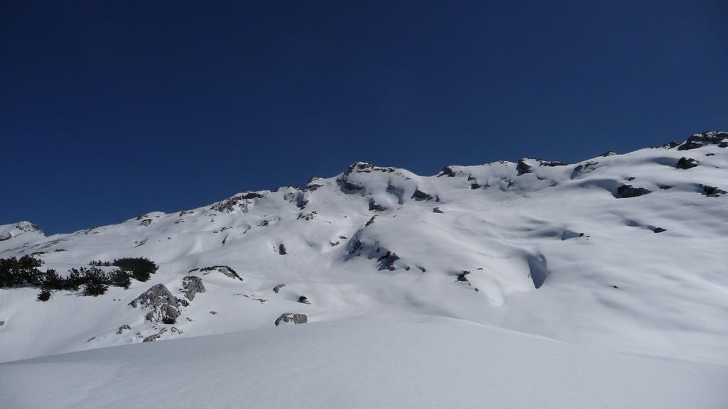 Von Pürzlbach mit dem Radl bis auf ca. 1350. Hier beginnt auf der Forststraße die Schneedecke. An den Südhängen des Kühkranzl sieht man wunderschöne Krokusteppiche. Über die Kallbrunn-Almen weiter zum Diessbachsee. Am südlichen Ufer auf und ab bis zum östlichen Ende des Sees. In südöstlicher Richtung über Idealhänge, vorbei an einzelnen Zirben in Richtung Finsterbachkopf.